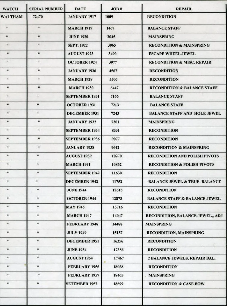 One of my favourite railroad standardpocket watches is a 16-size, 1908 model, 21-jewel Crescent Street Waltham that did service in the bib overalls of a CPR employee who wore this watch from 1917 until retirement in 1962. That s 45 years of service as his only watch. It was maintained by the same railroad watch inspector for about 40 of those years. When I acquired the watch, I noticed 32 repair numbers scribed inside the case back in tiny characters, all neatly in two rows. I was able to access this watch inspectors records to discover what had been done, and when. There is some value in watch repair marks permanently marked inside case backs. However, whatever floats your boat!