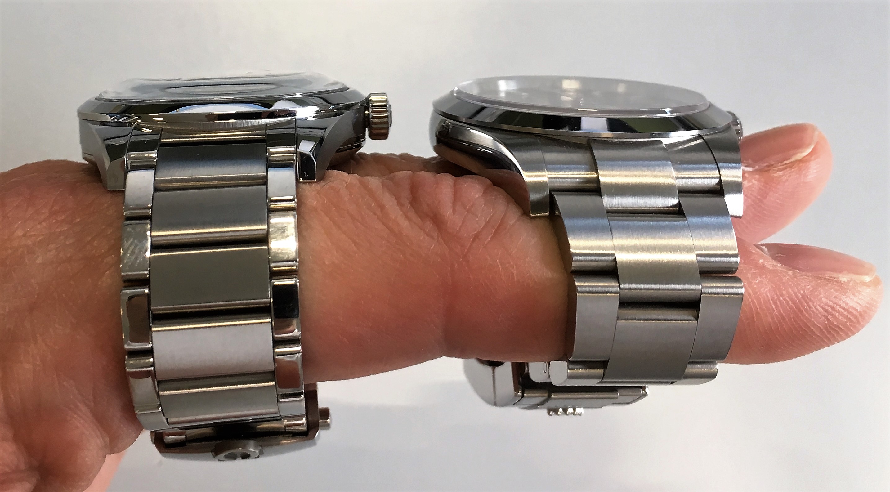 When you鈥檙e a looking for something smaller and thinner then it鈥檚 the Globemaster. With its 39mm diameter and its slim profile it鈥檚 a very versatile watch. Sporty with the bracelet, dressy with a strap. I have the OEM blue strap ordered in addition to the bracelet. The brown B&S isn鈥檛 the best fit but it鈥檚 the only picture I have which shows my GM from the side.
