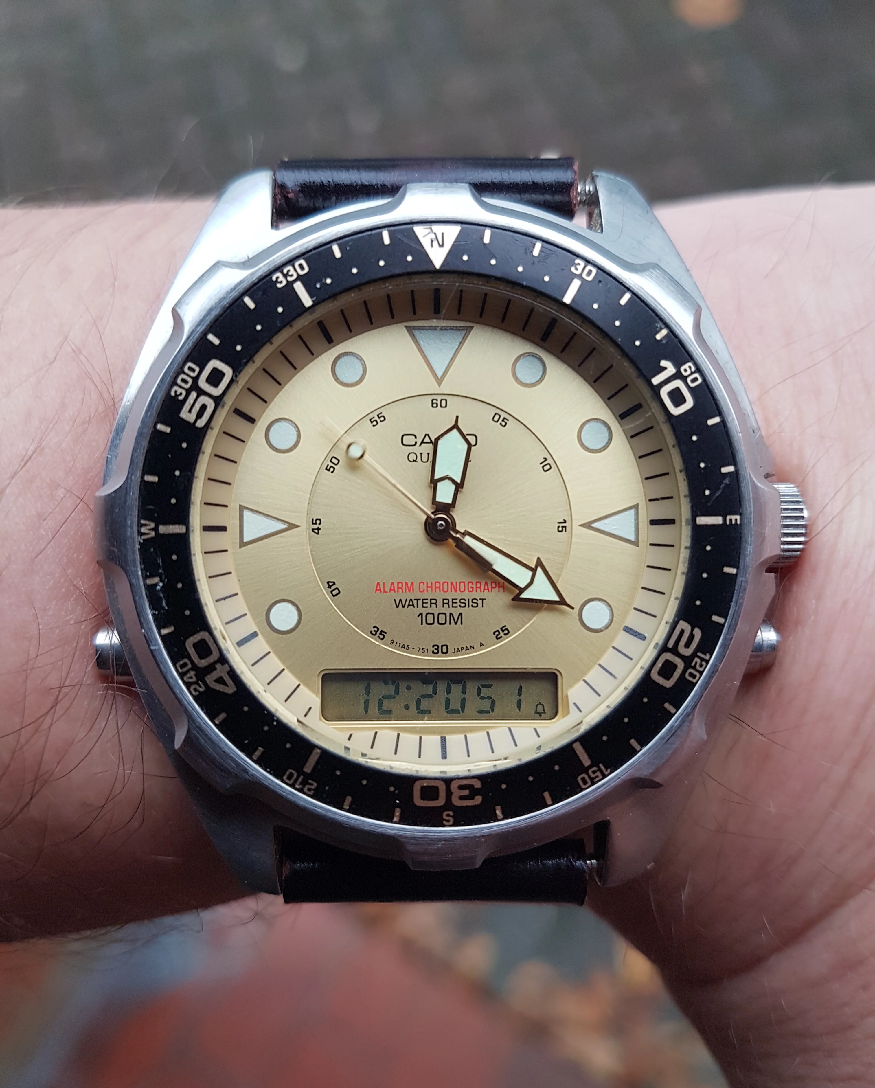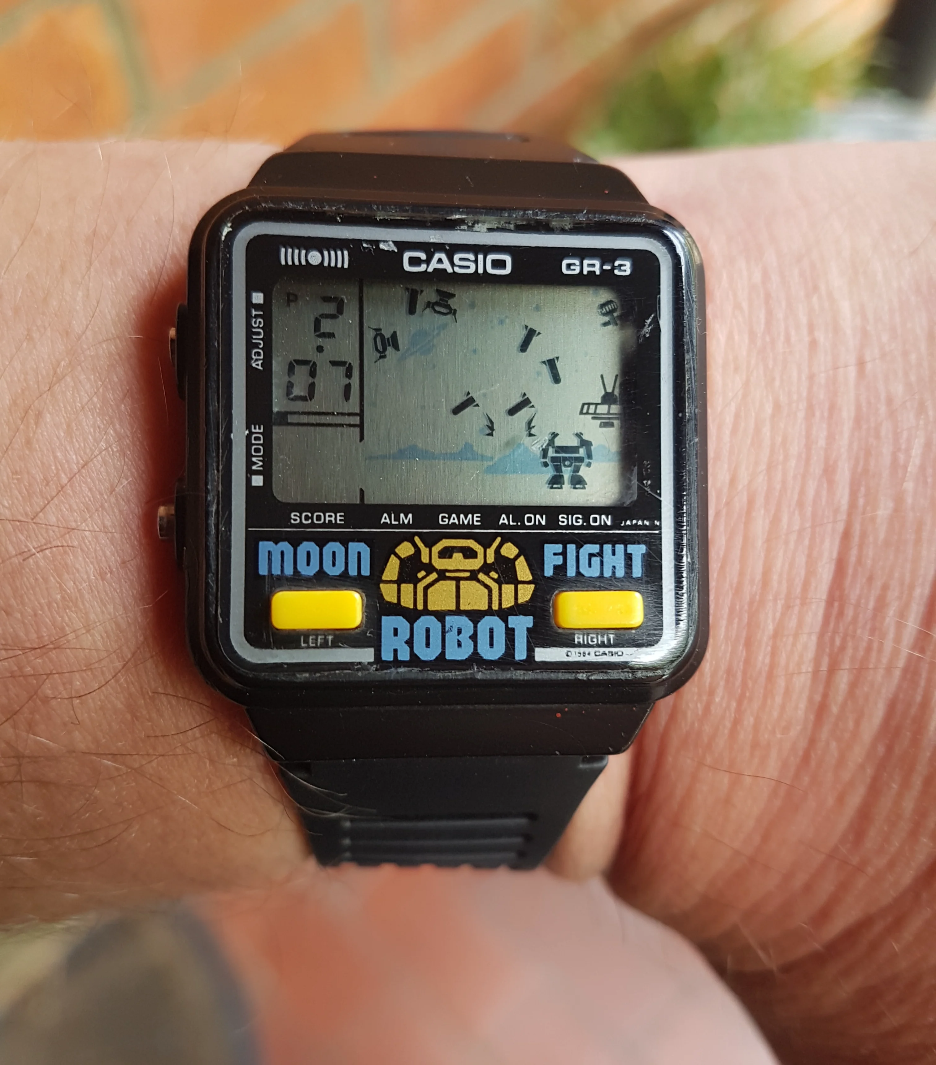 My first watch - Casio Moon Robot Fight bought from Argos in the UK in January '85 when I was 6. Approx £16.99 but dont expect to pay that now! This is a rebuy - I think I destroyed the original in the pool in the late 80's - probably around somewhere though. A bit beaten up but fully functional - the game is still suprisingly addictive. 😀
