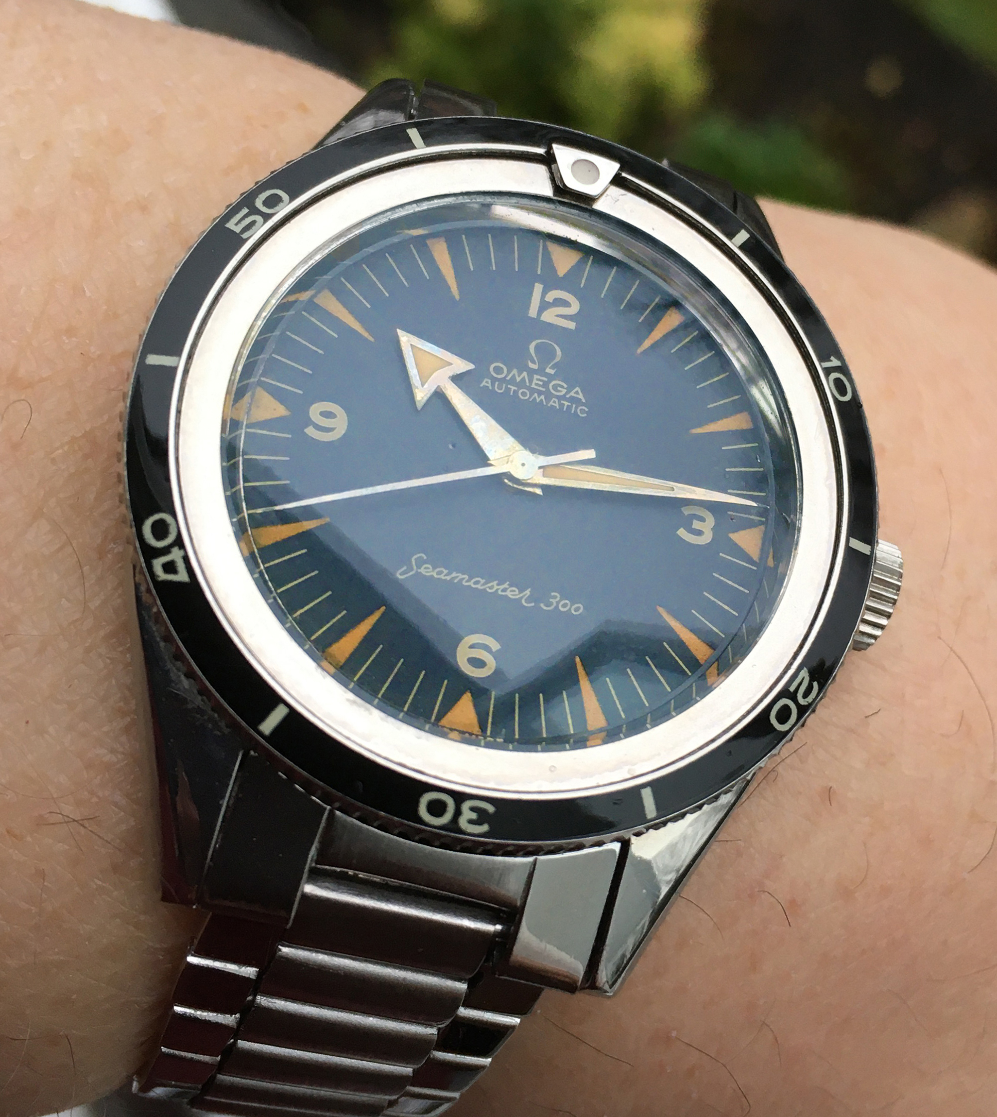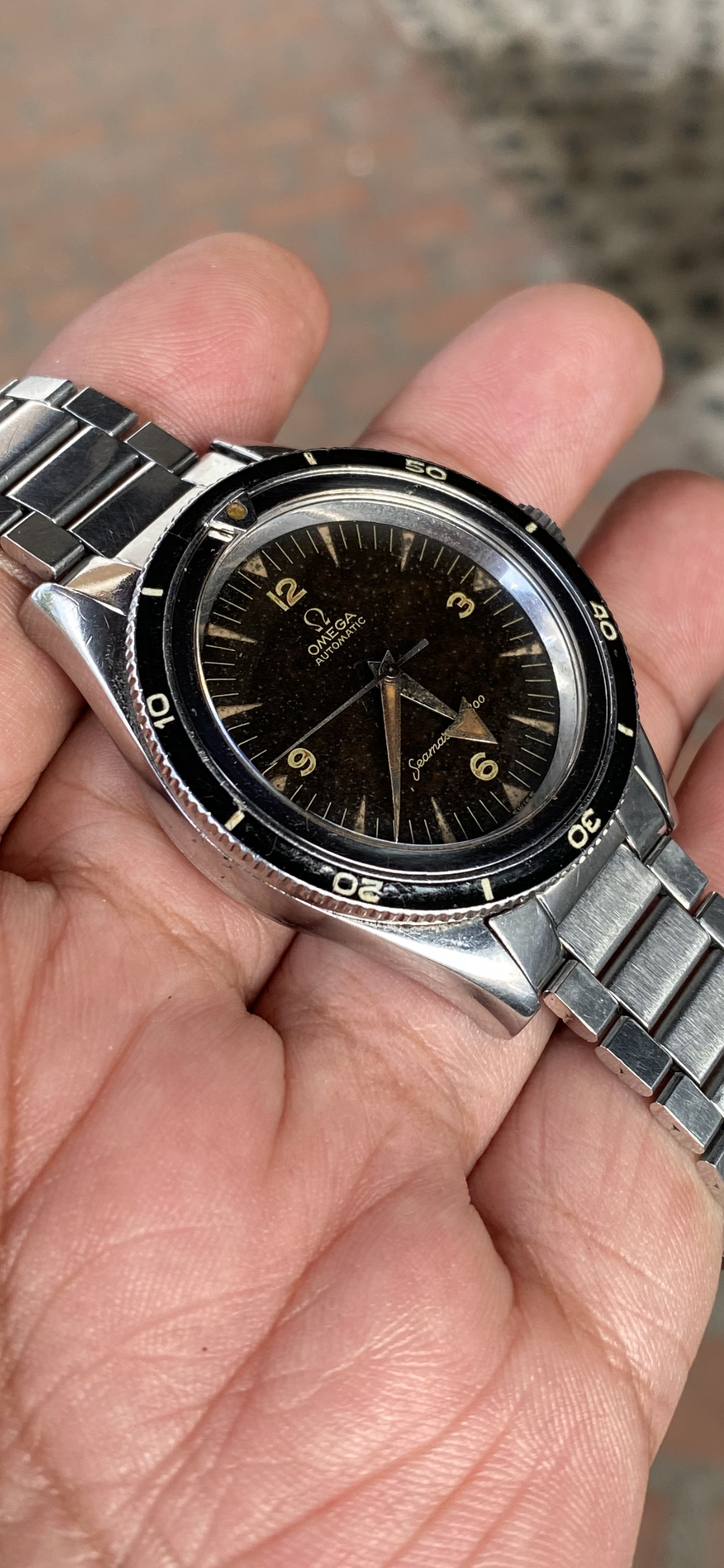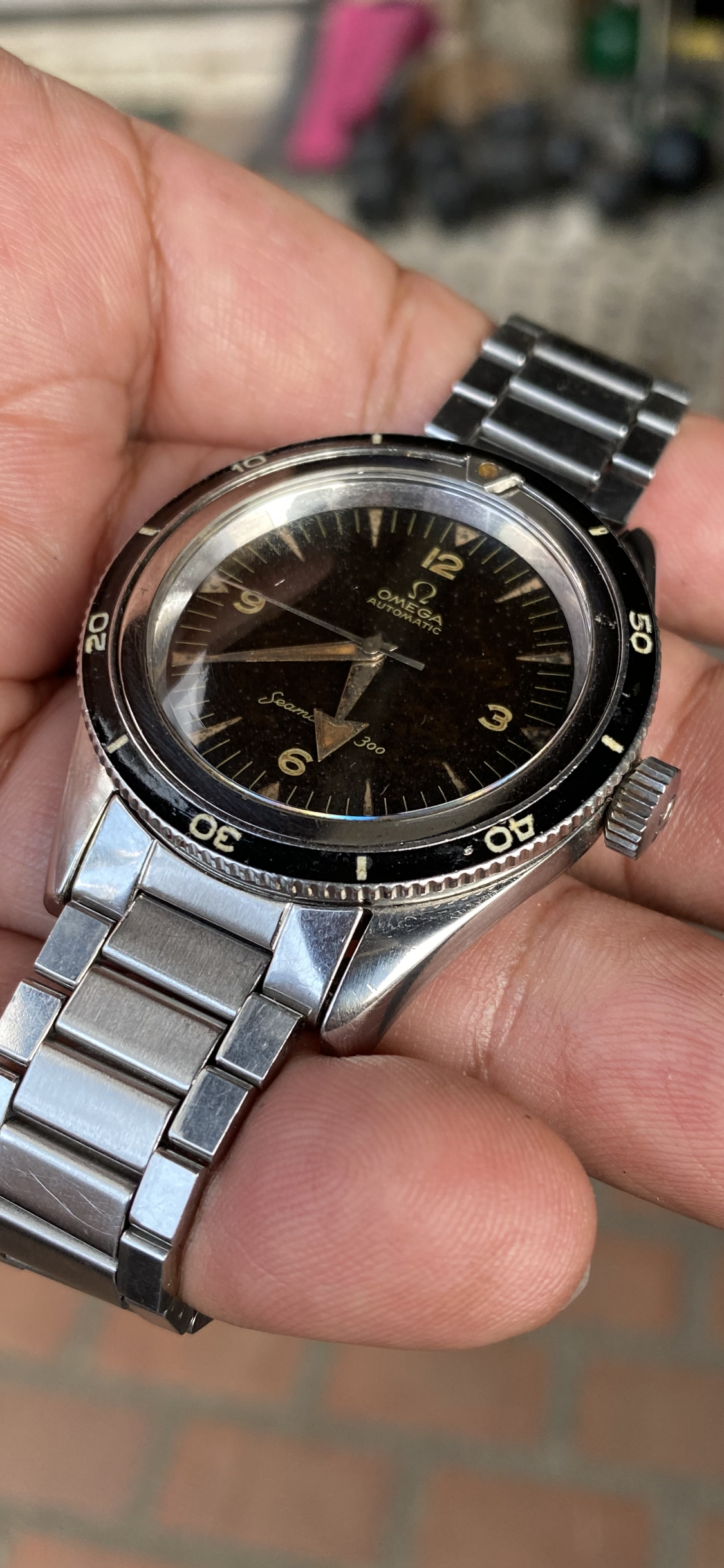 ·I just picked this up yesterday a beautiful 1958 Omega Seamaster 300 2913/4 with a nice tropical dial and very nice bakelite bezel insert. It also has the 7077 stretch bracelet but one of the endlink is not a number 6. Overall, the watch looks all original and unmolested. However, from what i read from an article about the 2913, the author mentioned that the 2913-4 should have a pointed hour hand and a small arrow minute hand. Is that statement accurate?