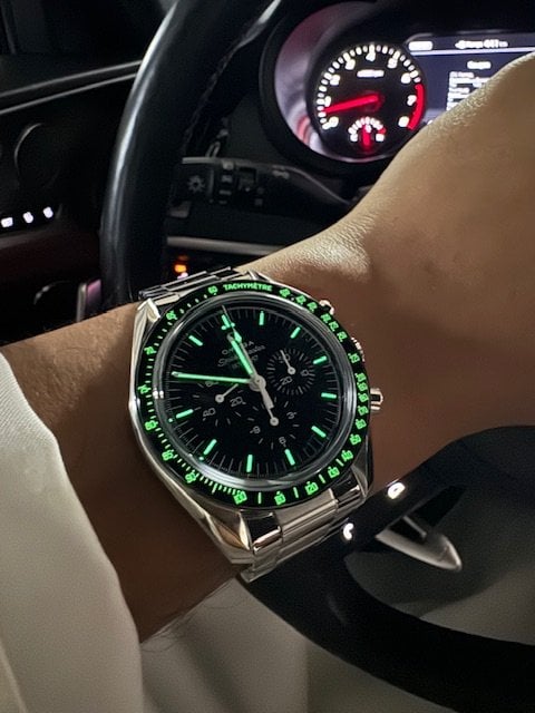 Really like the lume shot, can you post a couple more pics in regular light to see what the bezel looks like? Have a White Dial Speedie and think it might be worth doing the modification since it would work great with the dial and markers, but would like to see a few other pics prior to grabbing one and having it installed (I wouldn't want to screw it up) Here's mine on my recent Alaskan cruise.