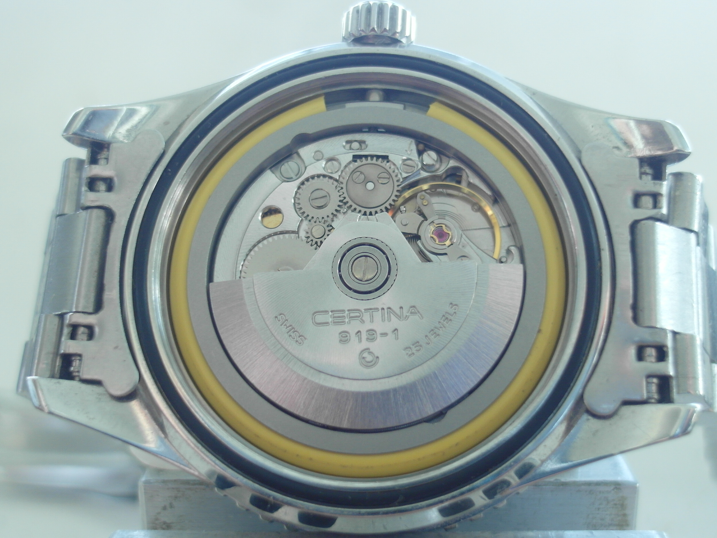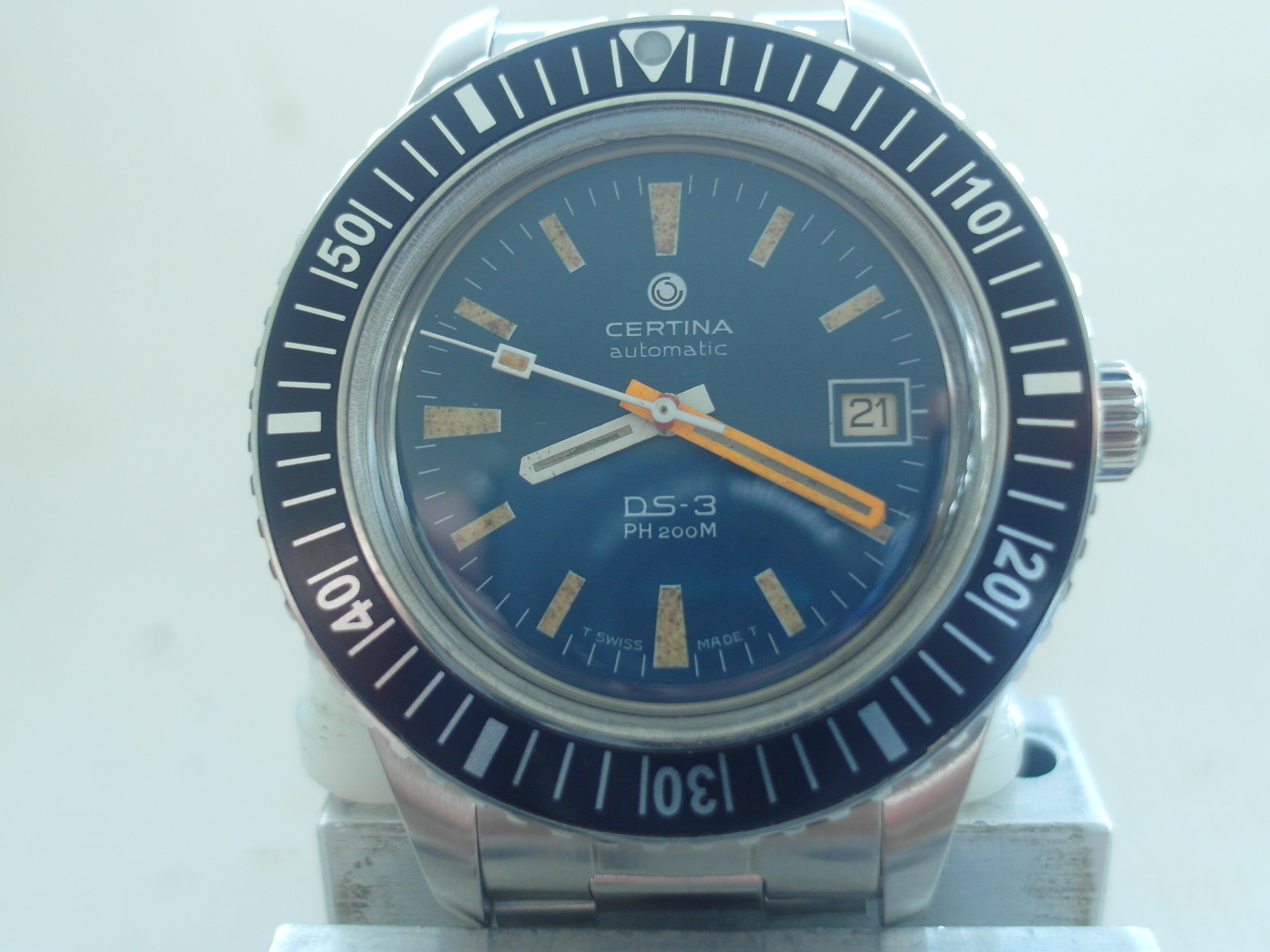 路Always wanted to use the old blue 200 m Certina DS 3 Tritium dials and hands and Original 919 hack movement in an bigger case with turning bezel and water resistant for everyday wear..... So: bought a slightly used new Certina 200 m ..... And believe it or not: even the inner movement holder of the new model ( ETA mvmt .) takes the old certina hack movement 919 and the blue DS 3 dial. had a few spares left from previous services and the original yellow rubber ring is mounted as well. slightly thinner diameter . does the job and nothing rattles, when this setup is fixed with the new turtle case back. amazing. 2 pictures added. kind regards. Achim