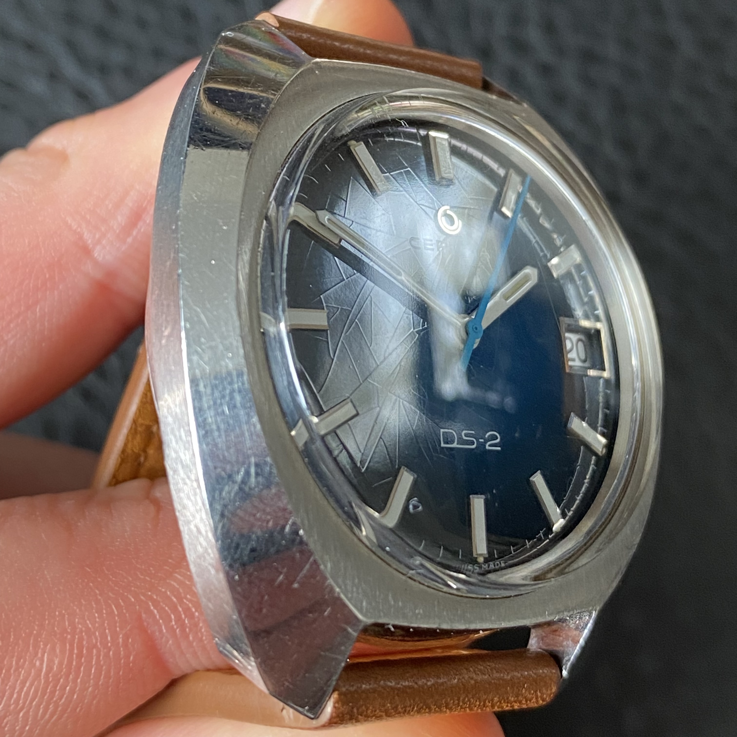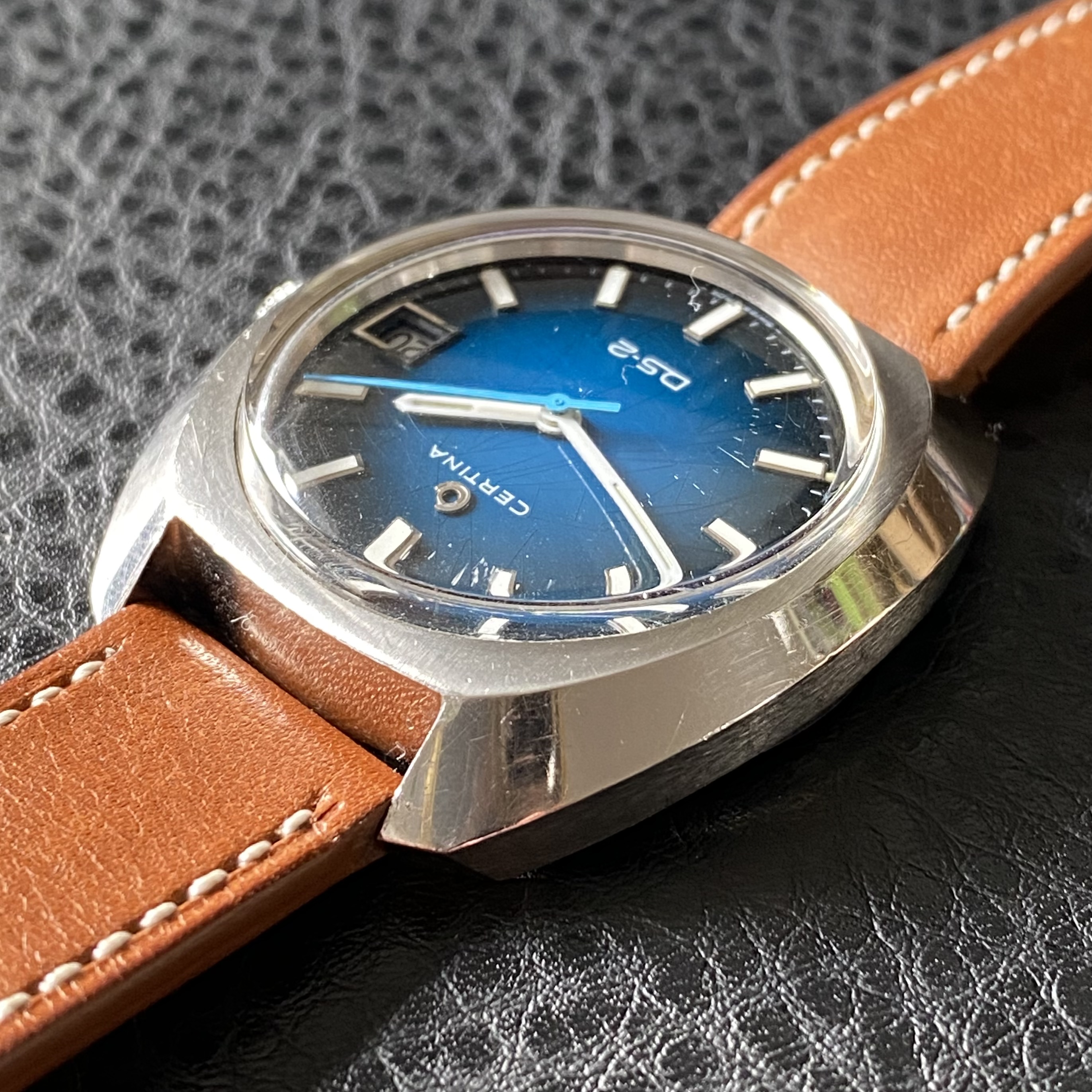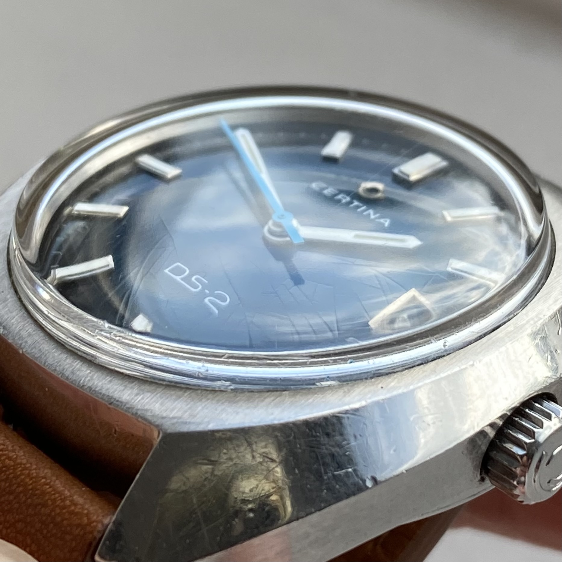 -Dial and hands: the watch has a subtle spider dial, visible mainly at side angles. It has a nice 70s gloss blue colour. Lume on both dial and hands is present and intact.