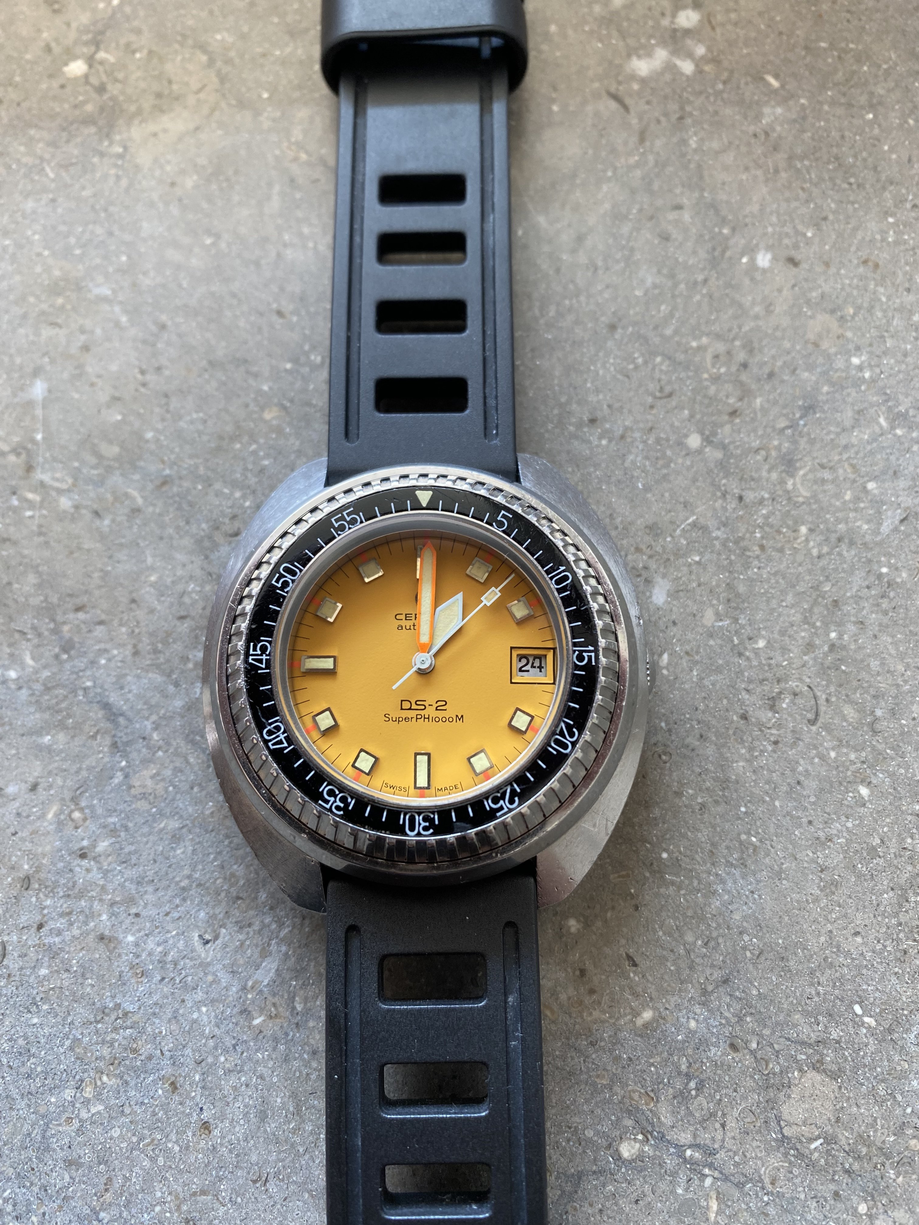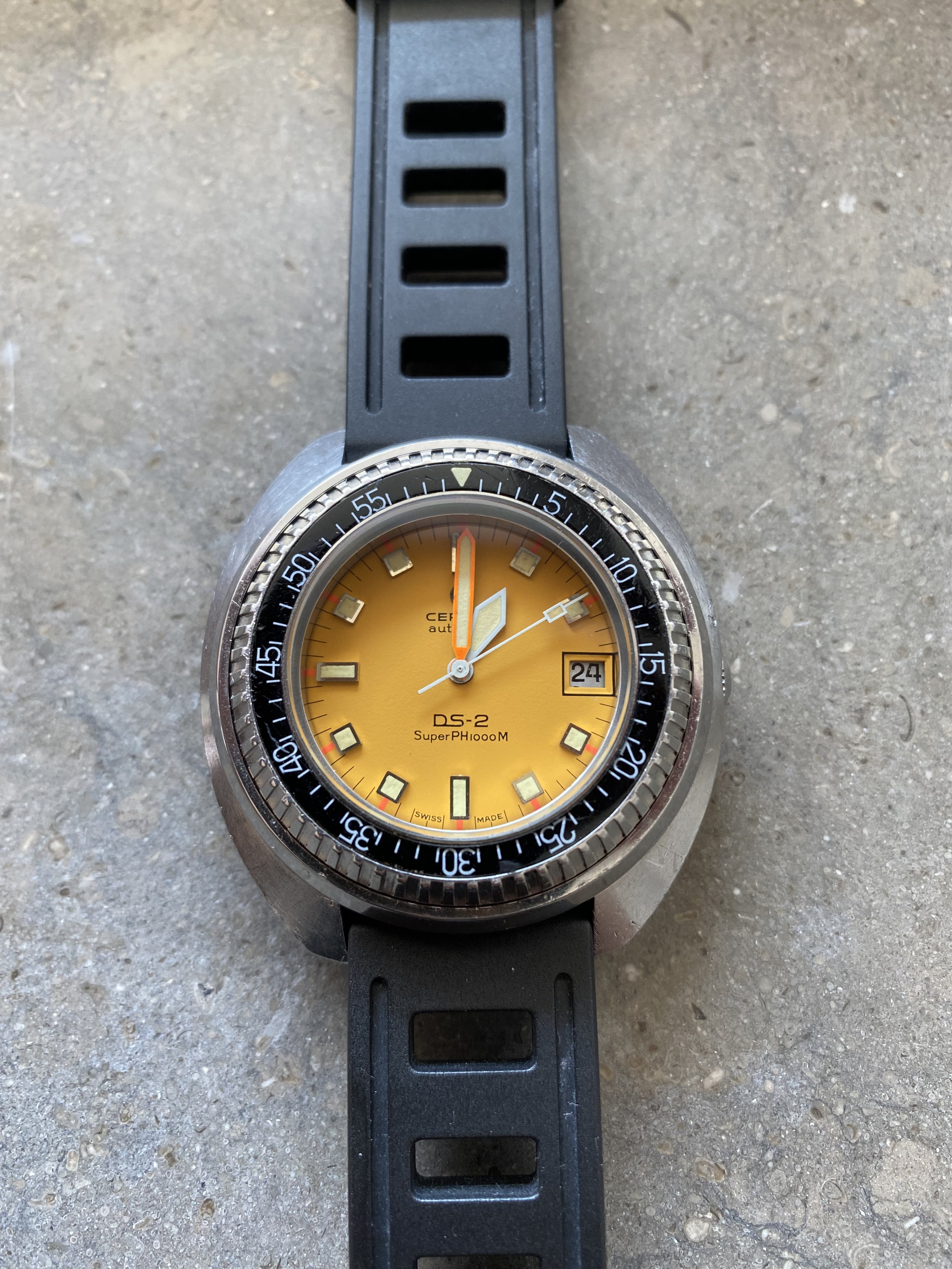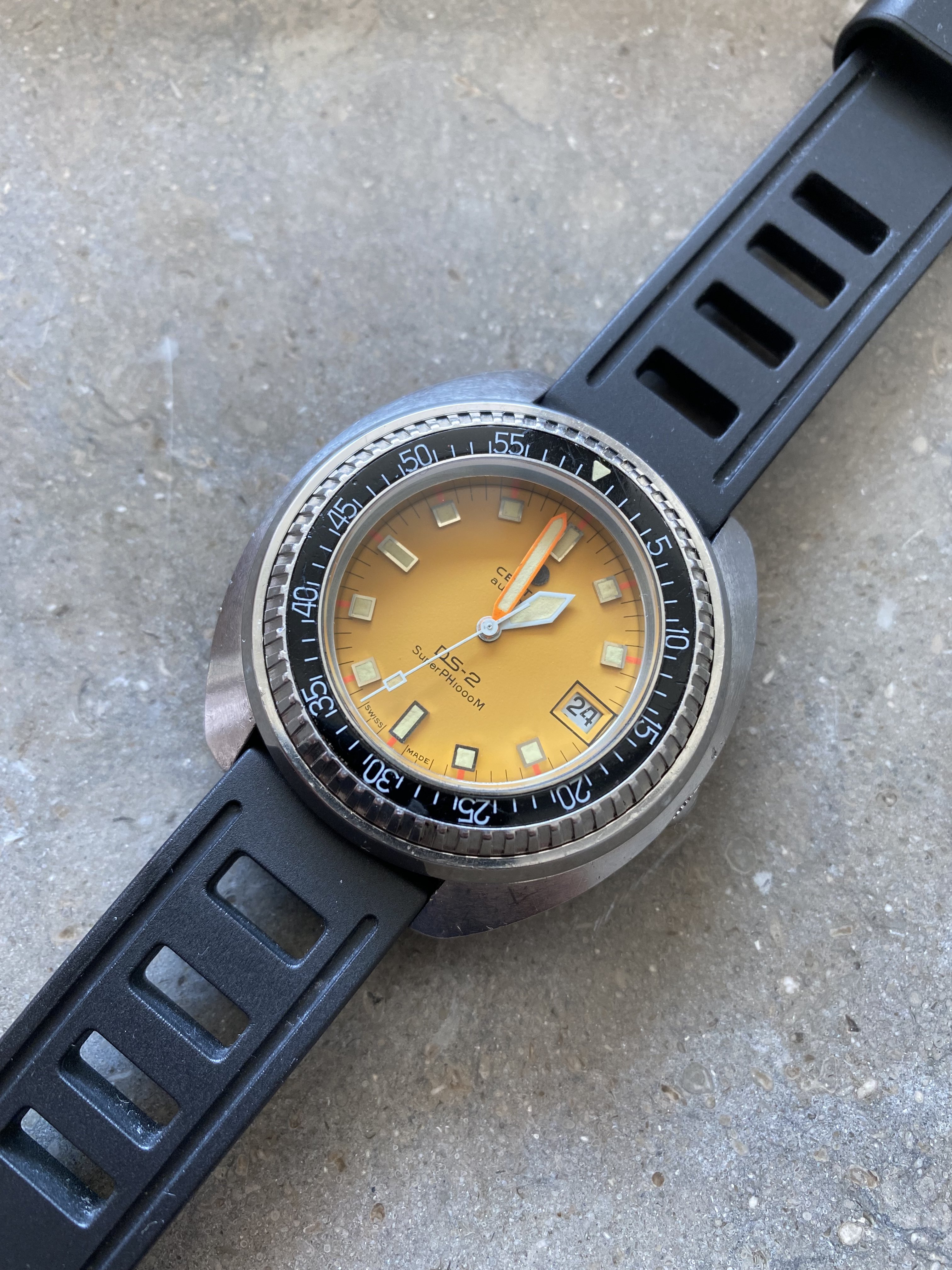 Selling a very nice certina DS-2 Ph1000m divers watch from the 70s. This particular example is in a nice original condition, the movement winds smoothly and the watch keeps time within 1-2min/24h. The yellow/orange dial is extremely appealing. The spring/ball in the bezel that makes the clicking sound is missing. However this should be an easy and cheap fix that any watchmaker can do.