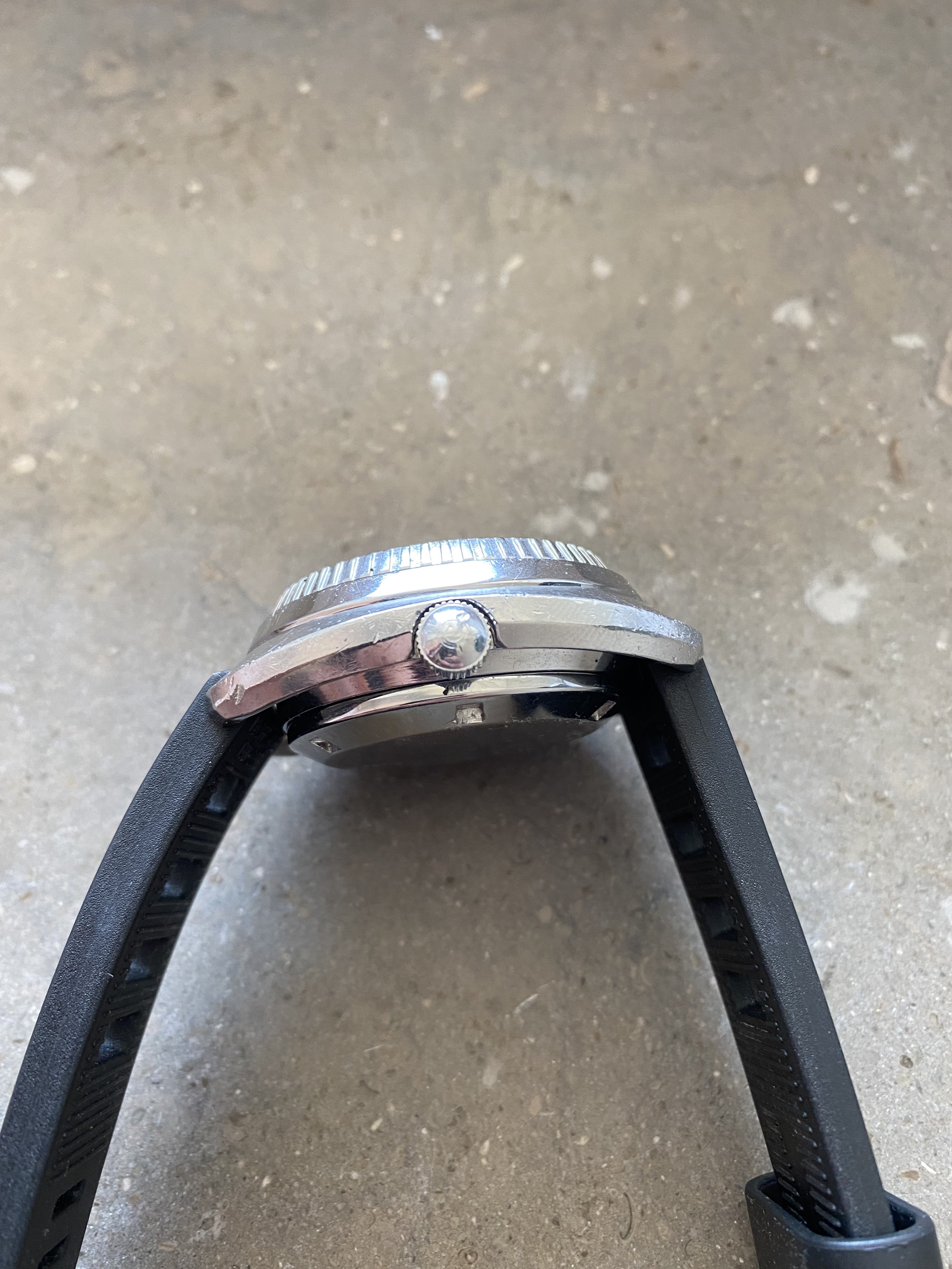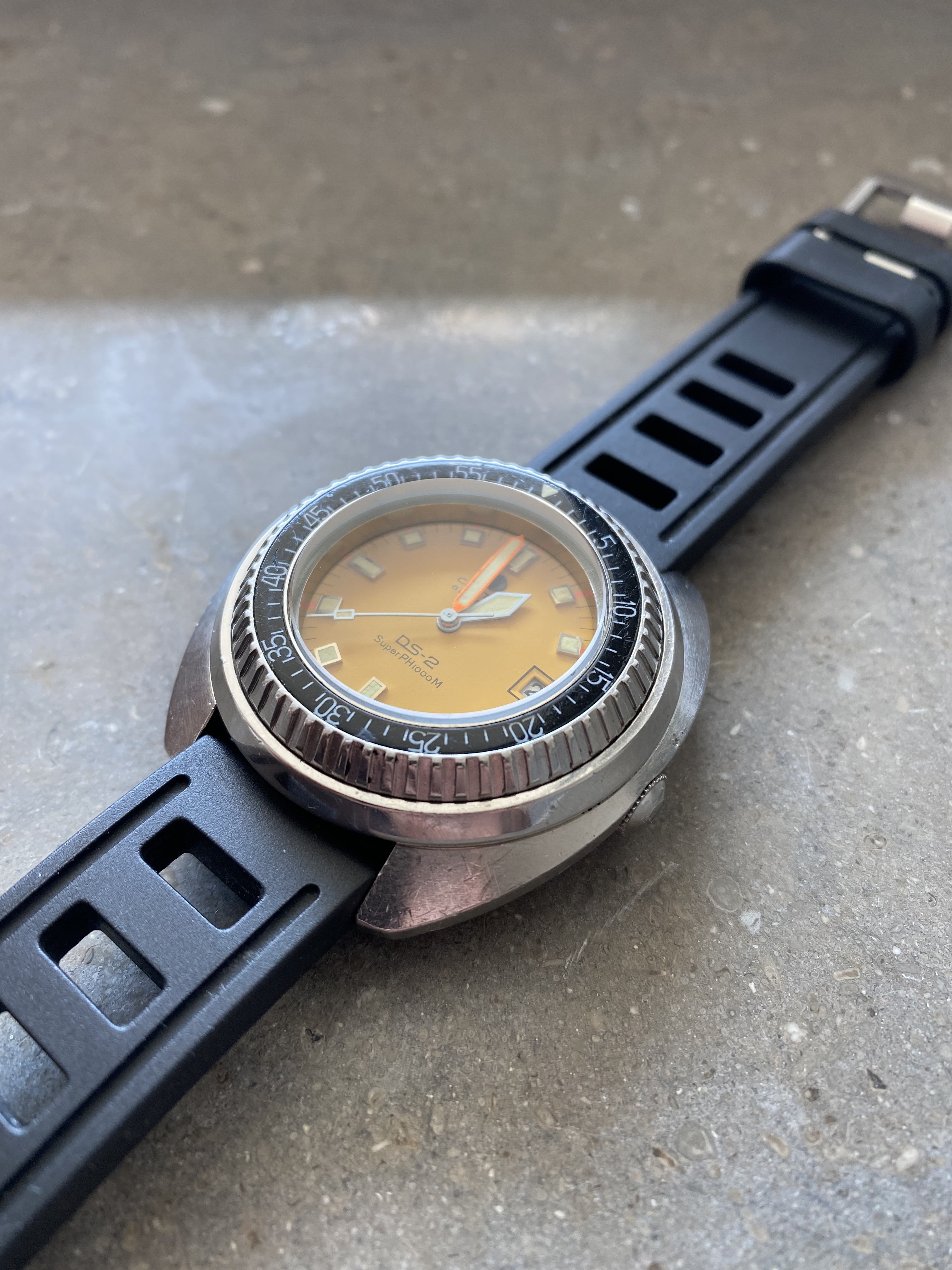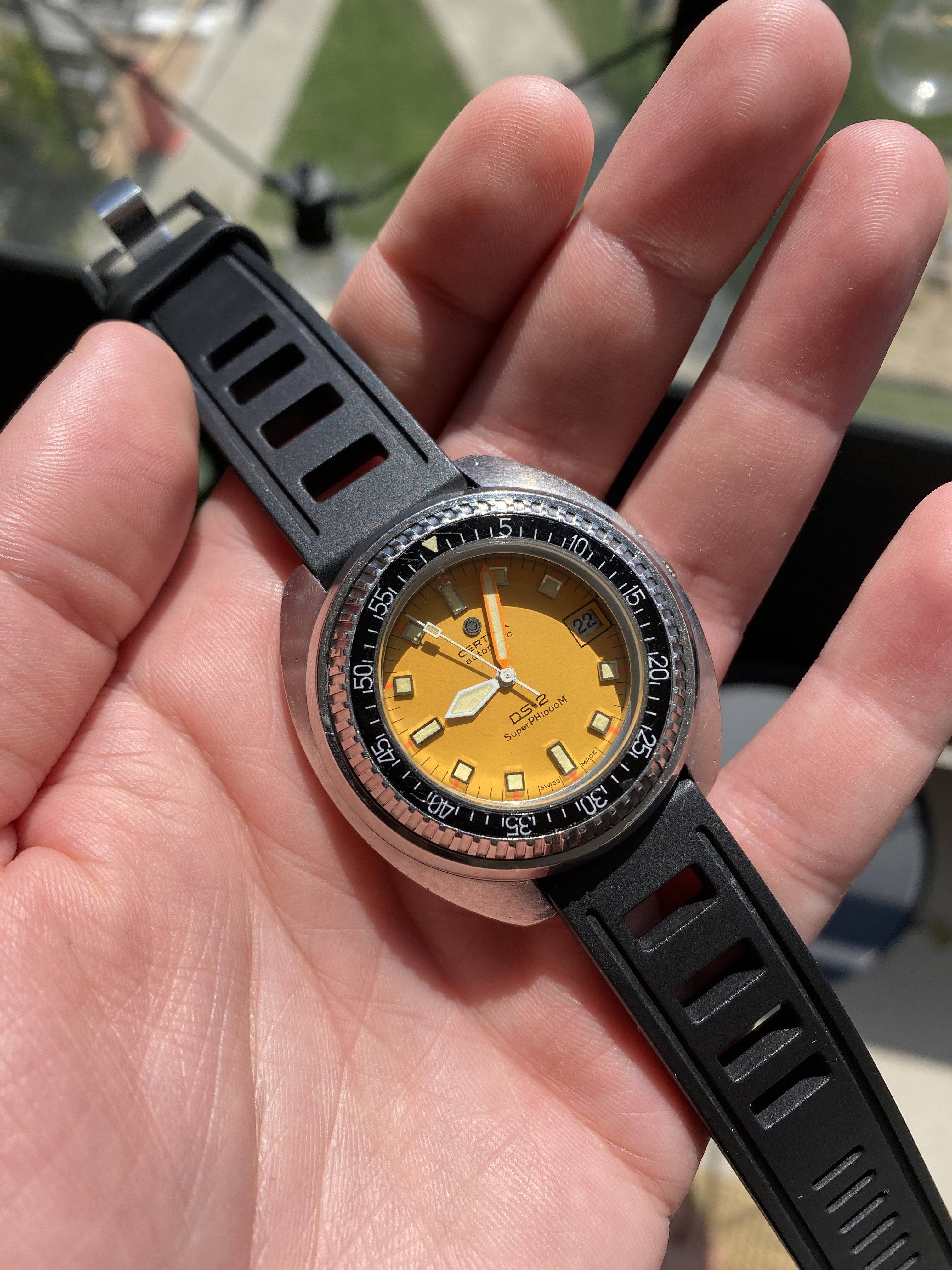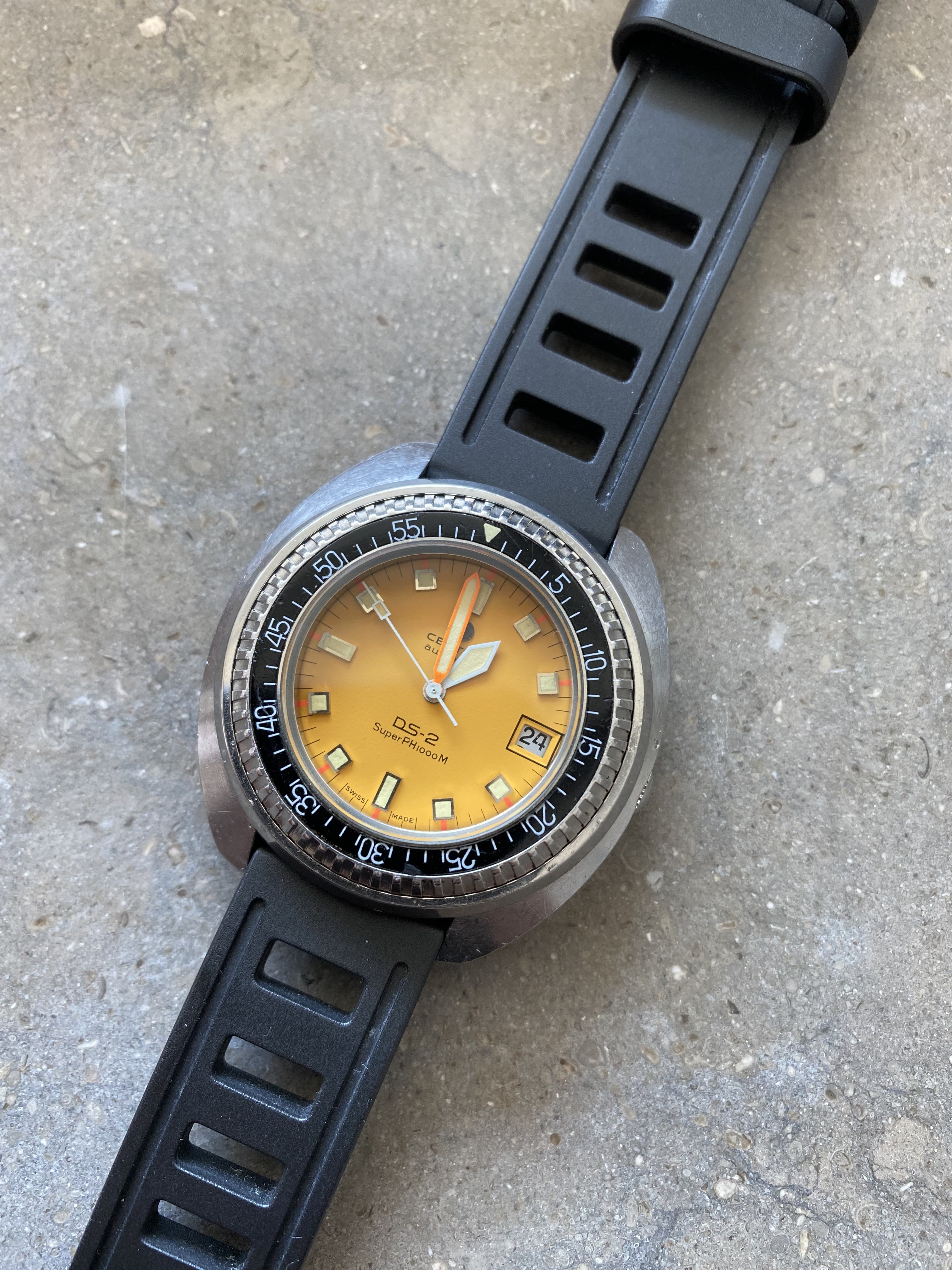 Selling a very nice certina DS-2 Ph1000m divers watch from the 70s. This particular example is in a nice original condition, the movement winds smoothly and the watch keeps time within 1-2min/24h. The yellow/orange dial is extremely appealing. The spring/ball in the bezel that makes the clicking sound is missing. However this should be an easy and cheap fix that any watchmaker can do.