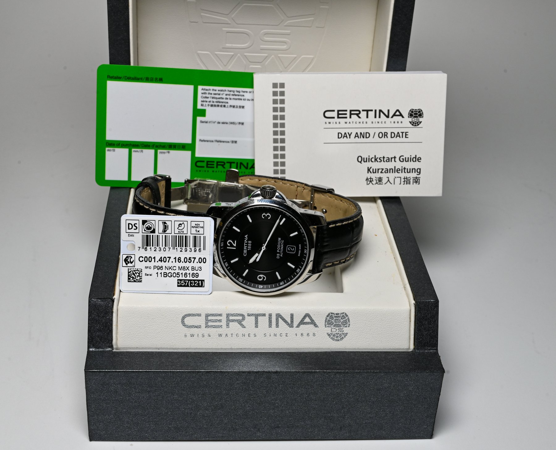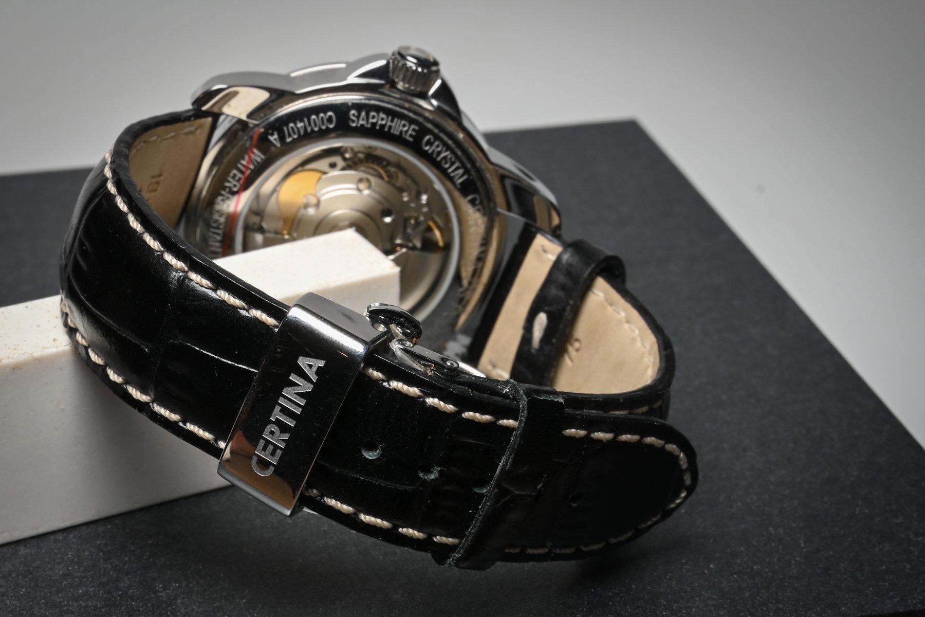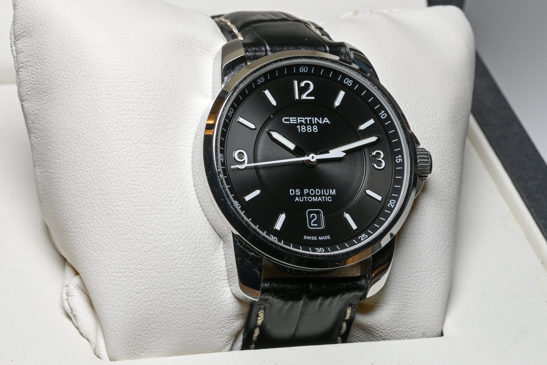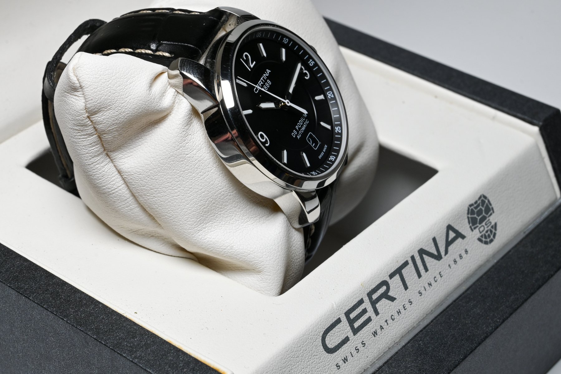 The Certina DS Podium series watch features a stainless steel 38 mm case, with a fixed bezel a black dial and a scratch resistant sapphire crystal.