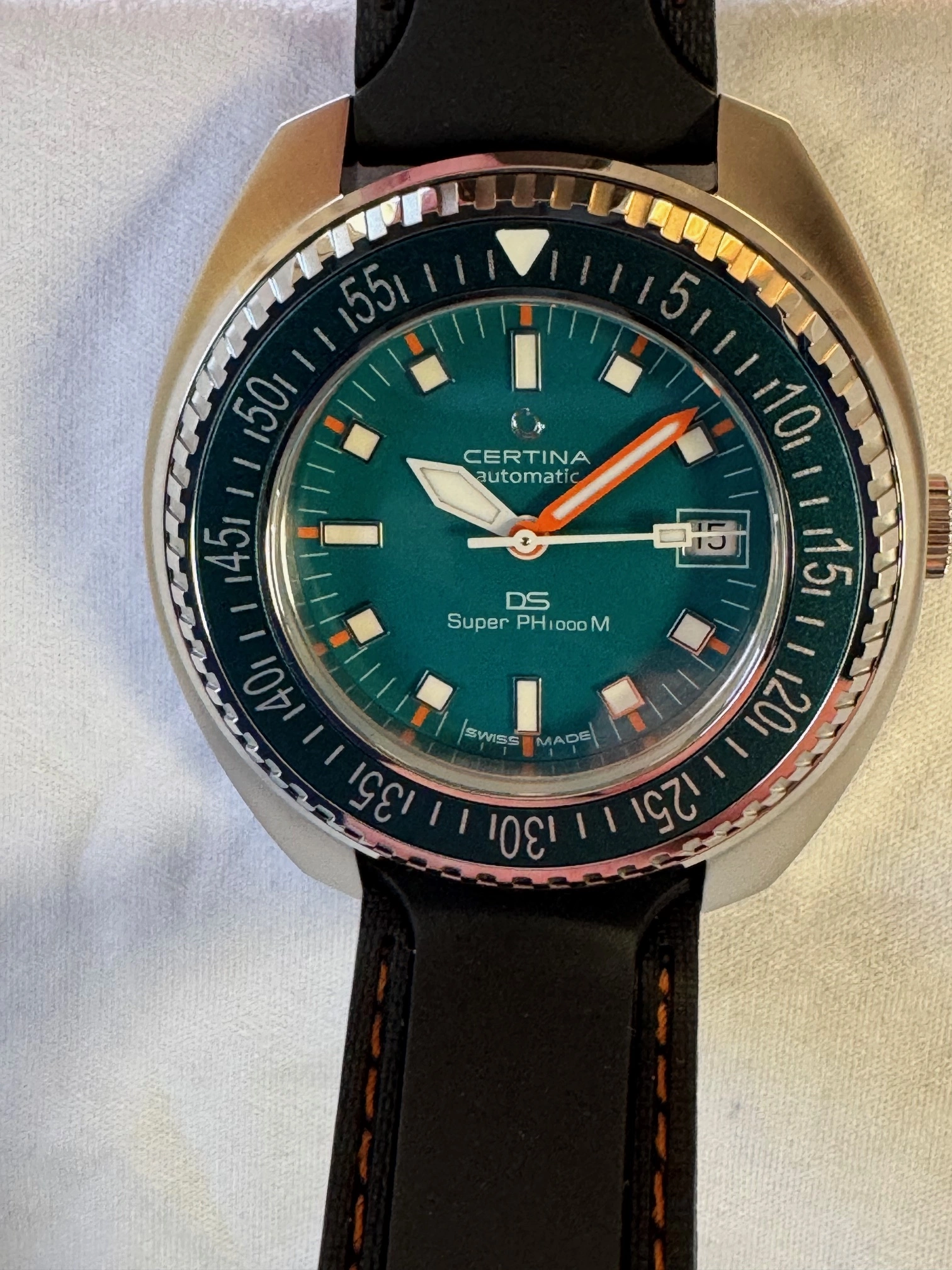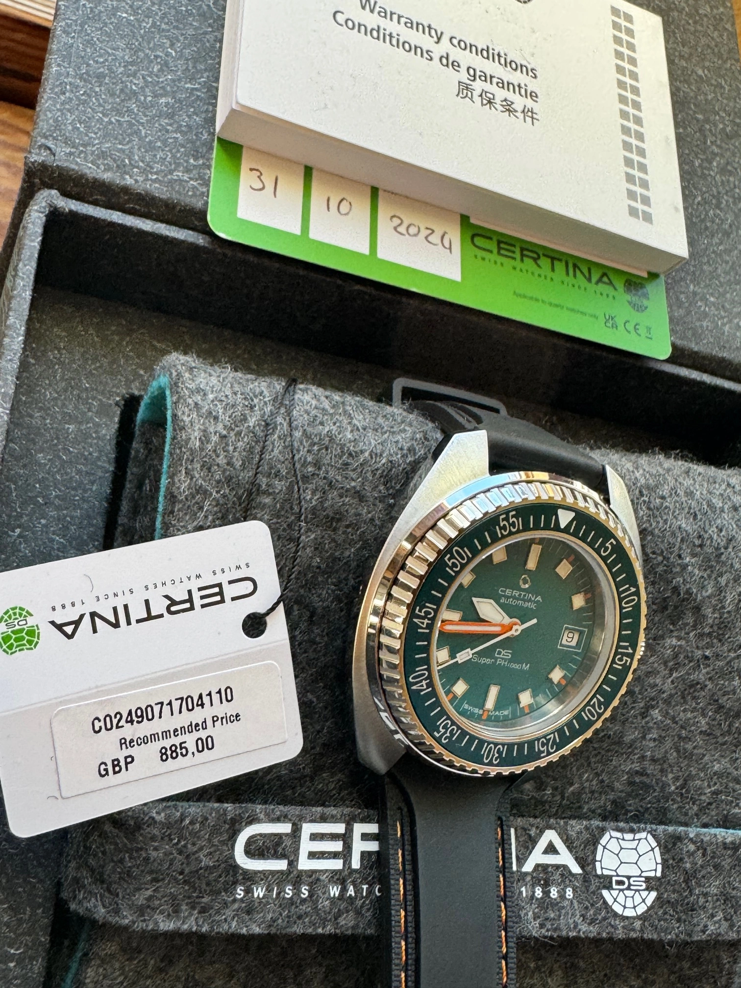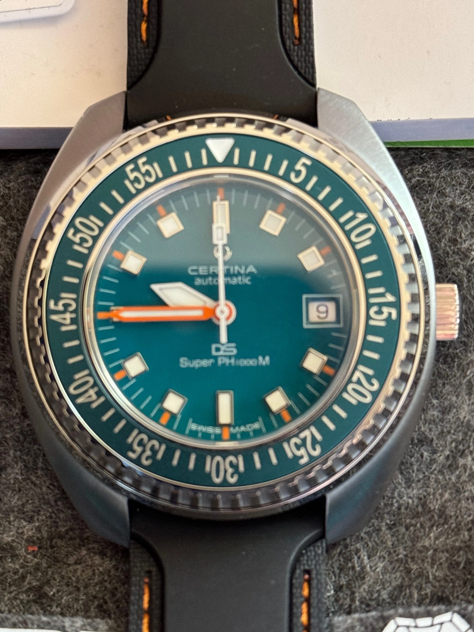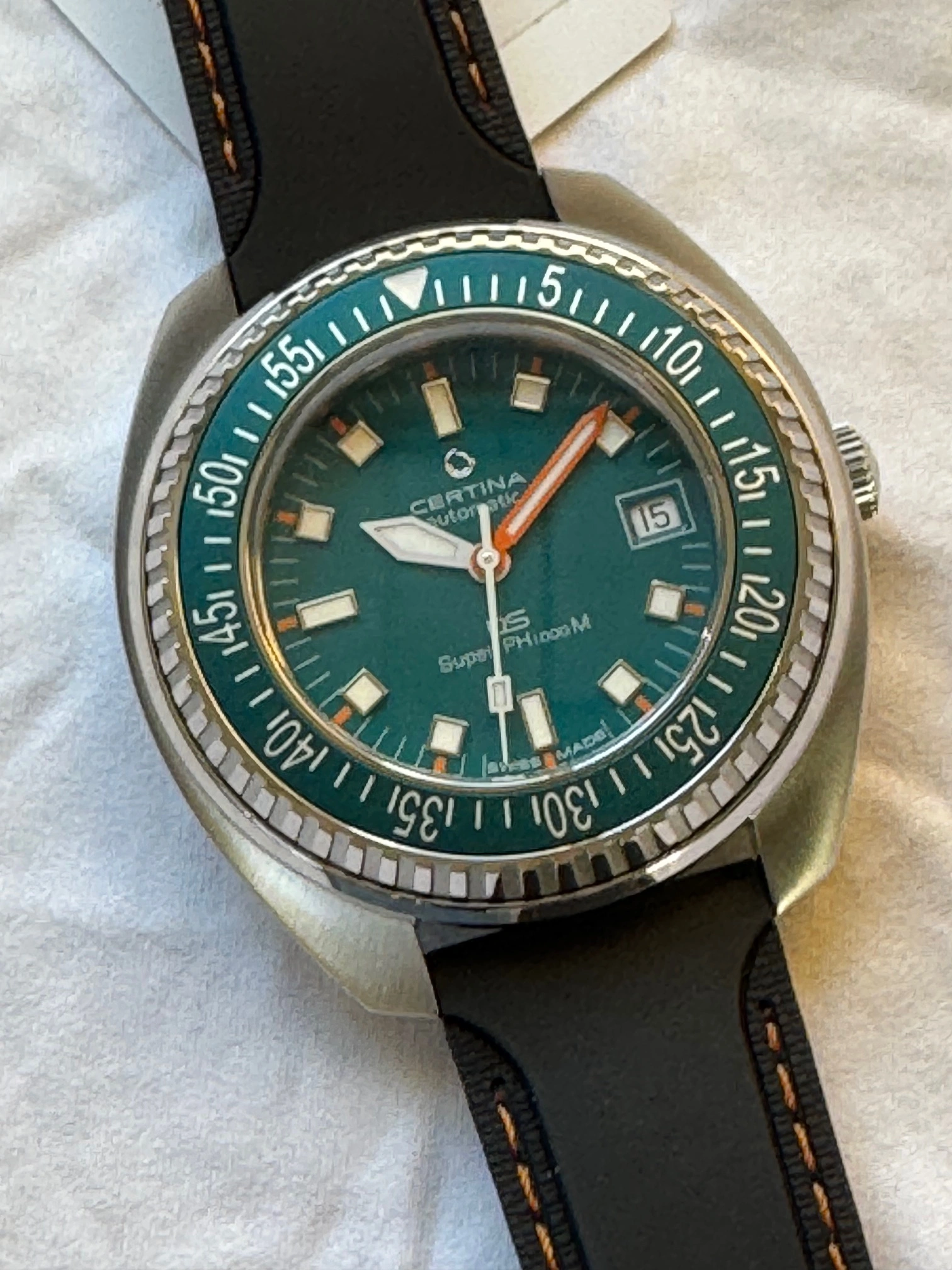 This Certina and I are located in Canada. It will ship via FedEx double-boxed for safety with its OEM strap, watch roll, box, papers and the balance of its international warranty. Asking is USD 835.00, before shipping.