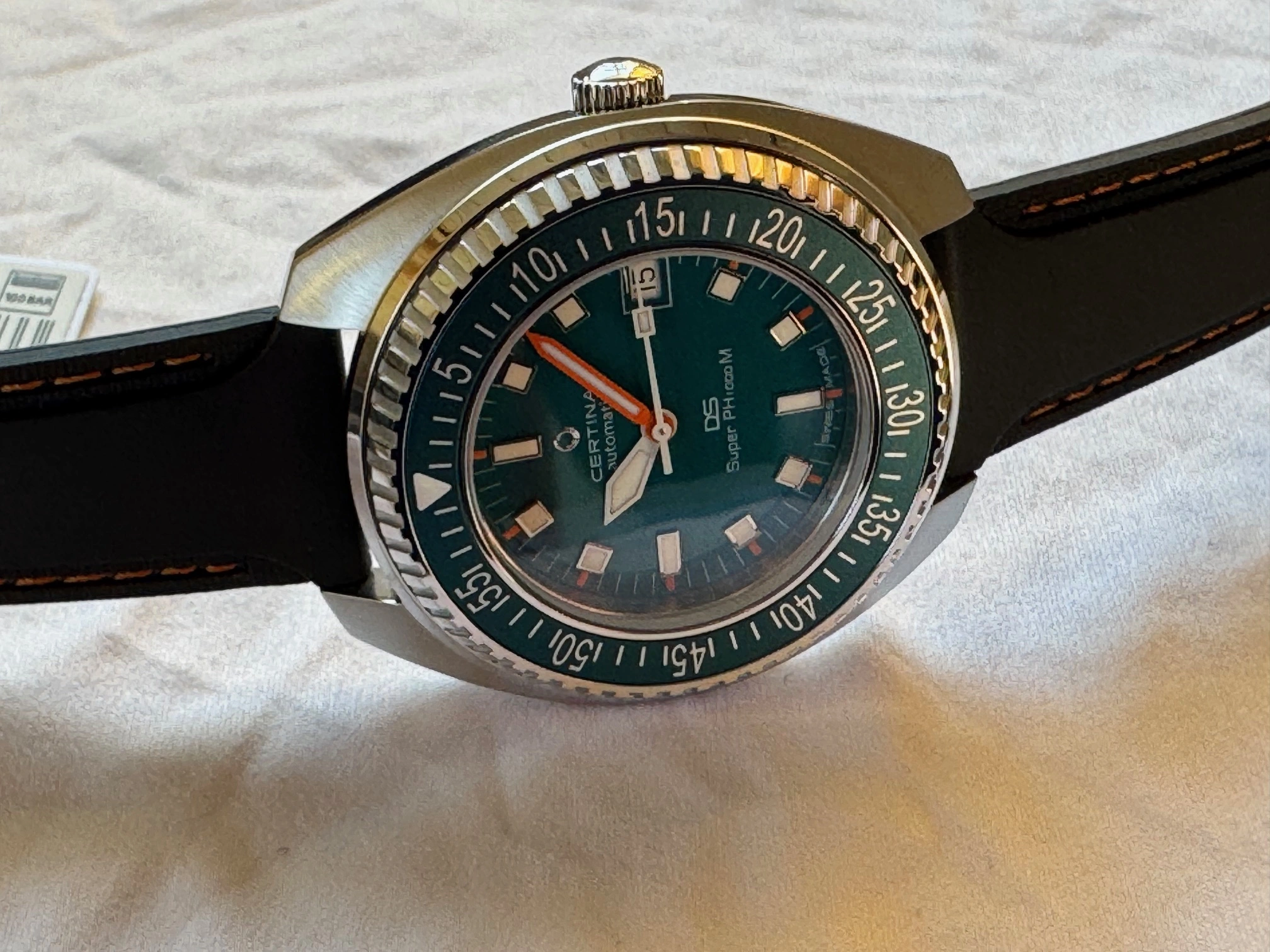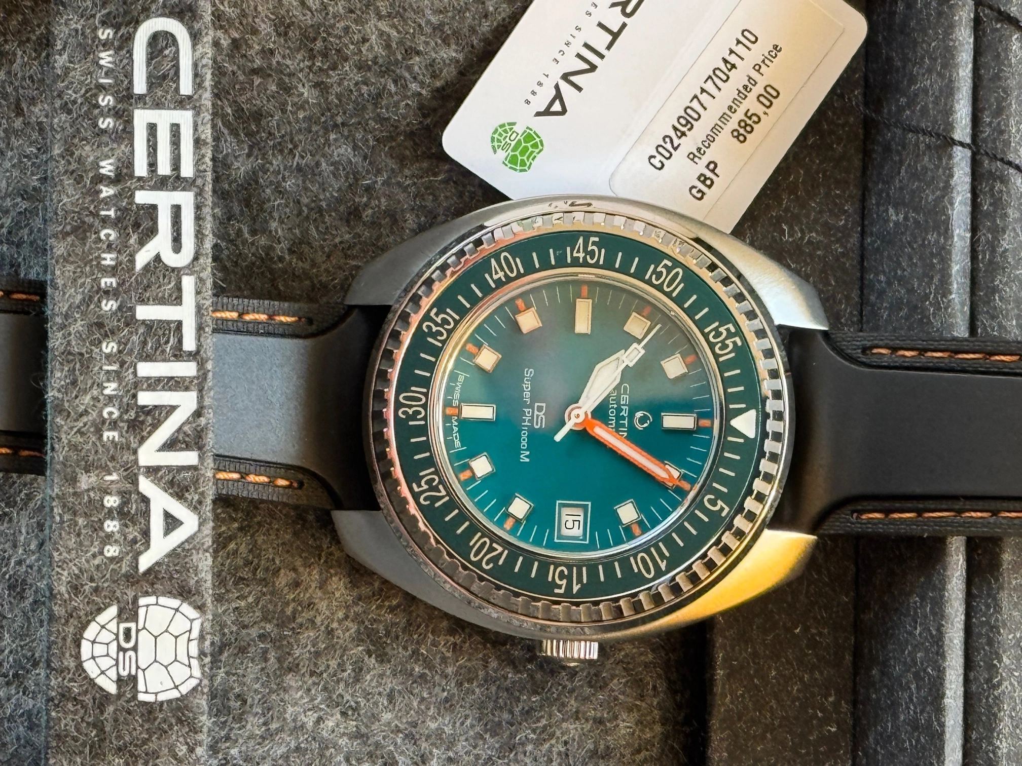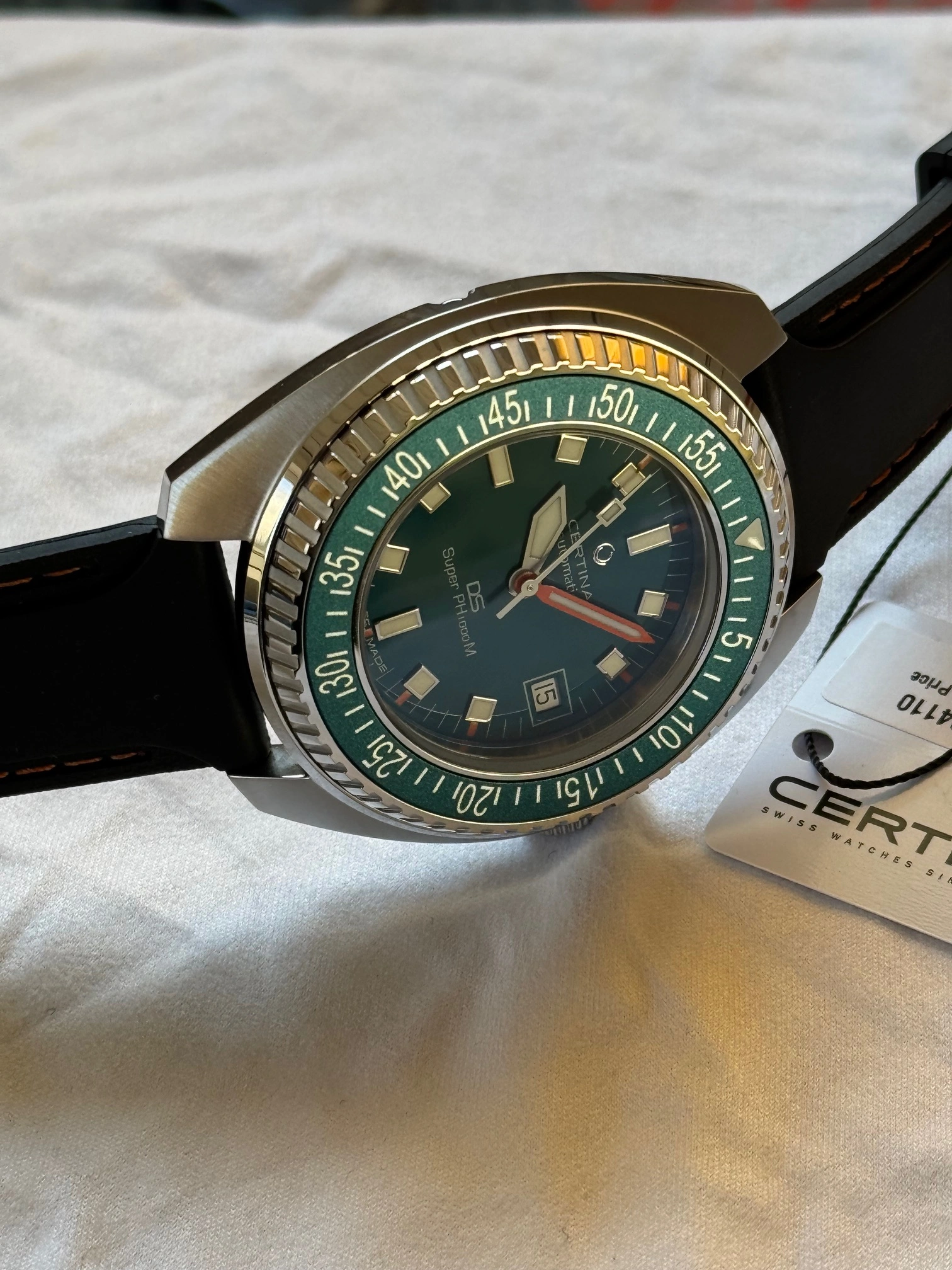 This Certina and I are located in Canada. It will ship via FedEx double-boxed for safety with its OEM strap, watch roll, box, papers and the balance of its international warranty. Asking is USD 835.00, before shipping.
