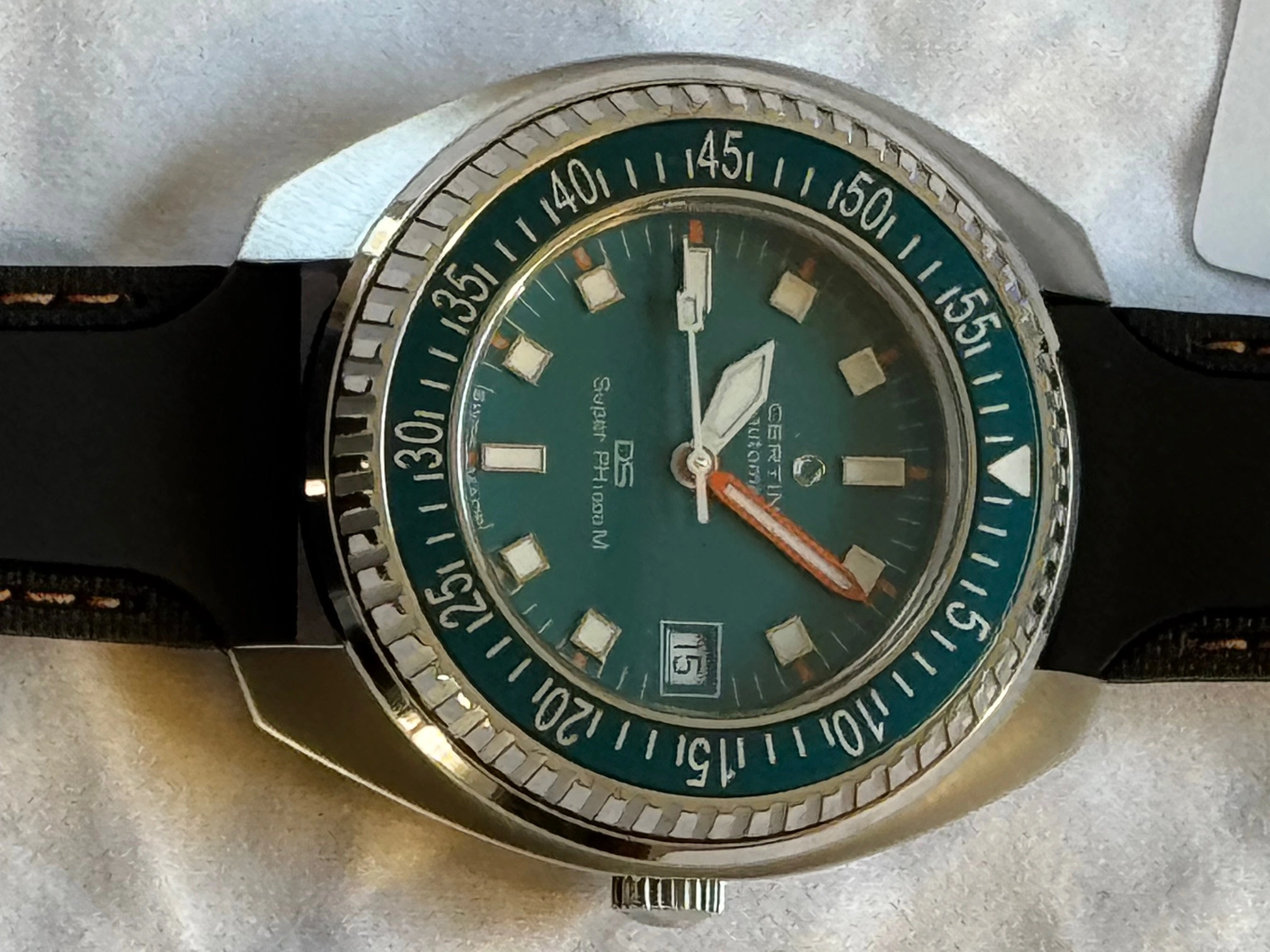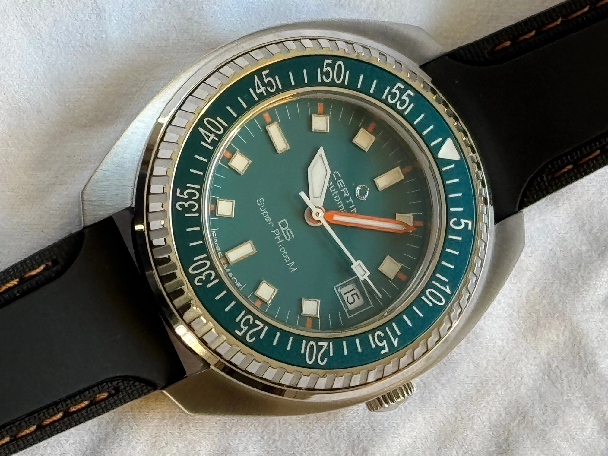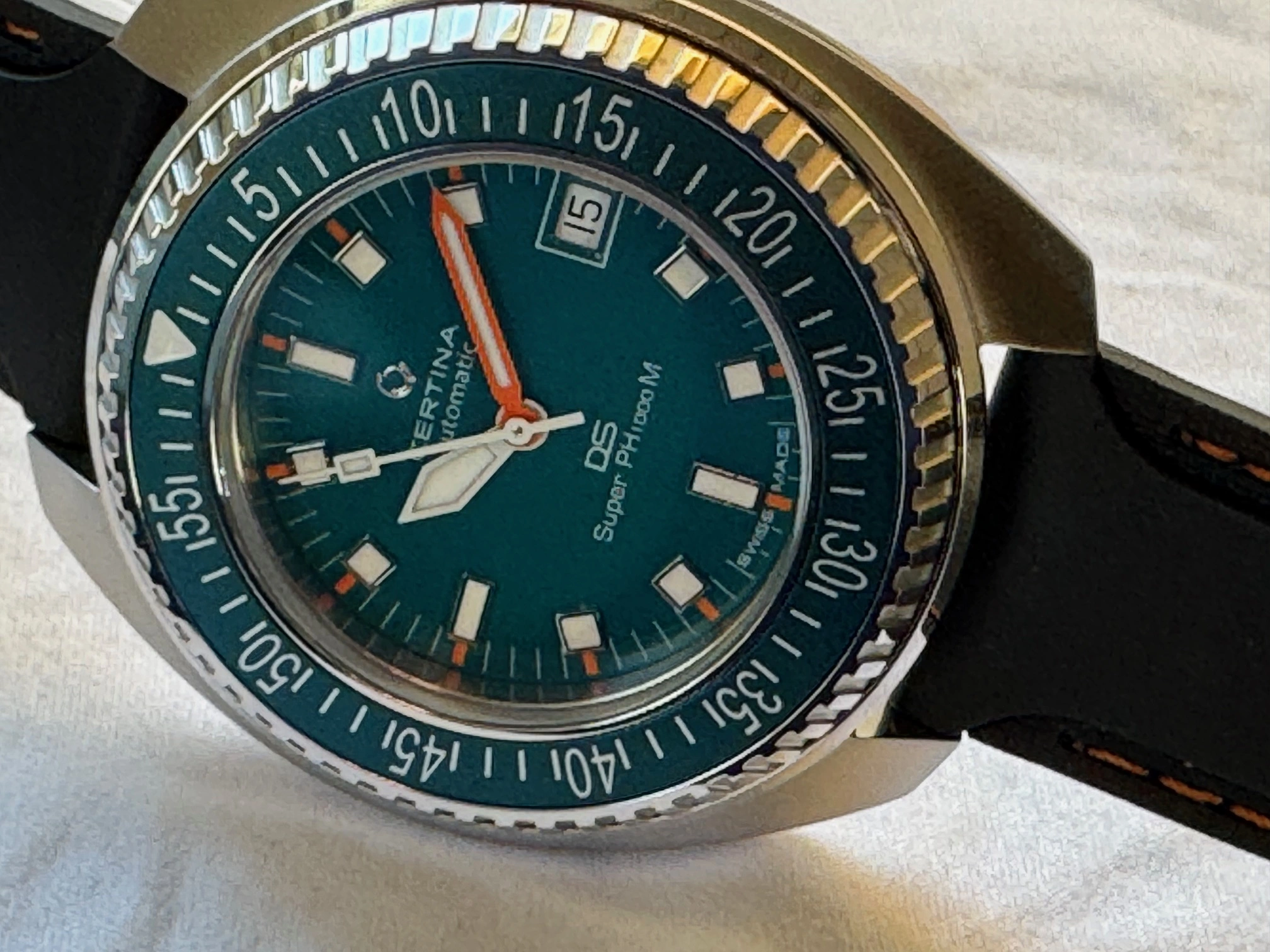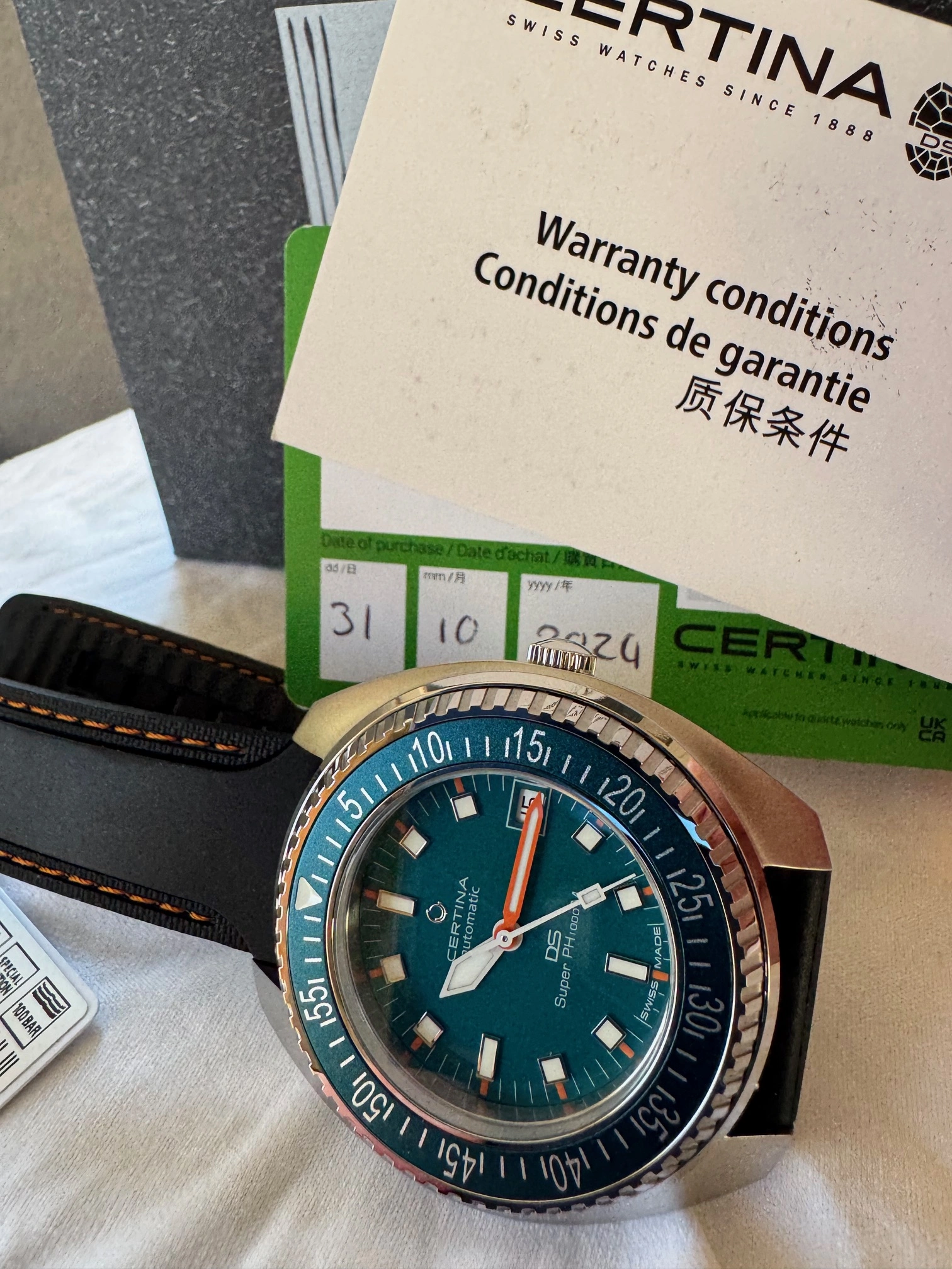 This Certina and I are located in Canada. It will ship via FedEx double-boxed for safety with its OEM strap, watch roll, box, papers and the balance of its international warranty. Asking is USD 835.00, before shipping.