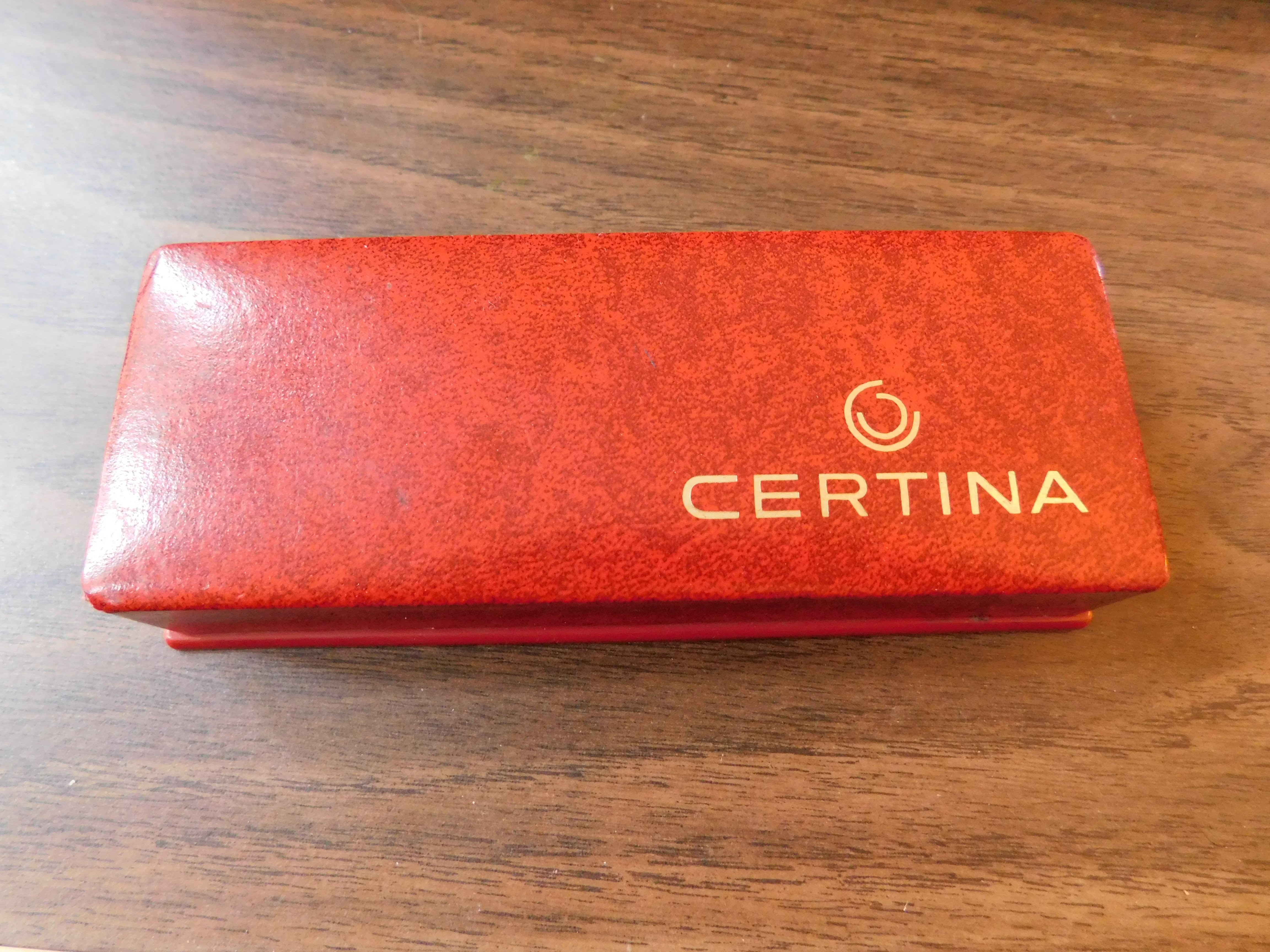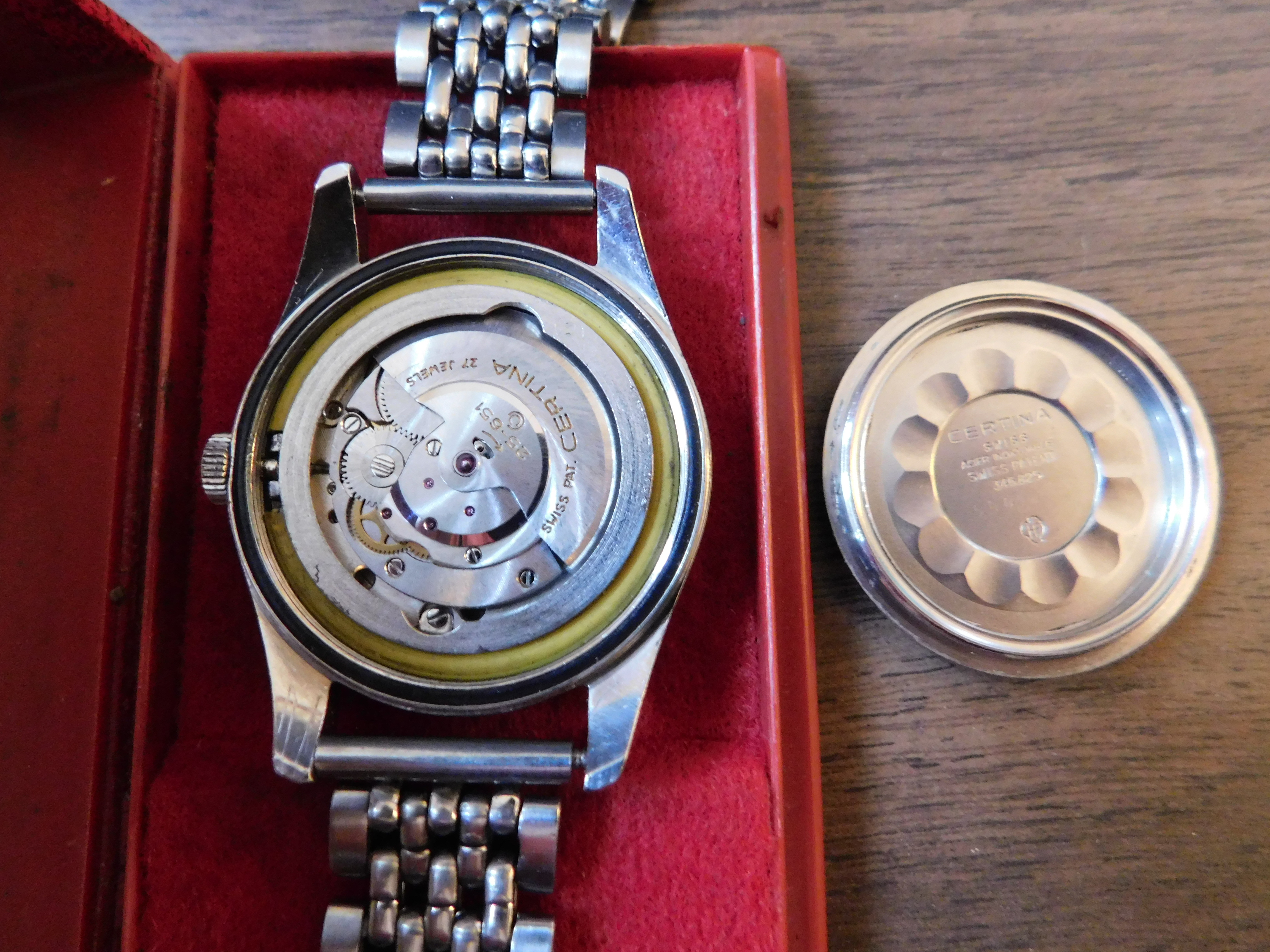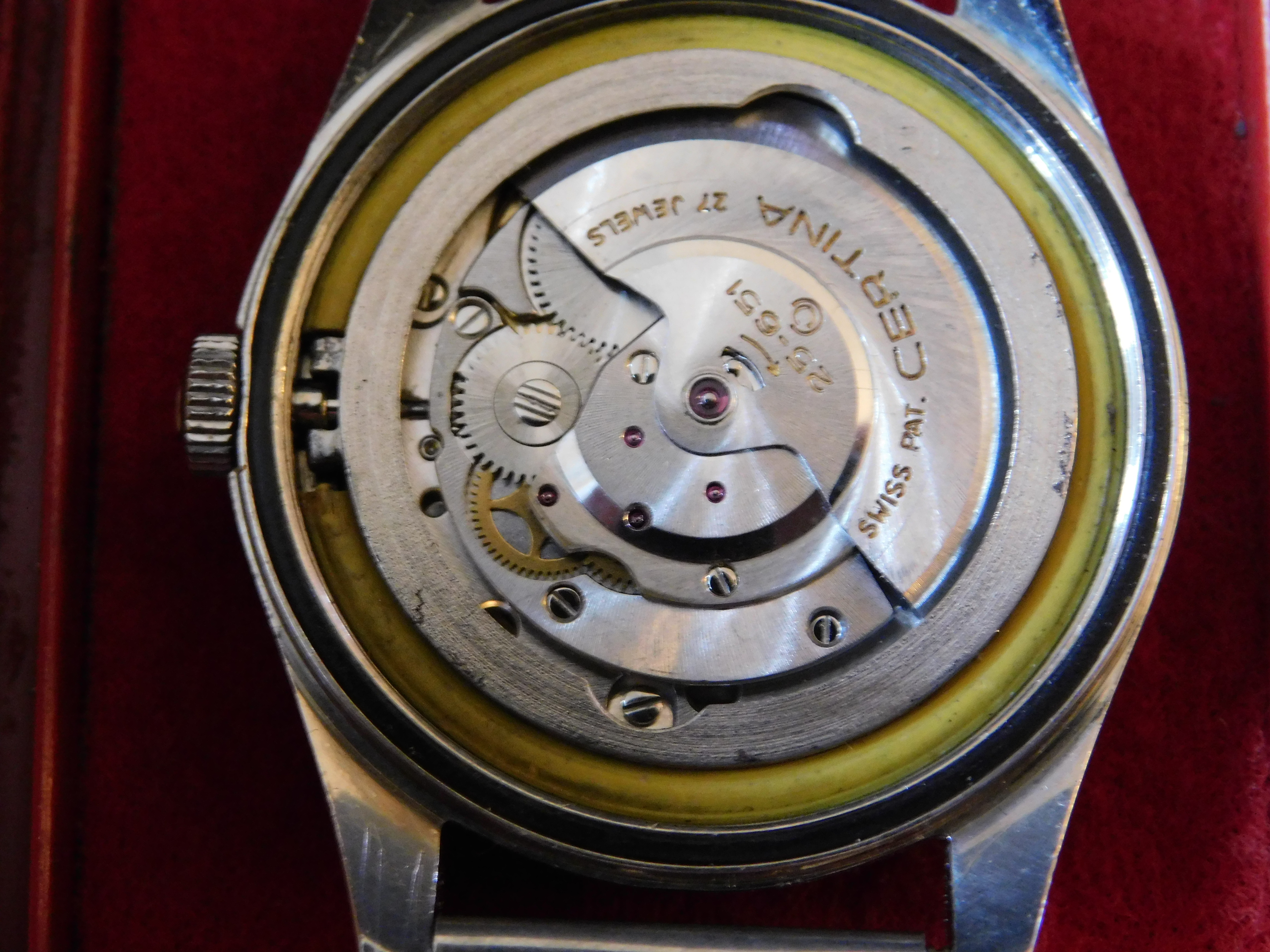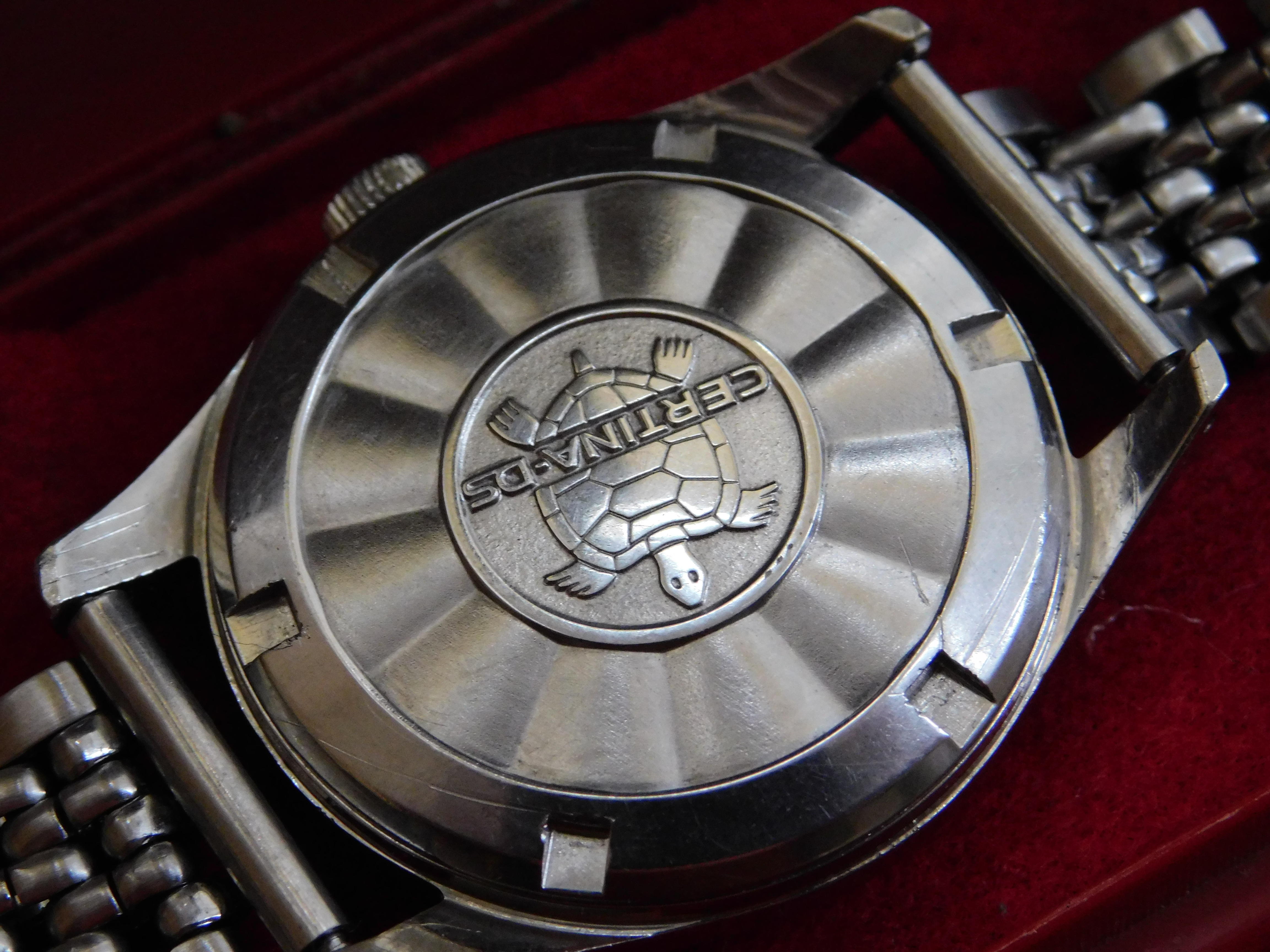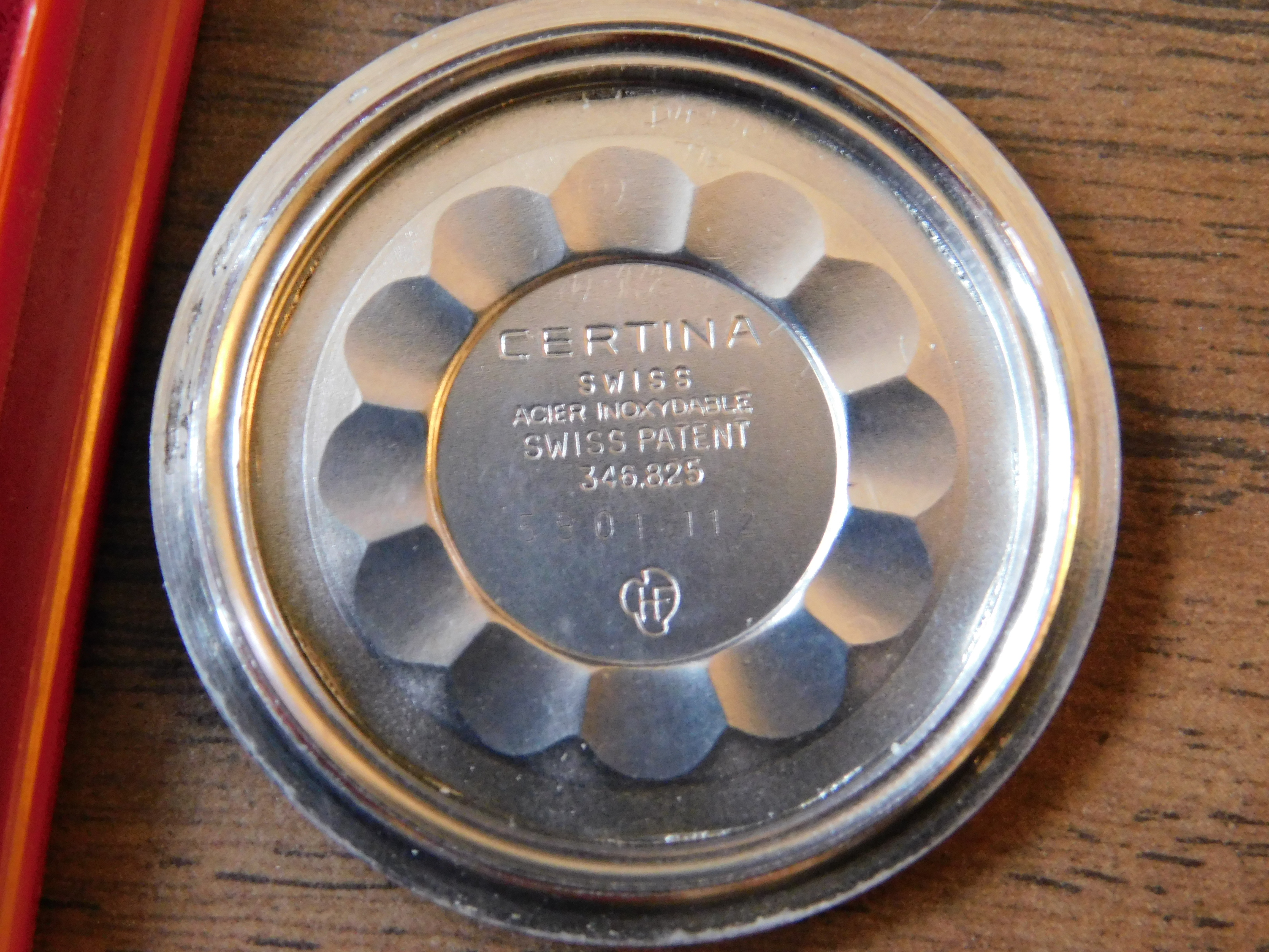 Case: Screwback stainless steel case, Ref.345.825, Outside with Turtle logo, original Crown with Certina logo. Unpolished