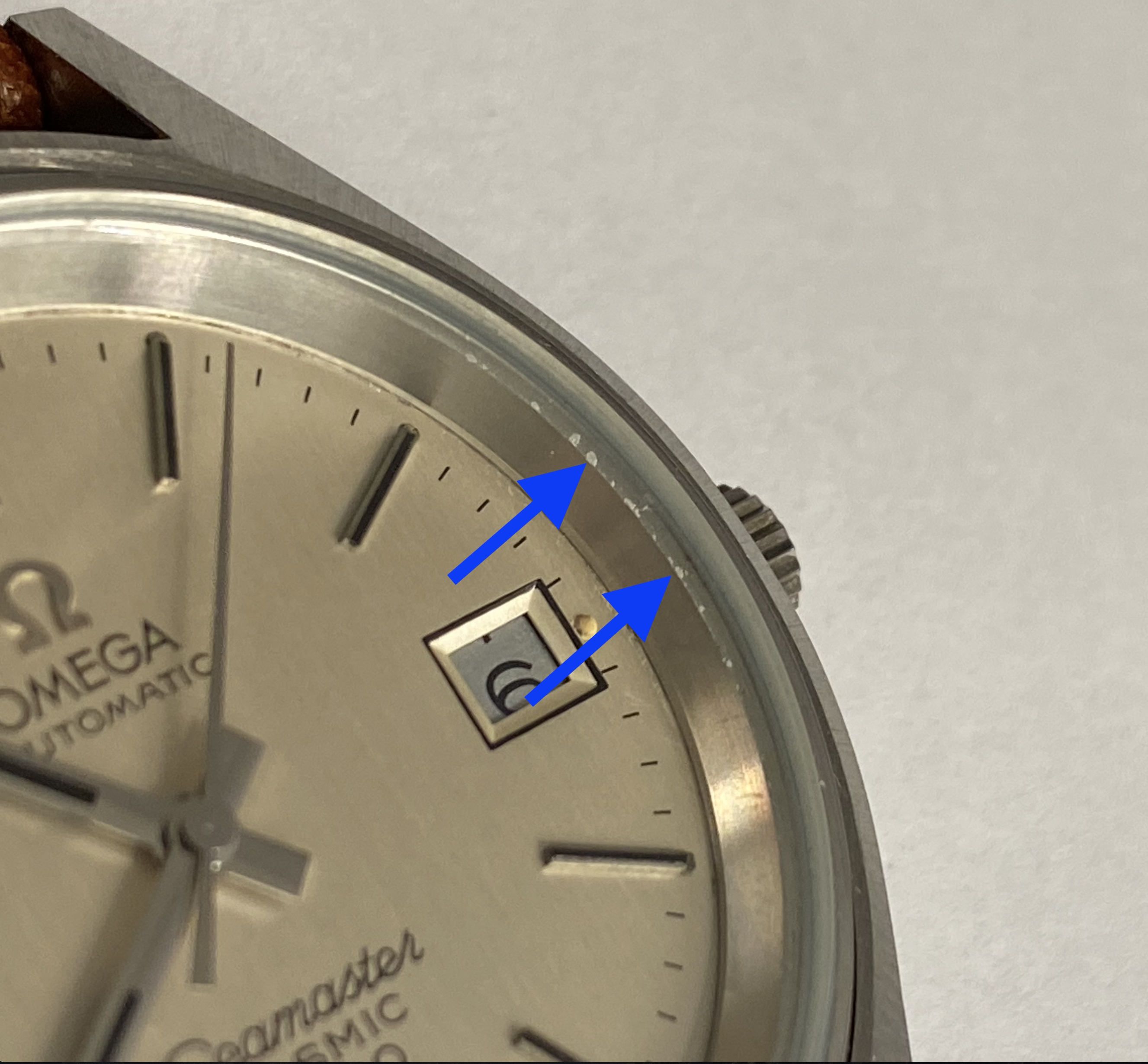 Is this corrosion of the actual inner bezel metal? Could this sort of thing be buffed out or do I need a new inner bezel (they're still available). After looking more closely, I see they're all around the ring. It bugs me as it's the only blemish on the watch that's noticeable.