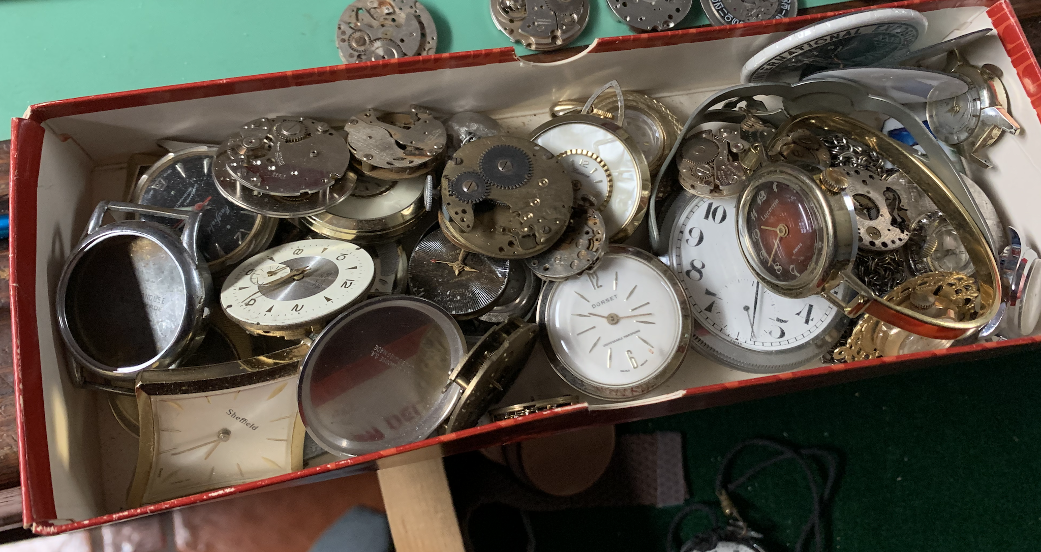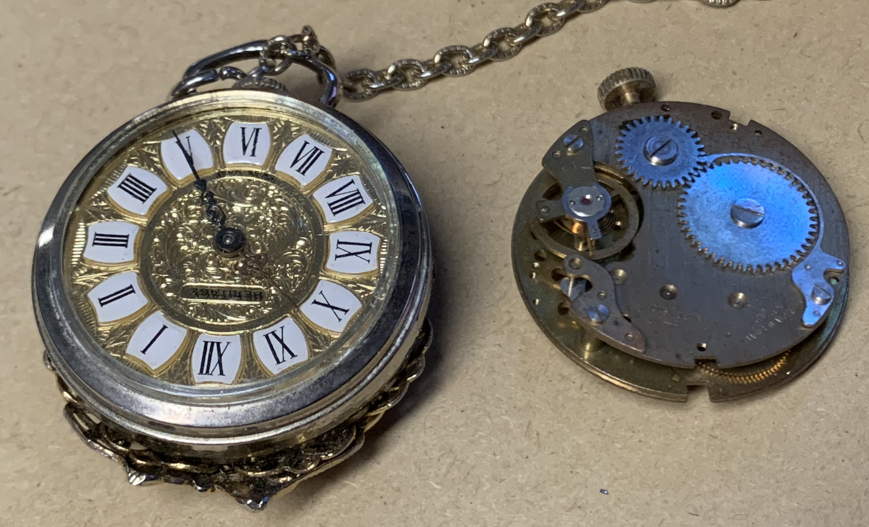 ·In the back of one of my drawers I keep a box of pin lever movements and part. Mostly because I found this costume watch which I wear at the Dickens Fair. This surprisingly gets noticed from time to time.