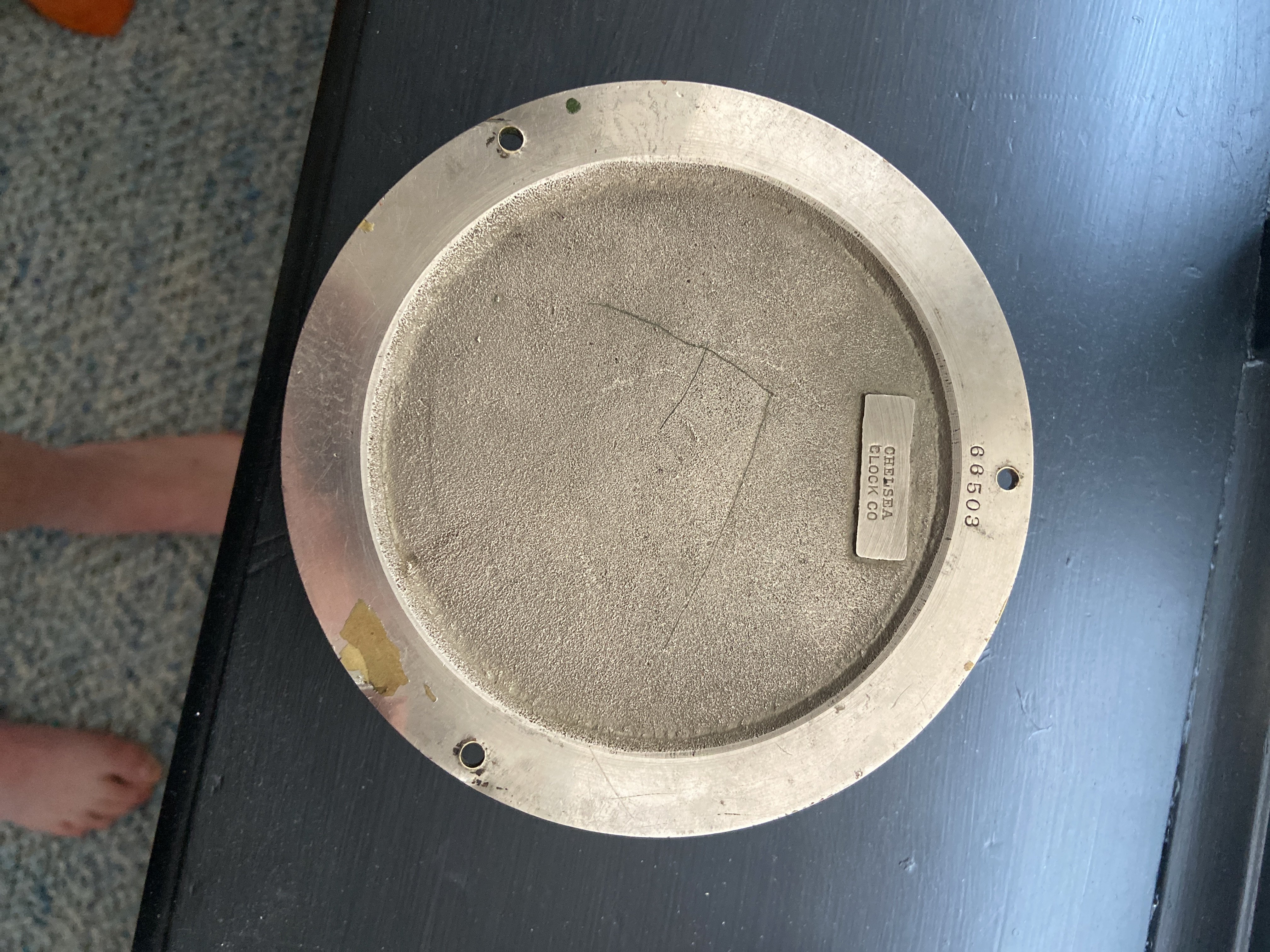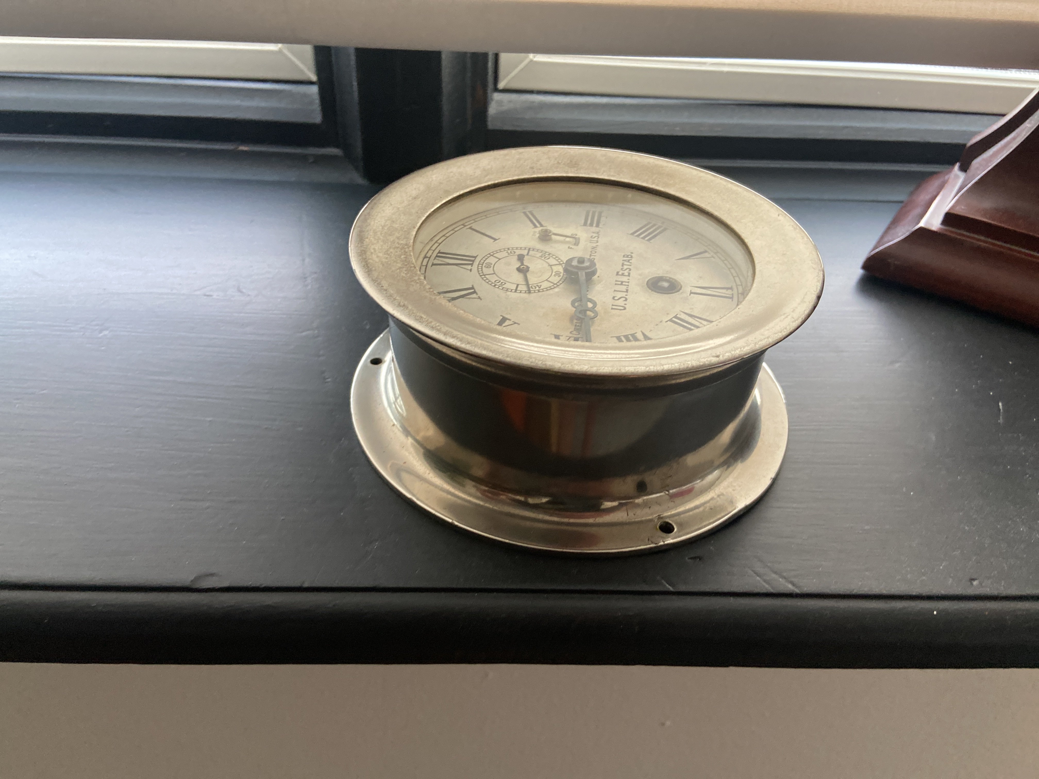 1911 Chelsea Brass Wall clock. original surfaces. United States Lighthouse Establishment Brass Wall Clock. U. S. Light House Establishment Brass Chelsea Clock c.1908. Clocks from the U. S. Light House Establishment are rare and always in demand. This one is exceptional because it is in original and working condition and was sold to the United States Light House Establishment on September 2, 1911 , . 4 " marine movement is in original nickel plated, case with screw bezel. Case measures about 5 " across the bezel and 2 " deep. . Original 4.5" dial is in very good original condition with only some soil and a few marks from years of winding. The face is lettered "U.S.L.H.Estab.", Chelsea Clock Company, Boston . U.S.A. Case S/n amd movement s/n matches. Eight day 7-jewel movement has been professionally cleaned and adjusted and is in fine running condition and keeps excellent time. This is an exceptional find for collectors of early Chelsea clocks or Light House memorabilia. included. Included the wooden cradle and a Replacement winding key , 2500 USD plus shipping...