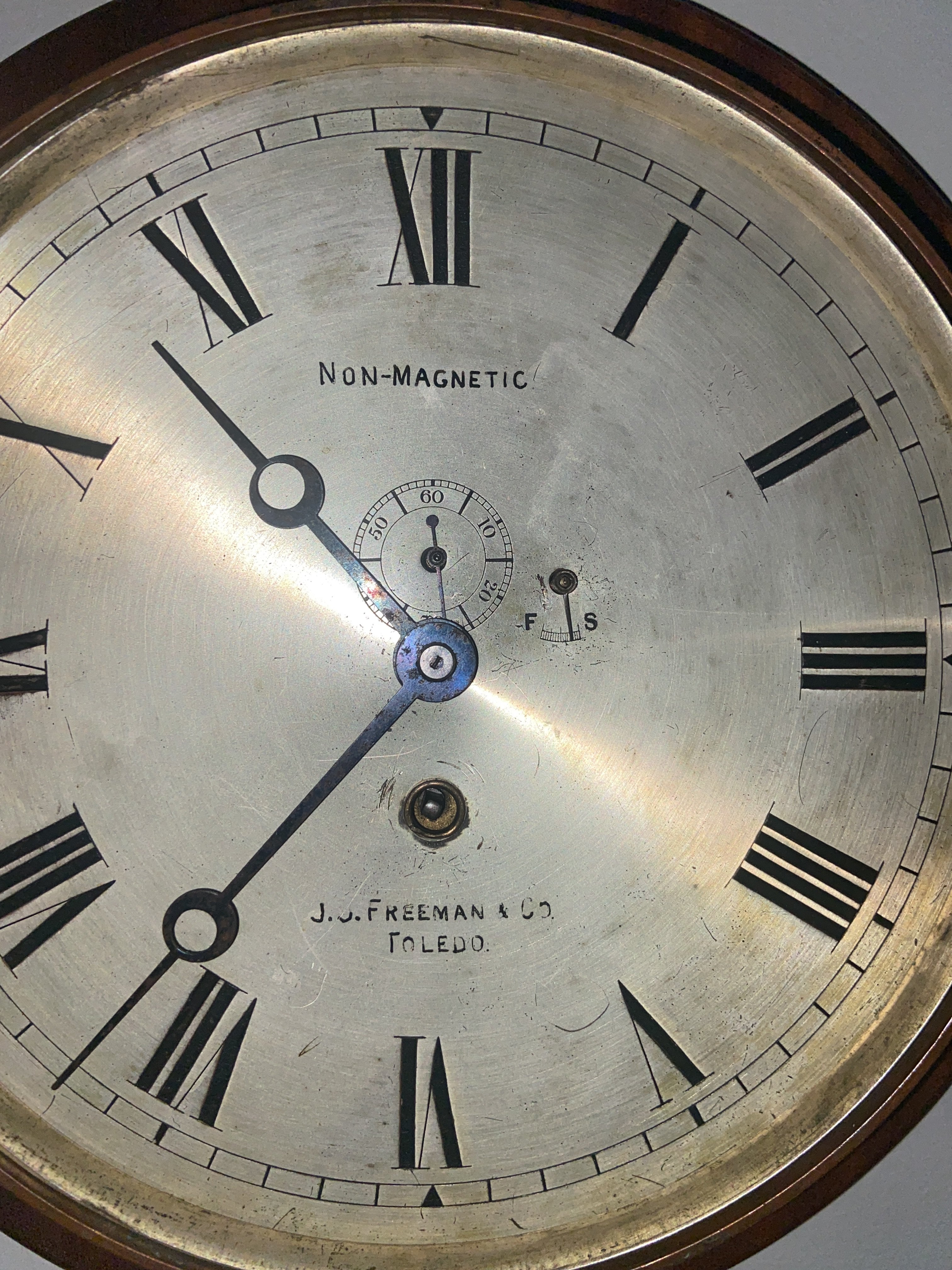THIS EARLY 1907 CHELSEA SHIPS CLOCK IN BRASS IS SUPERB(114 YEARS OLD). THIS CLOCK WAS RUNNING BEFORE THE TITANIC WAS EVEN ORDERED. ,HEAVY FORGED BRASS CASE WITH HINGED BEZEL!!ORIGINAL SURFACE NUMERALS ENGRAVED / SIGNATURES PAINTED SILVERED DIAL WITH ROMAN NUMERALS!! WITH SMALL BIT SECOND HAND ,5 DIGIT SERIAL #17991. ACCORDING TO CHELSEA CLOCKS SALES RECORDS SOLD TO J.J. FREEMAN & COMPANY JUNE 27 1907 AND IT WAS LISTED AS A 8 1/2 MARINE MECHANICAL CLOCK. YOU CAN SEE THE DIAL IS SIGNED WITH THE DEALERS NAME AND THE MOVEMENT WAS ALSO UPGRADED ( EXTRA 3$ IN 1907) TO "NON-MAGNETIC" AND IS SIGNED ON THE DIAL AS WELL AND IS IN NICE ORIGINAL CONDITION, WITH JEWELED ESCAPEMENT,UNIQUE CHELSEA STYLE HANDS AND SMALL BIT SECOND HAND ,THE 8 1/2 INCH 12 HOUR SILVERED DIAL . THE CLOCK HAS BEEN IN MY COLLECTION FOR YEARS. AMERICAN MADE CHELSEA MOVEMENT WITH MACHINE CUT PINIONS AND WHEELS,NON MAGNETIC BREGUET TYPE HAIRSPRING AND COMPENSATED ESCAPEMENT, VERY HIGH GRADE PRECISION TIMEPIECE,FEEL FREE SEND A PM,WITH ANY QUESTIONS OR CONCERNS ,IT IS A GREAT PIECE OF HISTORY! THE INGENUITY AND WORKMANSHIP OF CHELSEA AMERICAN TIME PIECES IS KNOWN THROUGH OUT THE WORLD,CLOCK RUNS AND KEEPS TIME,THE SLOW/FAST ADJUSTMENT IS ACCESSED ON THE DIAL FACE.