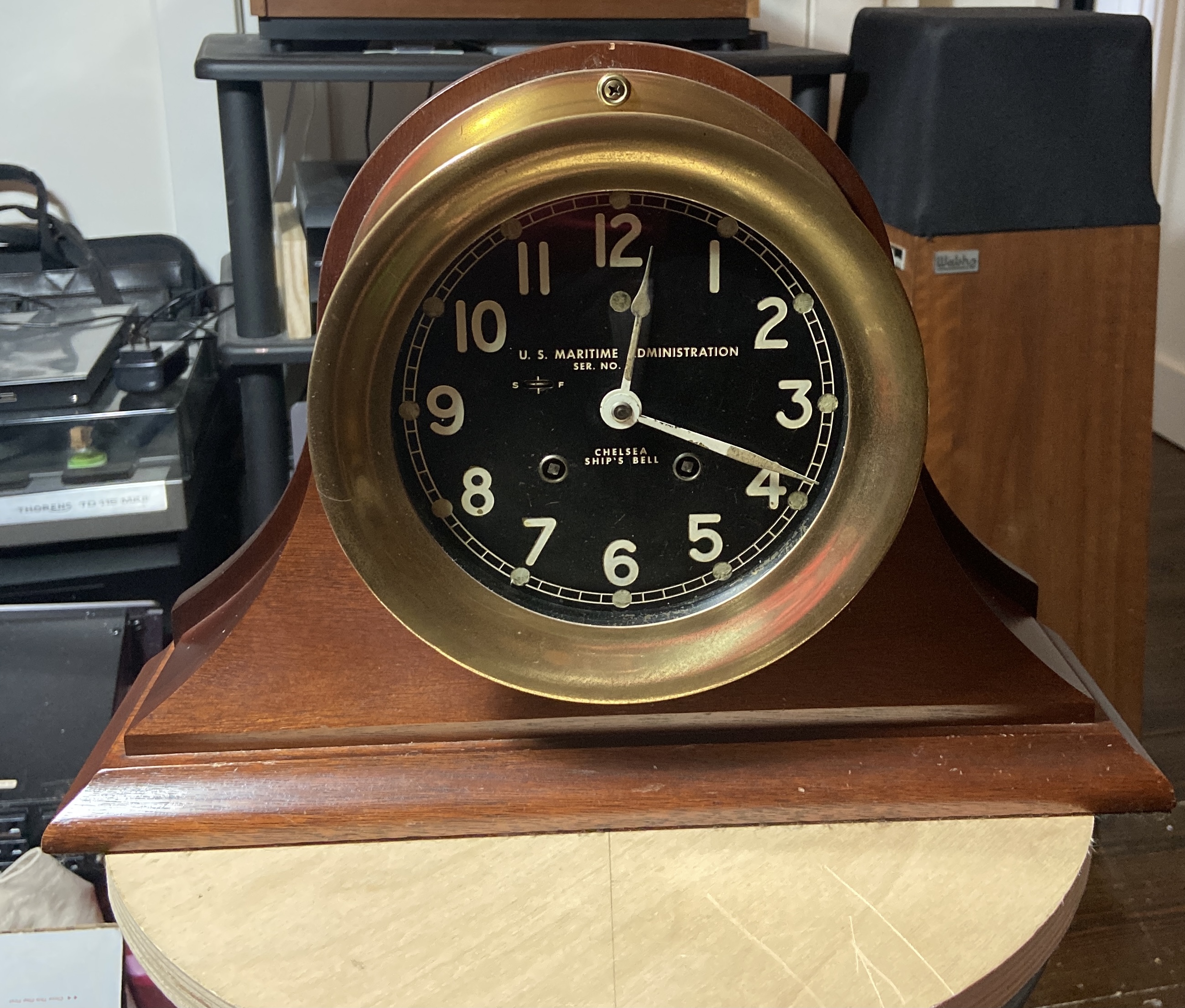 I have a killer 6 inch dialed Chelsea Maritime Administration SHIP’S BELL. Signed Chelsea brass case circa 1959 . Chelsea 4L movement Running and keeping time and striking ships bells . It is mount on on a Chelsea ribbon mahogany cradle. It’s ready for your bookcase or mantle over your fireplace !