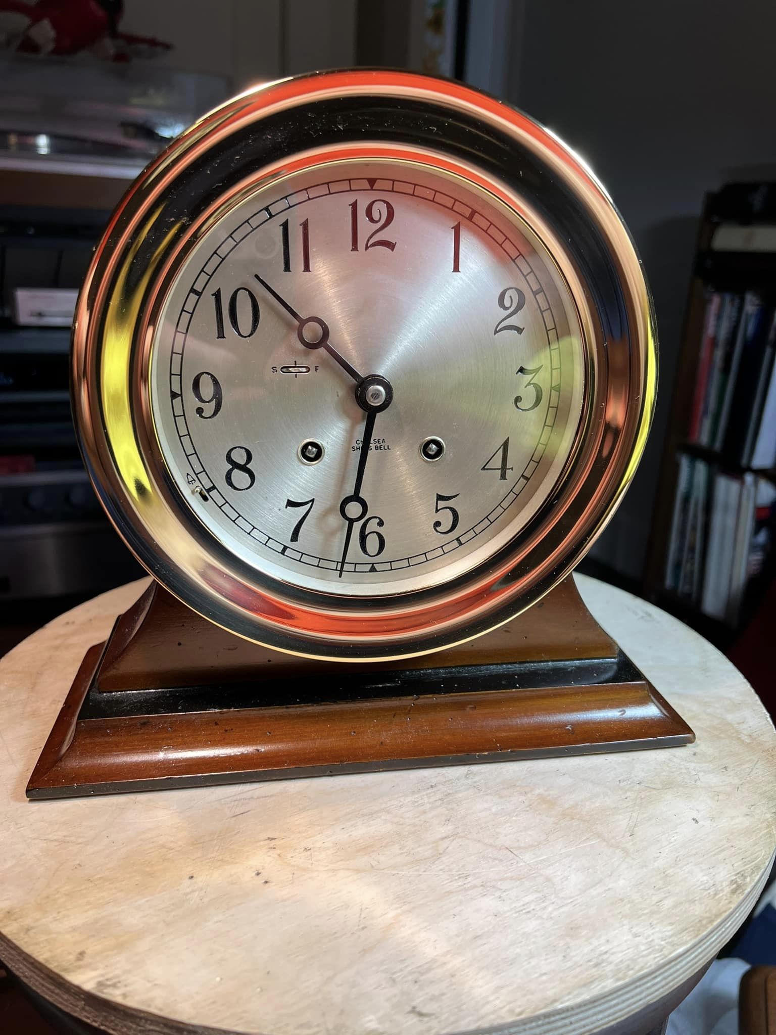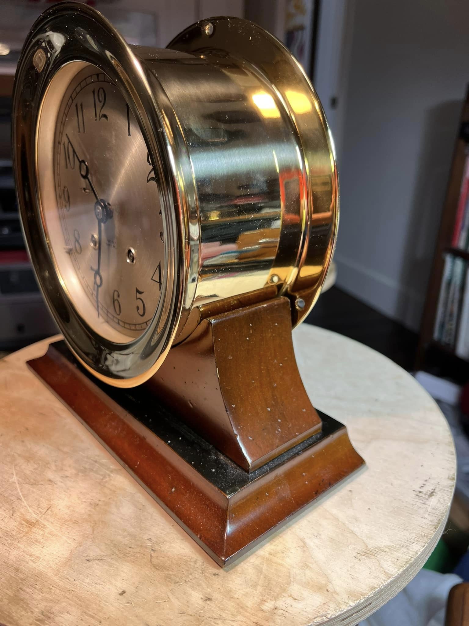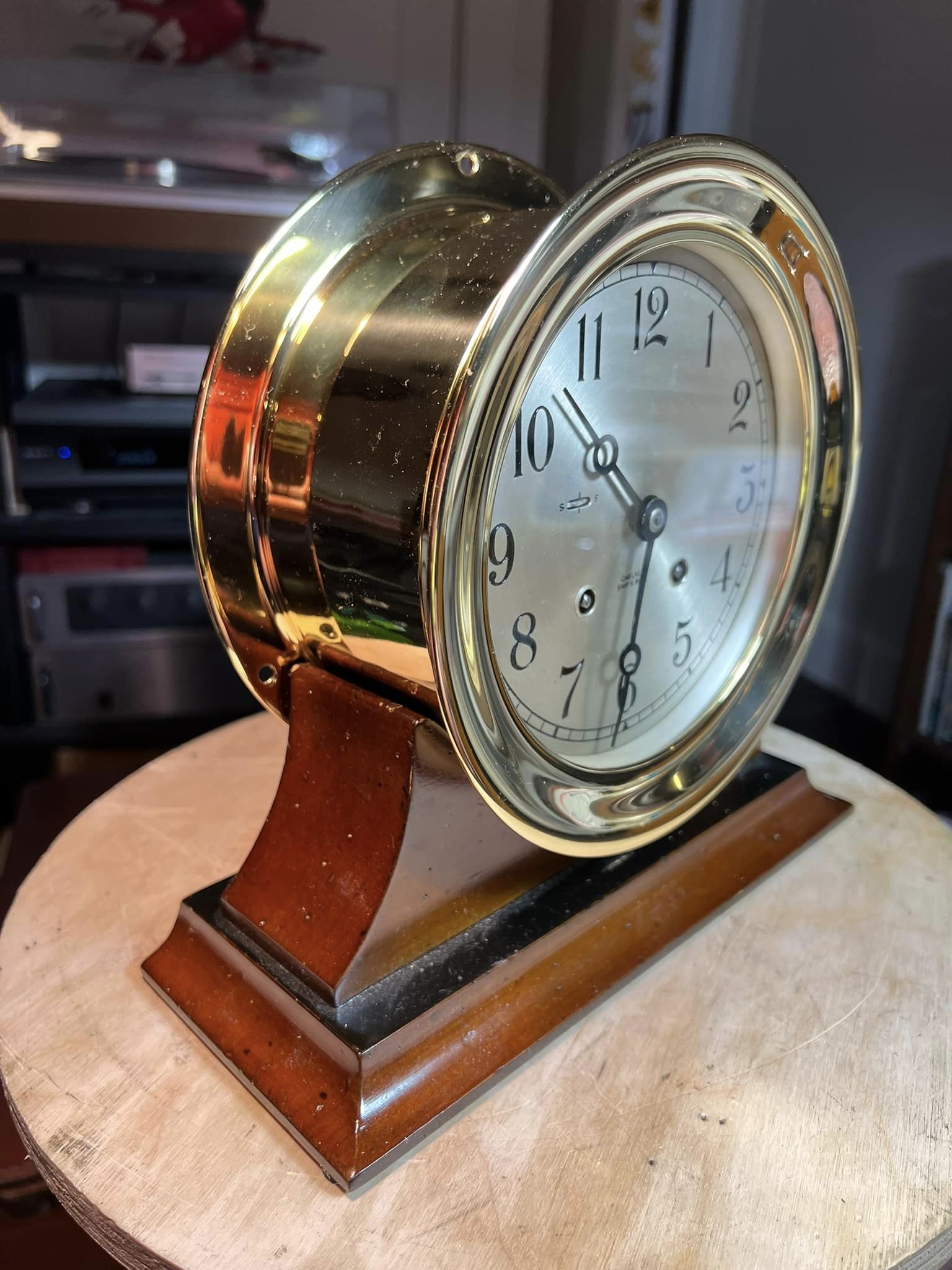 THIS 1970 CHELSEA SHIPS BELL CLOCK WITH HEAVY FORGED BRASS CASE WITH MARINE THREADED BEZEL IS SUPERB !!,! SERIAL NUMBERS MATCHING #748528. THIS CHELSEA SHIPS BELL CLOCK . Freshly polished, lacquered and fully serviced. Running fine . Dont mind the dust ! hahahaha