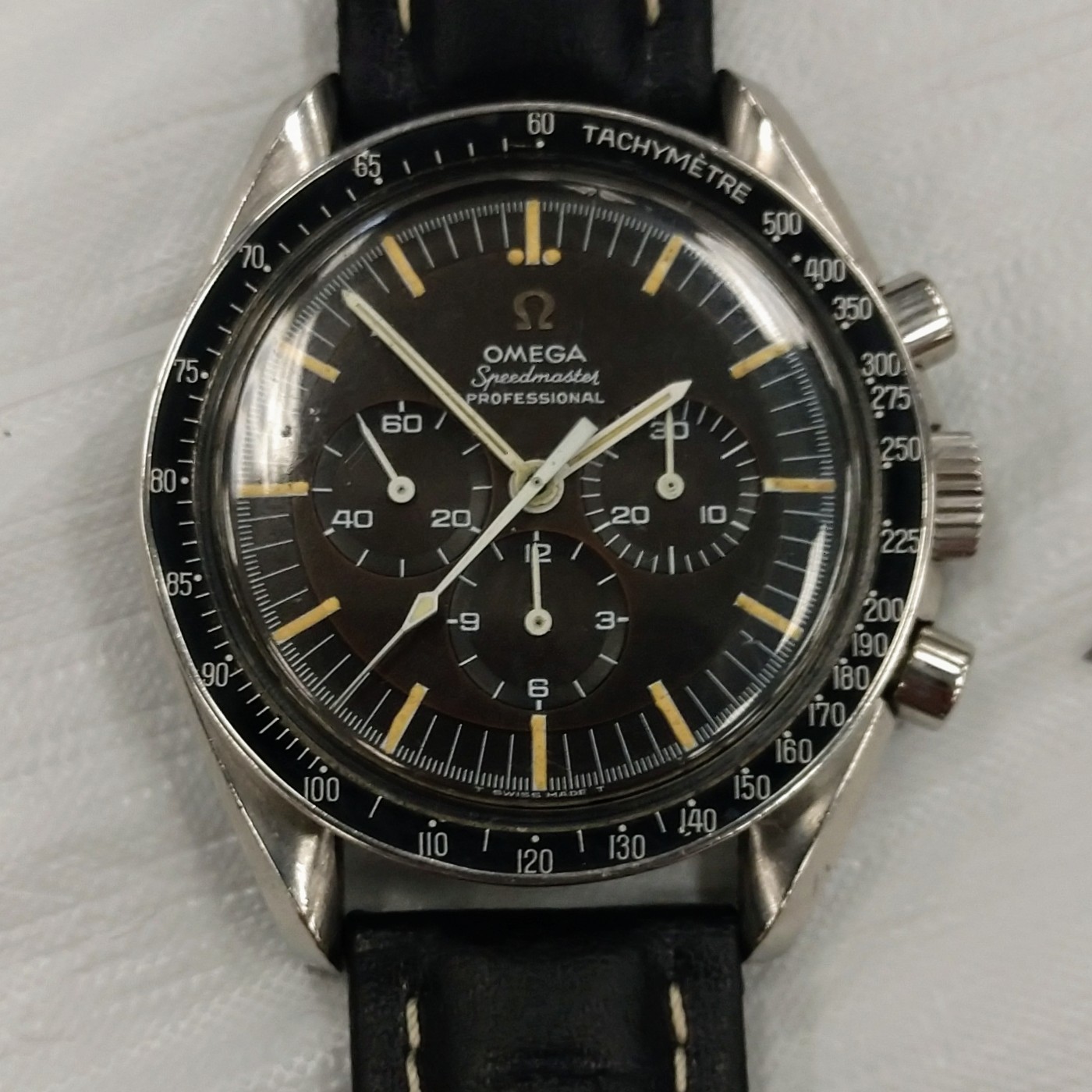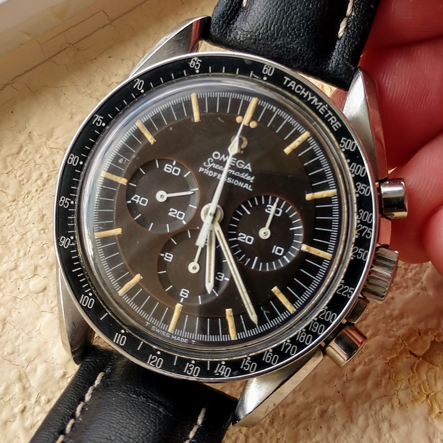 ·Just found this today at a watch show... from the sharp-eyed dealer who picked it up from the initial seller's table just one millisecond before I could grab it myself. Fortunately my lack of hand speed didn't cost me too much money. The original seller's pricing was, shall we say... uninformed. And after agreeing to the middleman's quick and extremely modest profit, the watch is mine.