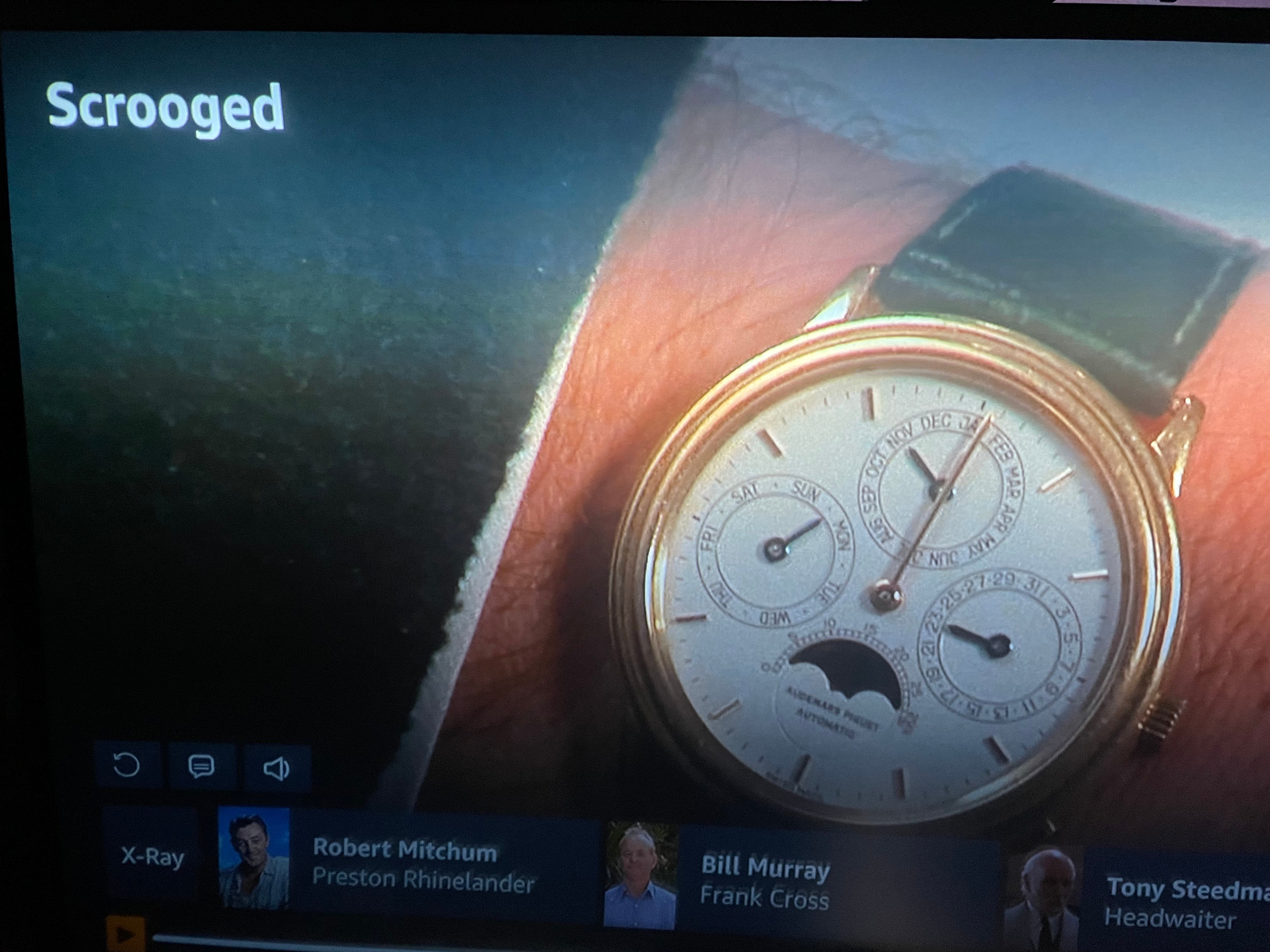 Posts 18,068 Likes 27,382 Foo2rama ·Dec 25, 2021·Nowhere near as grumpy as he used to be... Sure if you spot them go ahead and post them. This is a prominent shot on Bill Murray's wrist on Christmas Eve in Scrooged. Audemars Piguet Quantieme Perpetual Calendar Wristwatch 25657BA Gotta love the facepalm on this one...