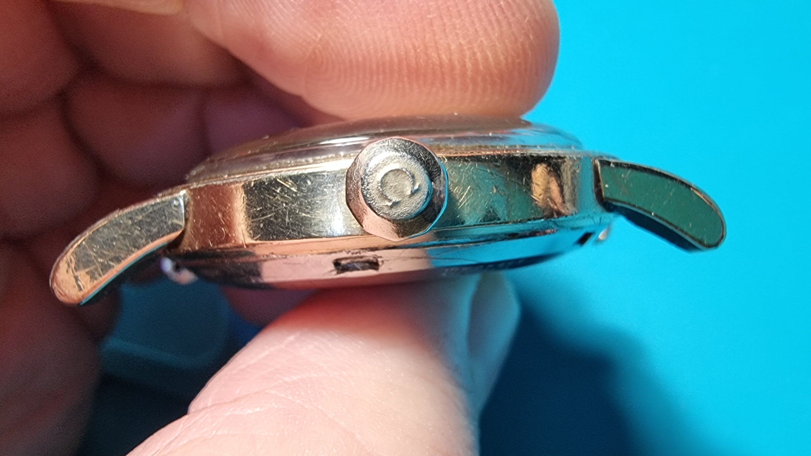 These are the photos published in the advertisement, and although we already know that the quality can be quite bad due to the compression that the buying and selling websites exert on these files, several things could be perceived from them: the gold plating appeared be quite scratched and even, if we looked closely, one could sense that the upper faces of the ends of the lugs were already peeled; It was also apparent that the crown, which according to the seller is the original of the watch (at least it is Omega signed/original and seems correct to me for that era, although I am more familiar with having seen them on Constellation models), had lost all of its gold plating; There were also several scratches on the plexi and what appeared to be a break on its external perimeter in the 11 o'clock area; In the same way, if we were to draw an imaginary straight line that went from the center of the axes of the hour and minute hands to the applied 4 o'clock index, we would find a round spot located halfway between the aforementioned elements; This stain, along with other smaller ones that could be seen on the subdial of the seconds hand, could not be known, from these photos, if they were on the dial or on the plexi; You could also distinguish what appeared to be dirt, or damage, on the dial at the lower end of the applied 1 o'clock index and on some other indexes. But perhaps the most noticeable of all was the misalignment suffered by the hands, since for the displayed time of approximately 10:10 hrs., the hour hand should have already surpassed the applied 10 o`clock index, which as we can see it has not done...and these are only some problems that this unit suffered from, as you will see next.