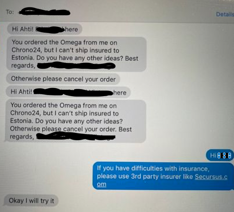 He bought a nice Omega chronograph from Chrono24.com from a very respected seller. Like top level guy.