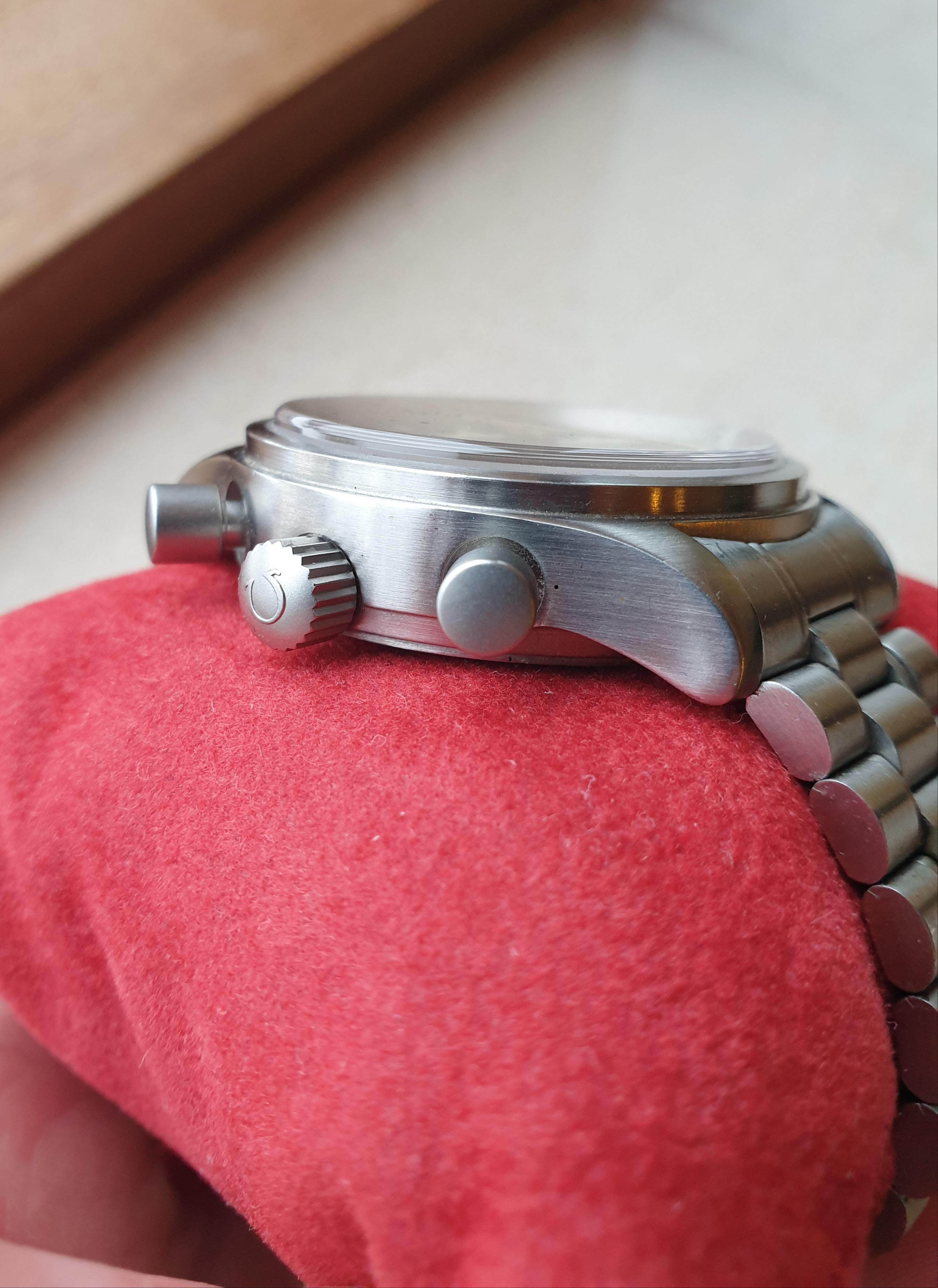 The all brushed 38mm stainless steel case is without any marks except for one or two microscopic marks which I couldn't photograph. In effect, the watch is without any flaws, as is sapphire crystal, pushers and the screw-down crown.