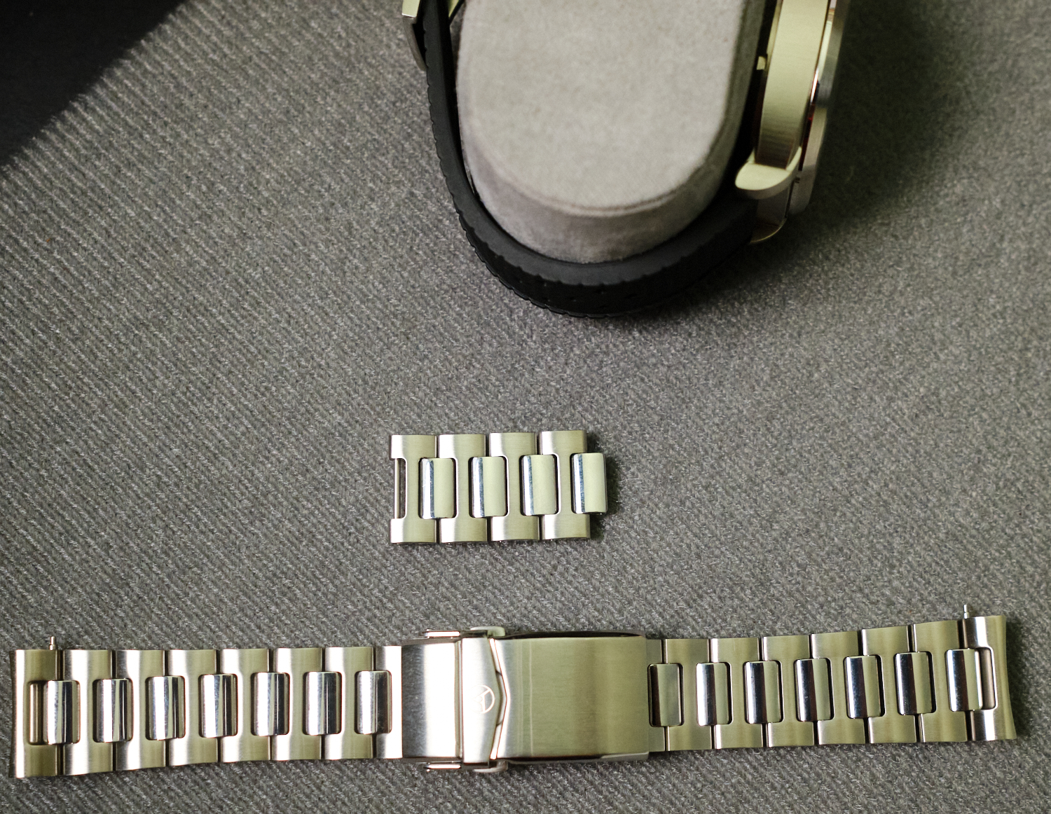 - Solid stainless steel H-Link bracelet with quick exchange system, screwed links (incl. screw driver) and milled safety clasp with 6 micro adjustments