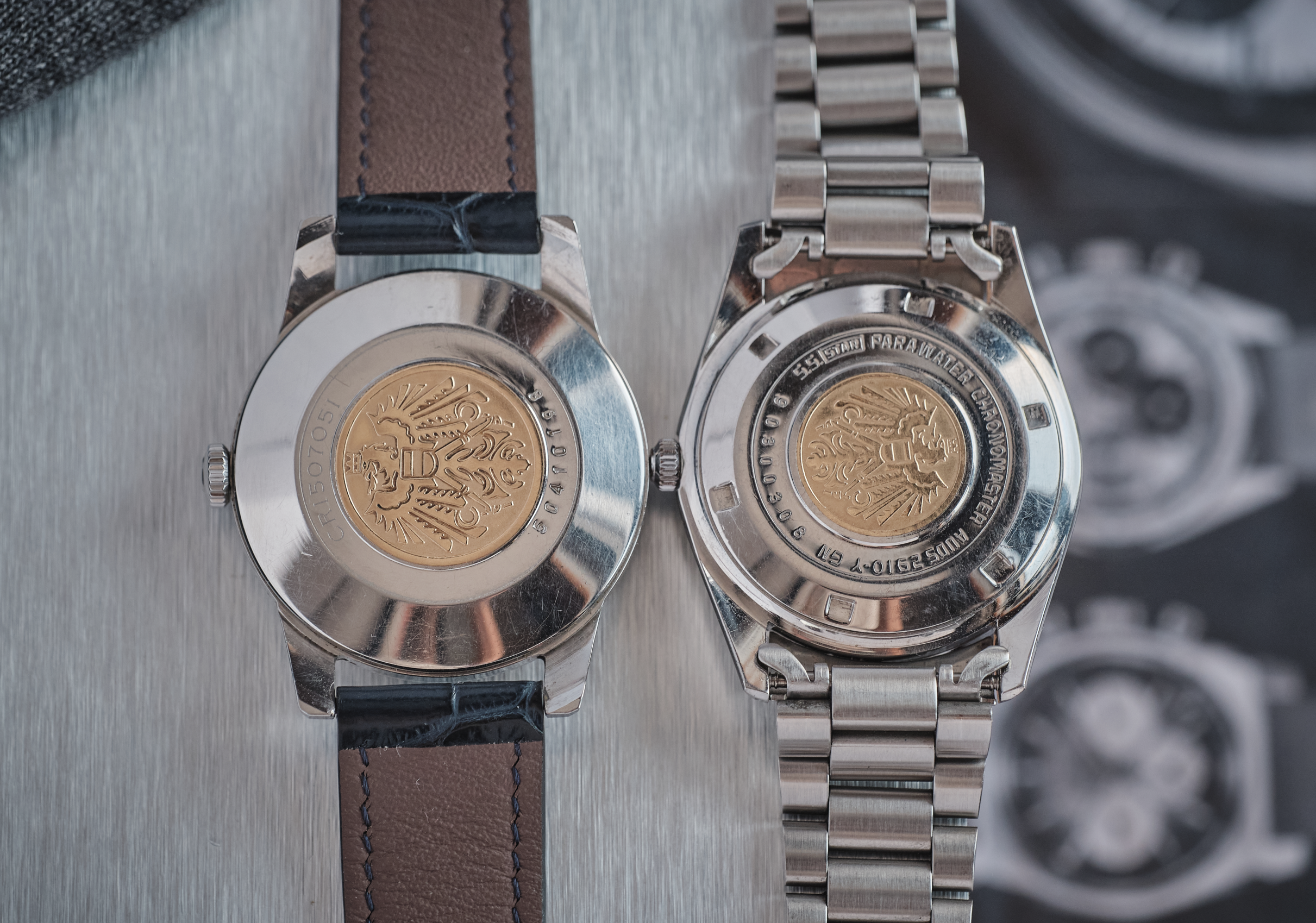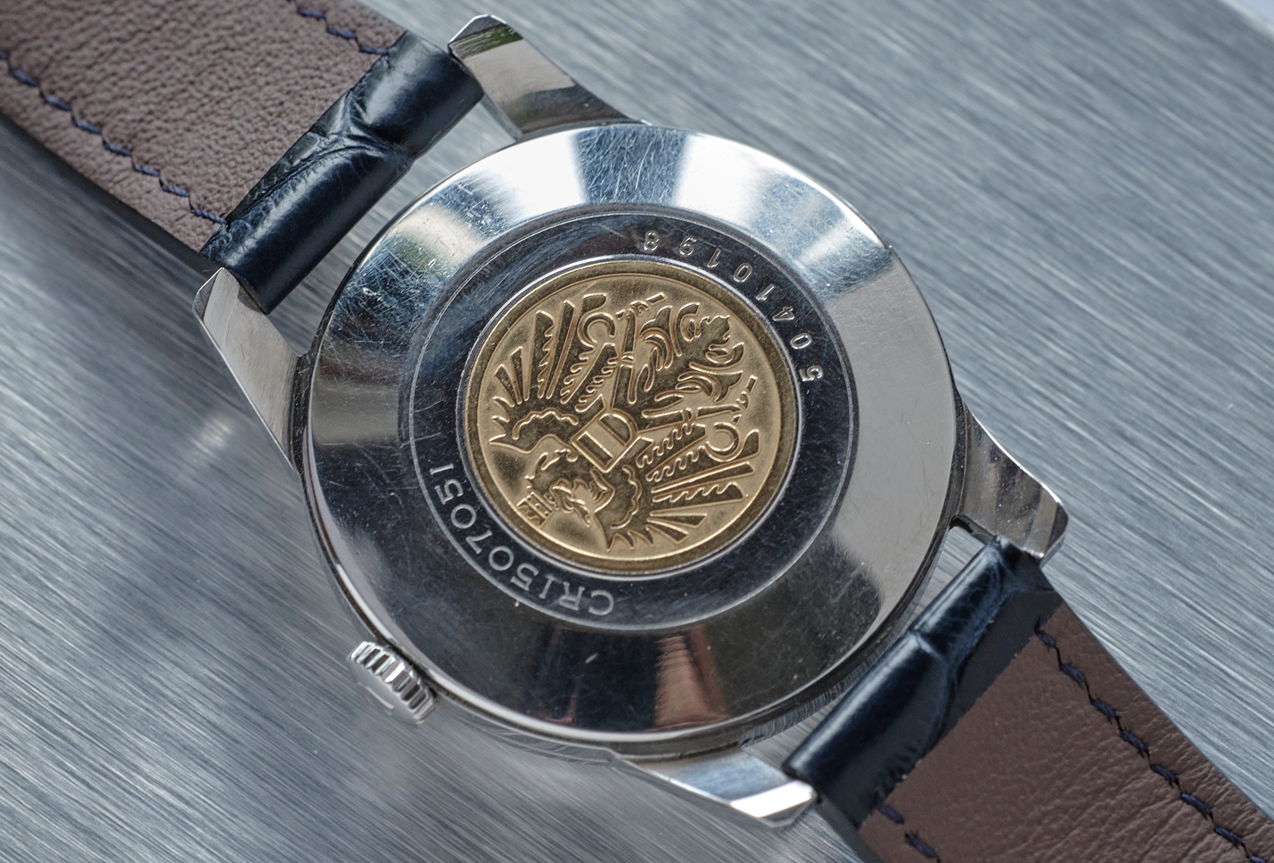 The back cover contains a gold medal with an eagle mark. This model was the first Citizen product to feature an eagle, and the eagle mark is still used today on flagship models.