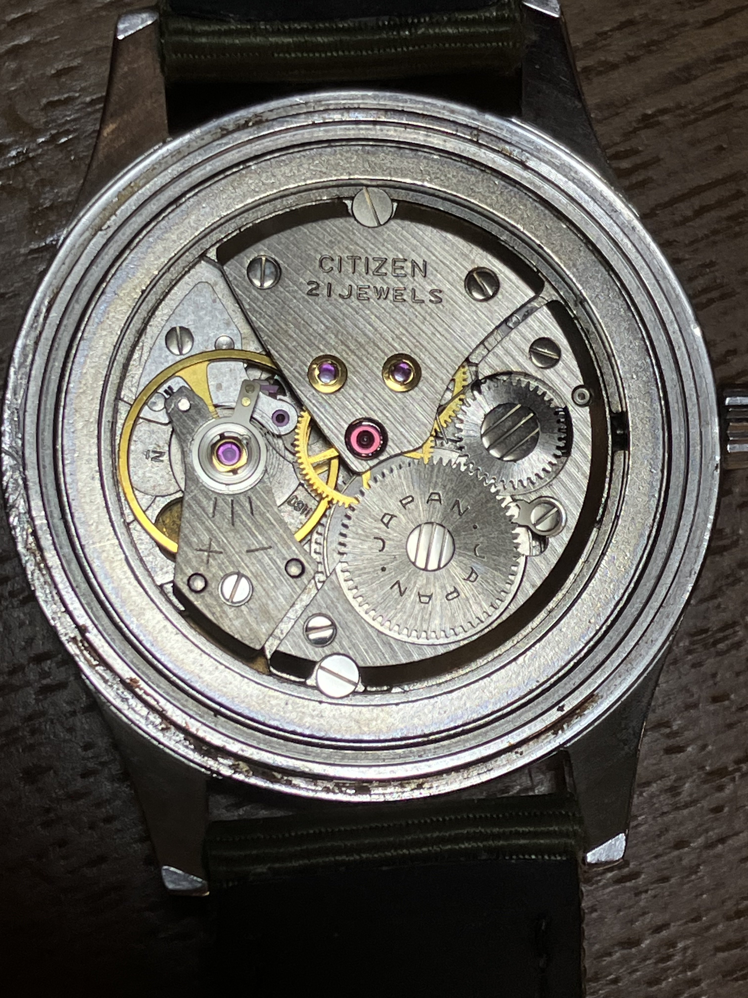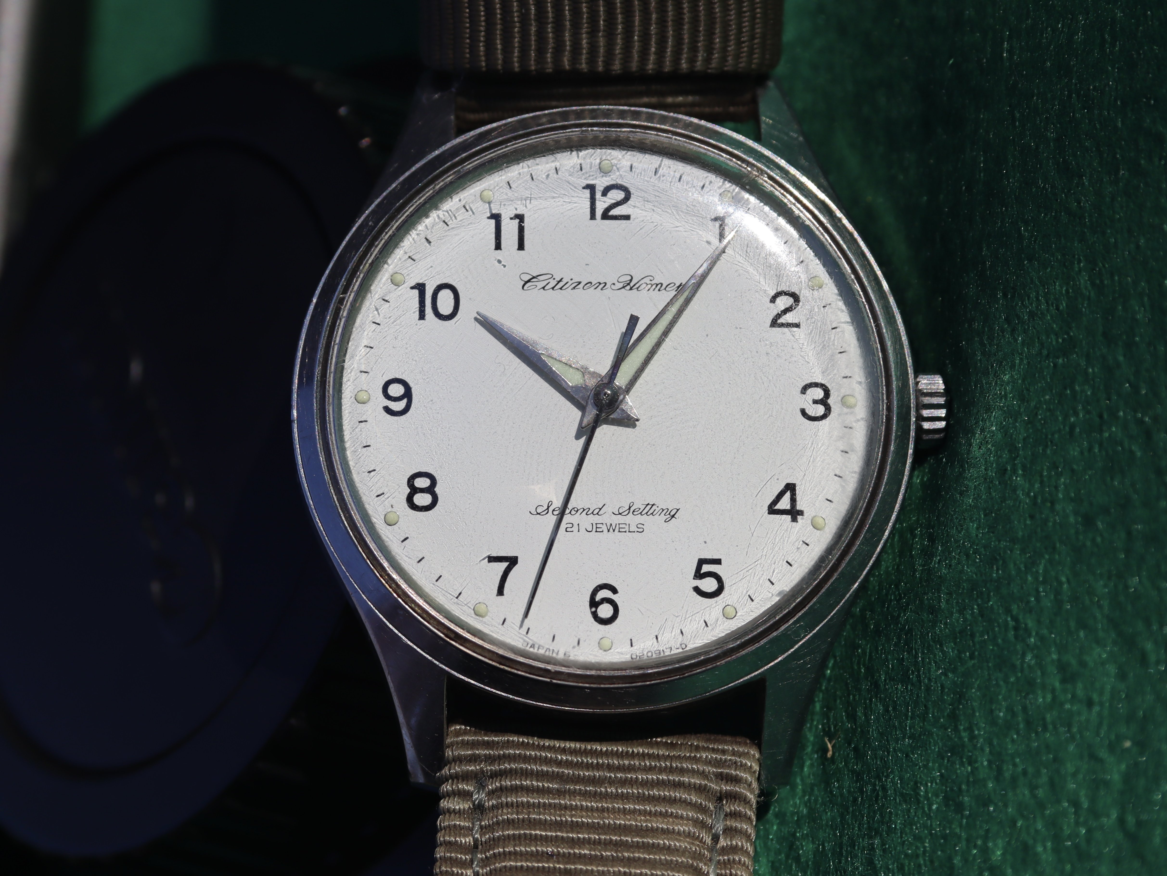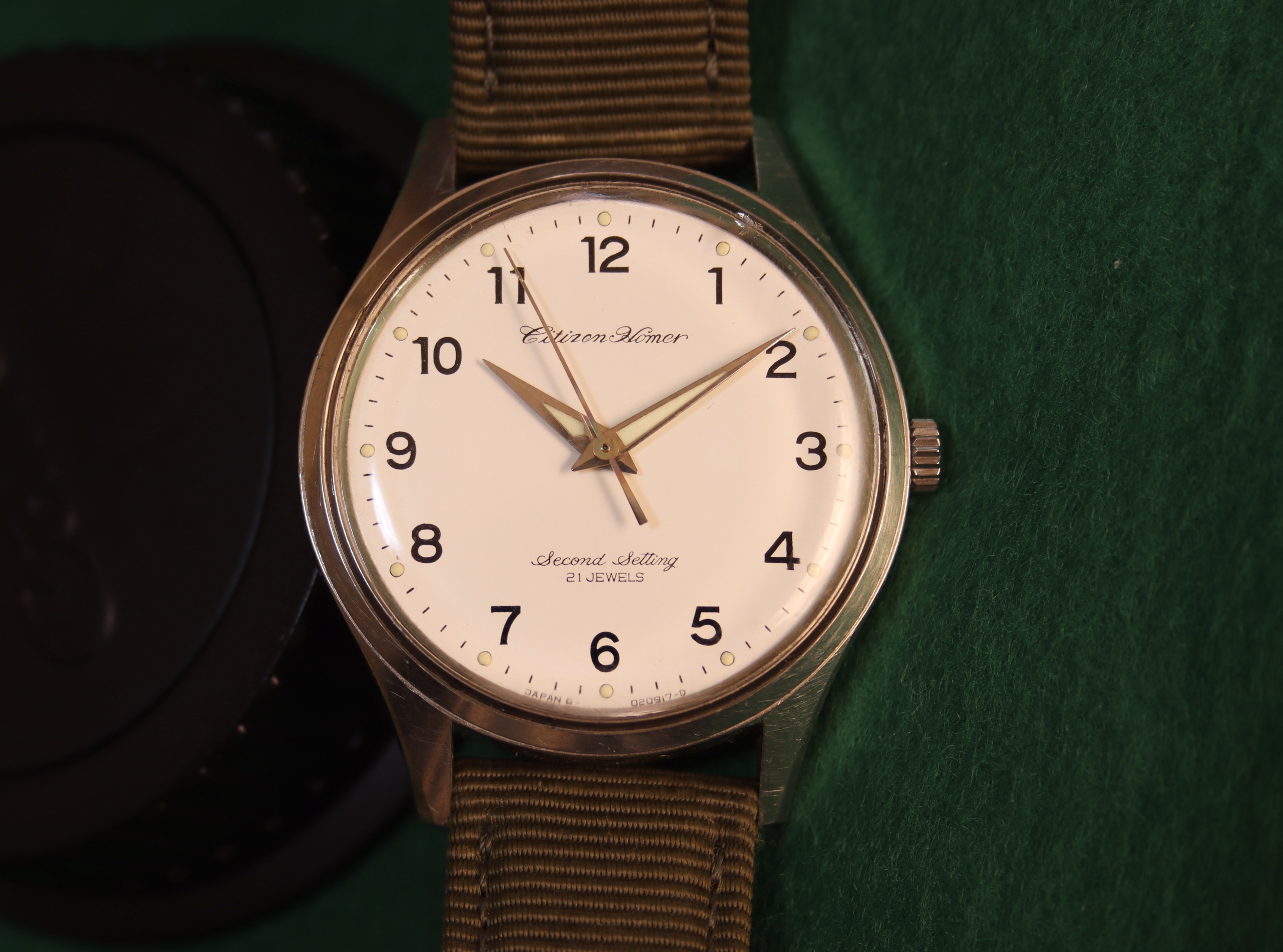 ·Up for sale is another of my Citizen Homer watches. Cribbing with abandon from my earlier sales post: Citizen Homer watches were issued to Japan National Railway workers in the 1960s and 1970s. They have a beautiful design, with a hacking movement and the year of issue and the train line they were issued for stamped on the back. The old national railway went through myriad changes and upheavals before finally being privatized, mostly morphing into different divisions of the Japan Rail behemoth that moves millions and millions of us every day all around the country. This means that Citizen Homer watches usually sport the names of bygone divisions of the old system, making them a lot of fun to look up and find out where on the map the watch put in its service.