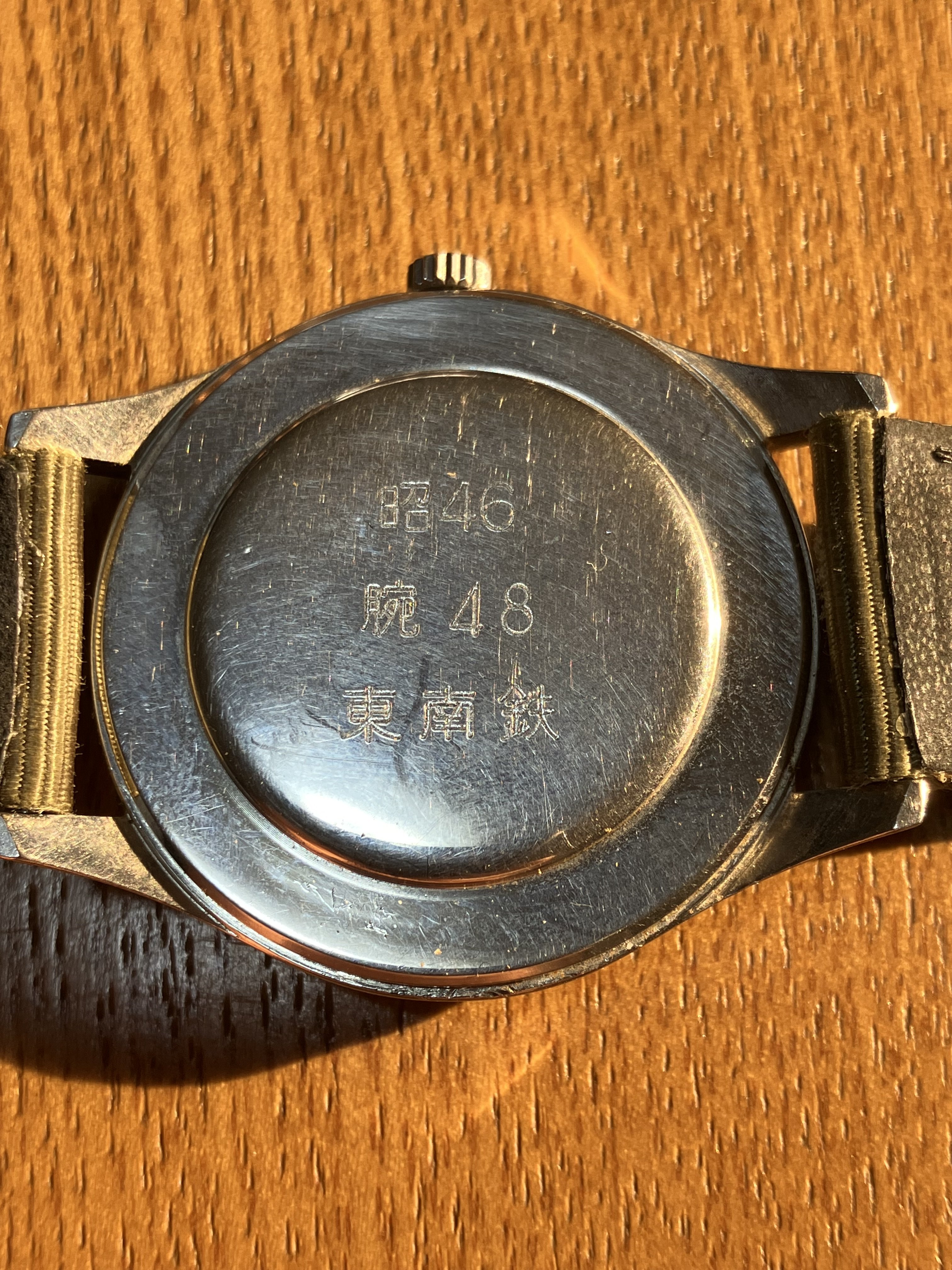 This watch was issued in 1971 to the Tokyo Southern Railway division, which covered lines running between Tokyo and Shizuoka prefecture, including much of the present-day Tōkaidō line, Yokohama line, and the Yokosuka line. The stamp on the back reads: