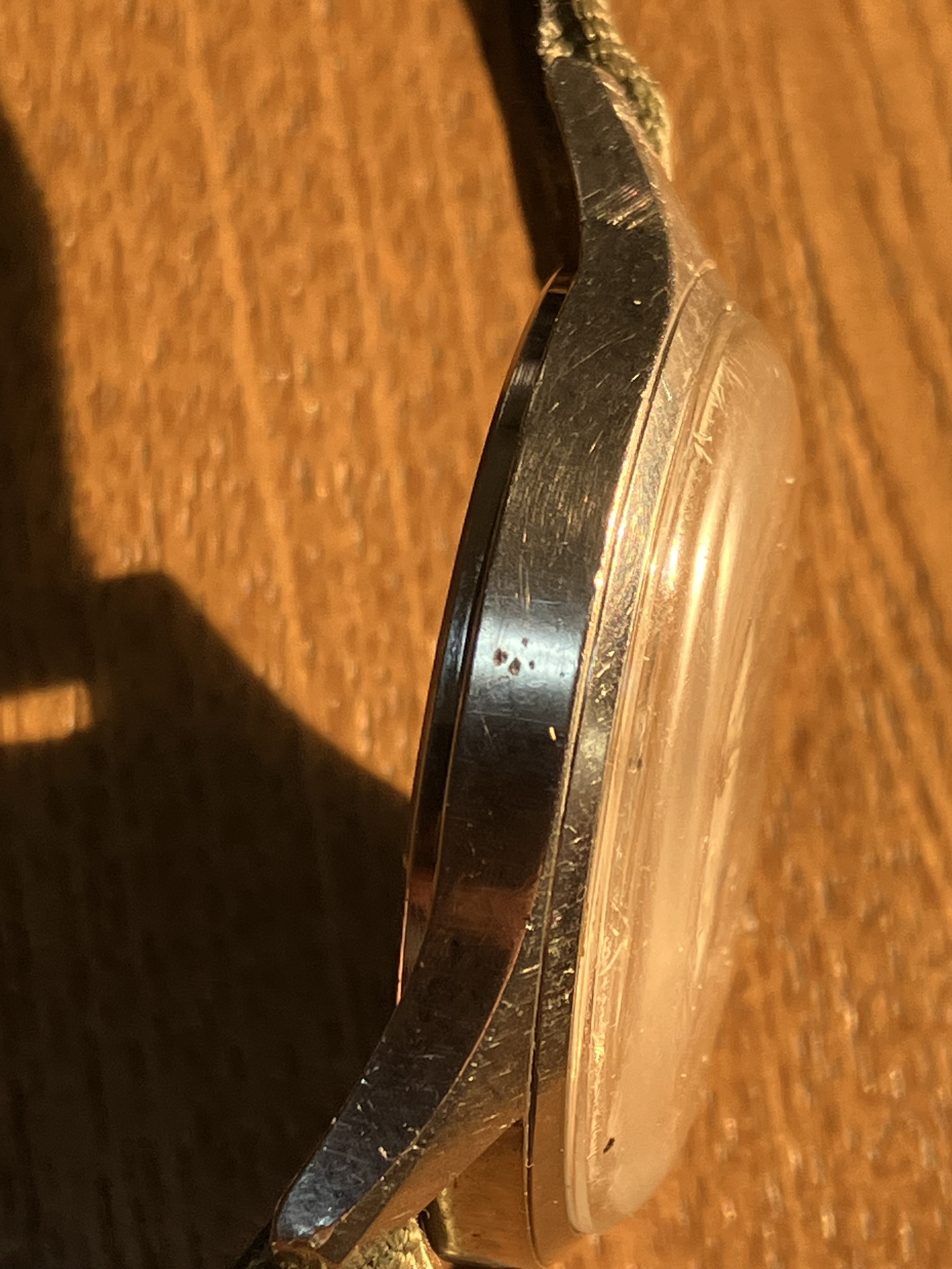 The watch has no service marks inside but seems to be running well. The 36mm case is sharp with lots of evidence of use and a couple of dents, which I tried to focus on in these photographs. The edge of the crystal has a scratch around the one index. The outdoor shots of the dial mercilessly highlight the crystal’s condition. The numbers and script on the dial are crisp and the lume on the indices and hands is a very pale greenish yellow.