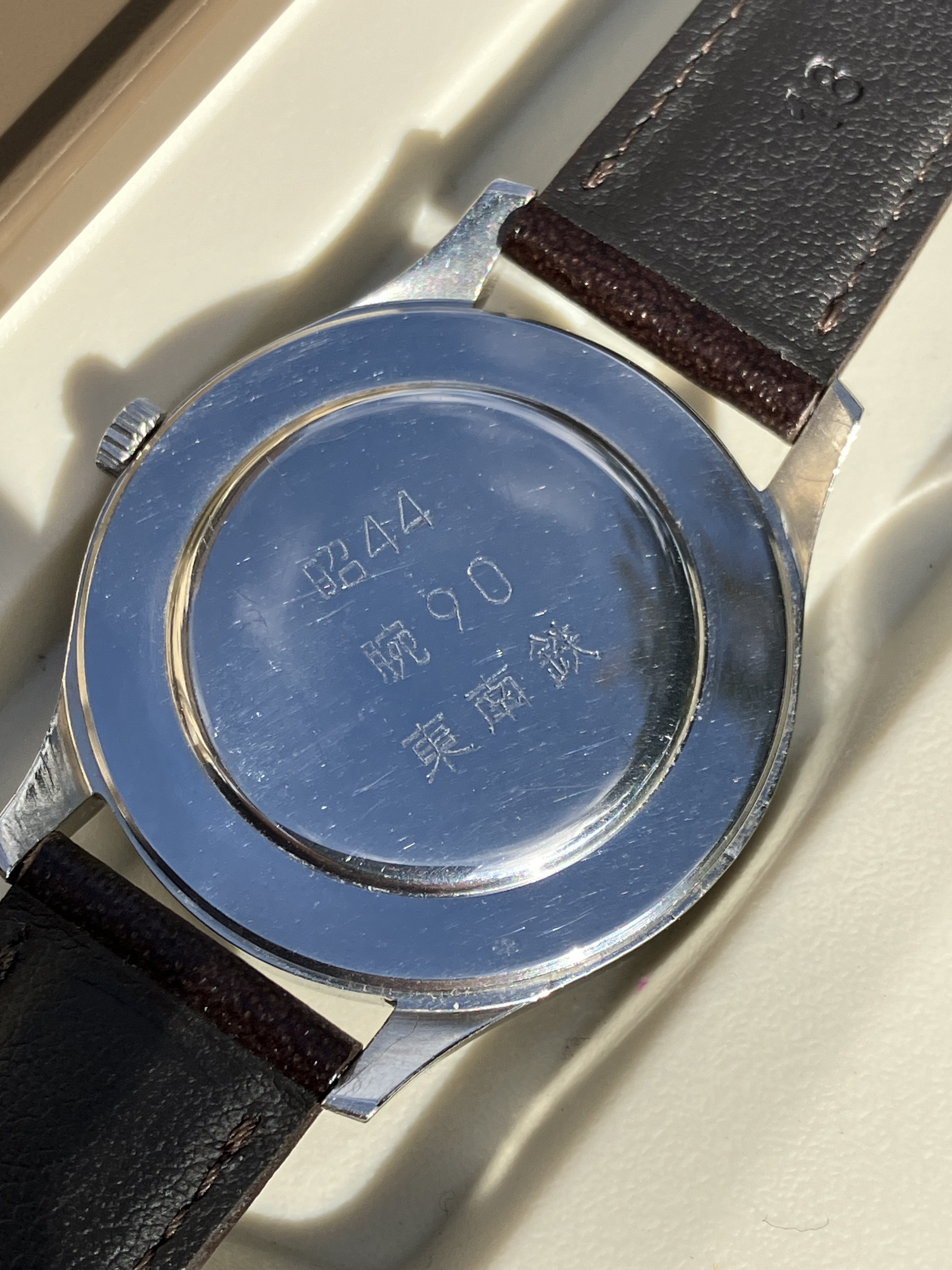 This particular watch was issued in 1969 to the Tokyo Southern Railway division, which administered lines running between Tokyo and Shizuoka prefecture, including much of the present-day Tōkaidō line, Yokohama line, and the Yokosuka line. The stamp on the back reads: