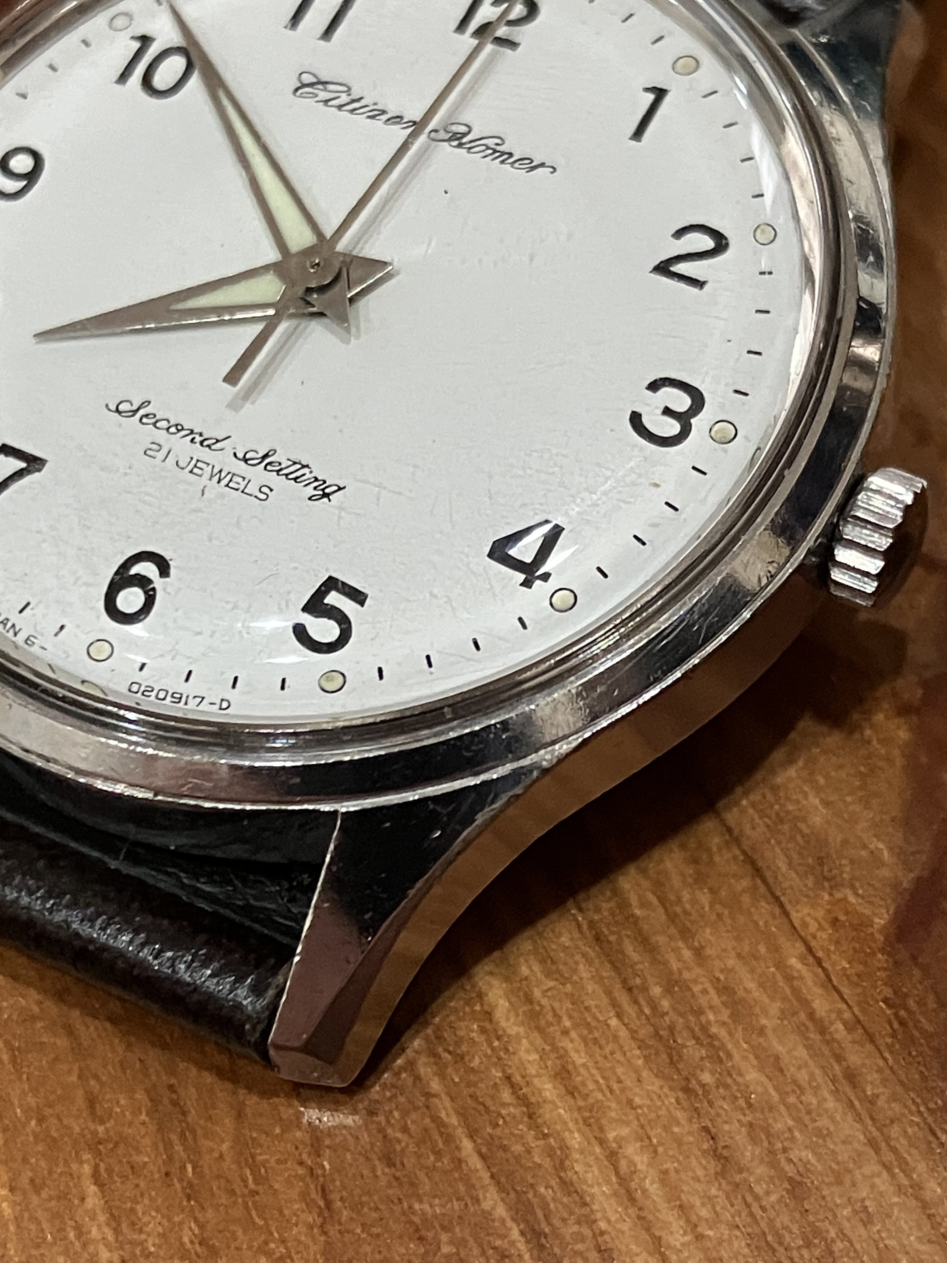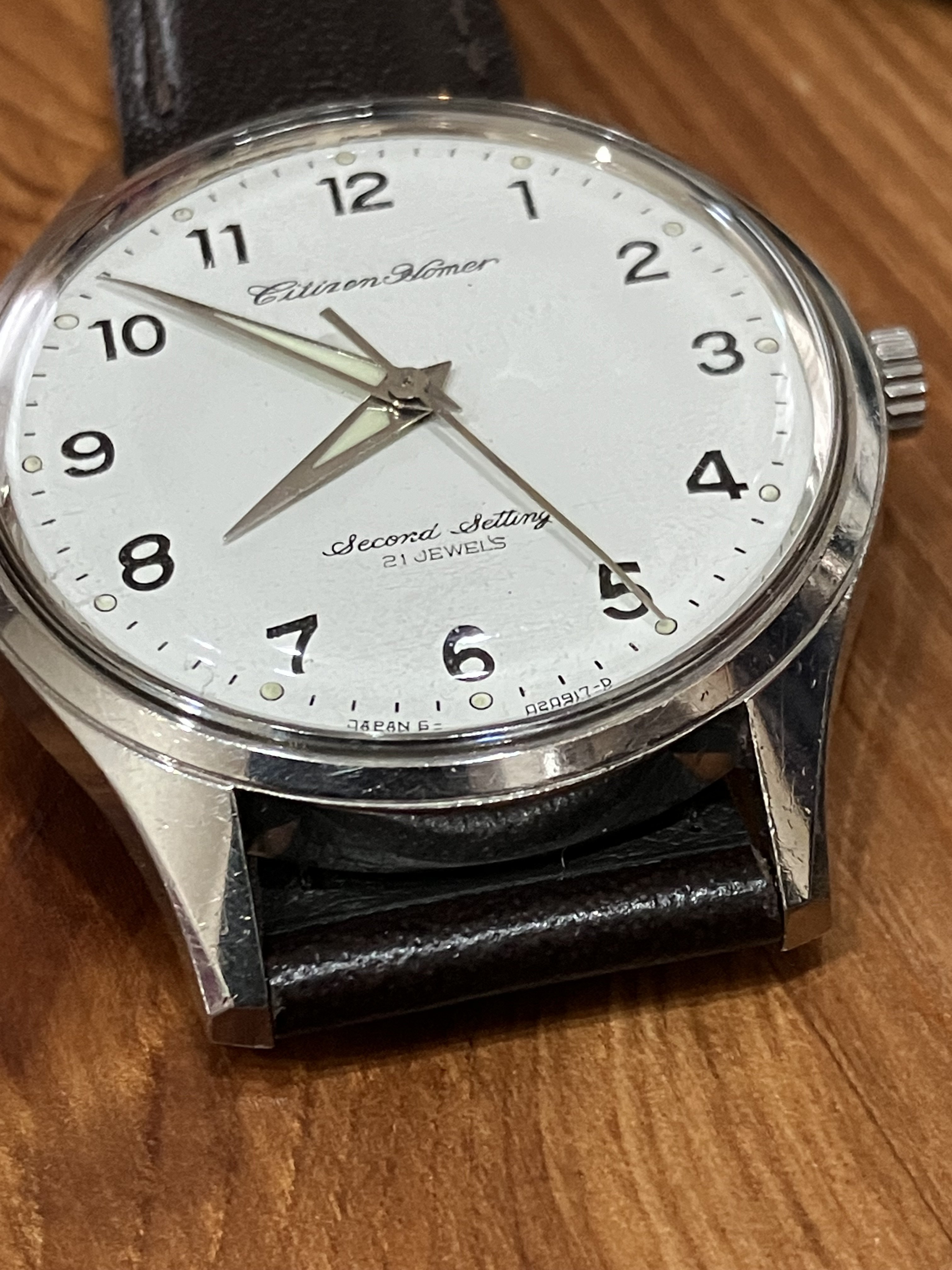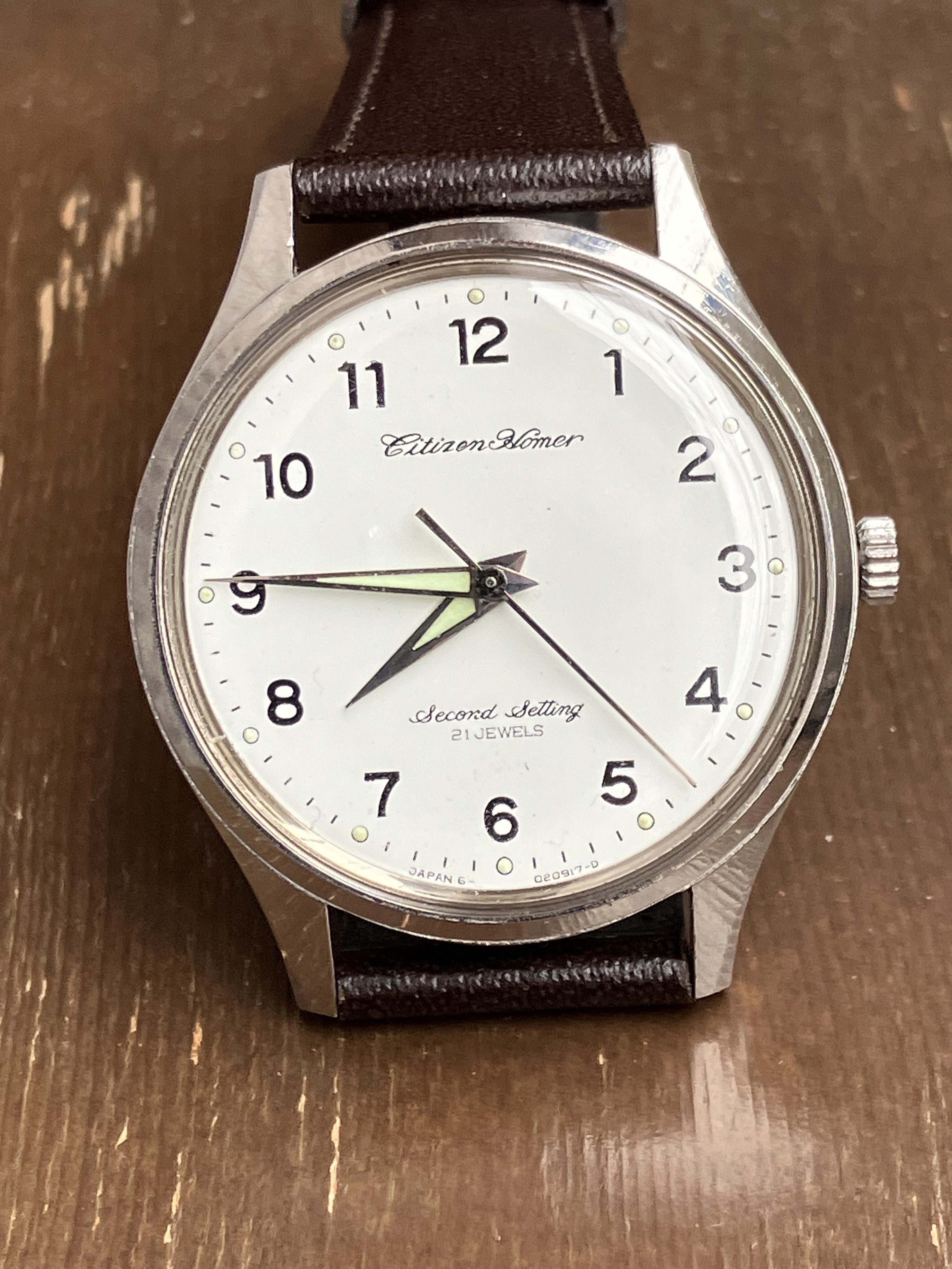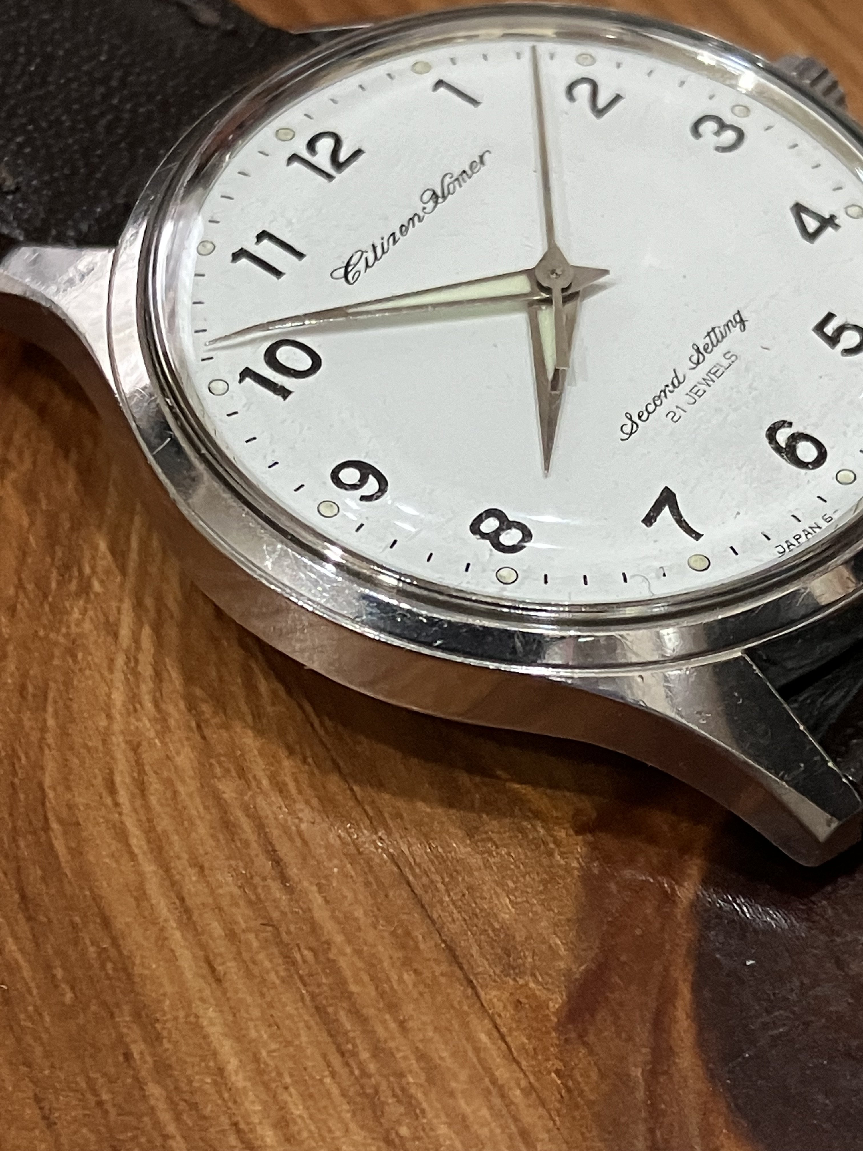 I believe these watches were issued to station employees rather than engineers. Train drivers, even today, carry massive pocketwatches that slot into a wooden holder on the control panel. The name “Homer” might be based on hōmu, “-form,” or station platform. The English “-er,” rendered ā in Japanese, is broadly appended to loanwords like hōmu regardless of whether it makes sense in English (e.g., a guy who drinks a lot is dorankā, a “drunker”). So, the model name seems to evoke the watch’s intended use by “platformists” rather than train personnel. (Citizen made other lines of “Homer” watches that have no apparent connection to trains, so who knows.) “Second Setting” likely refers to the hacking mechanism, which freezes the second hand while setting the time.