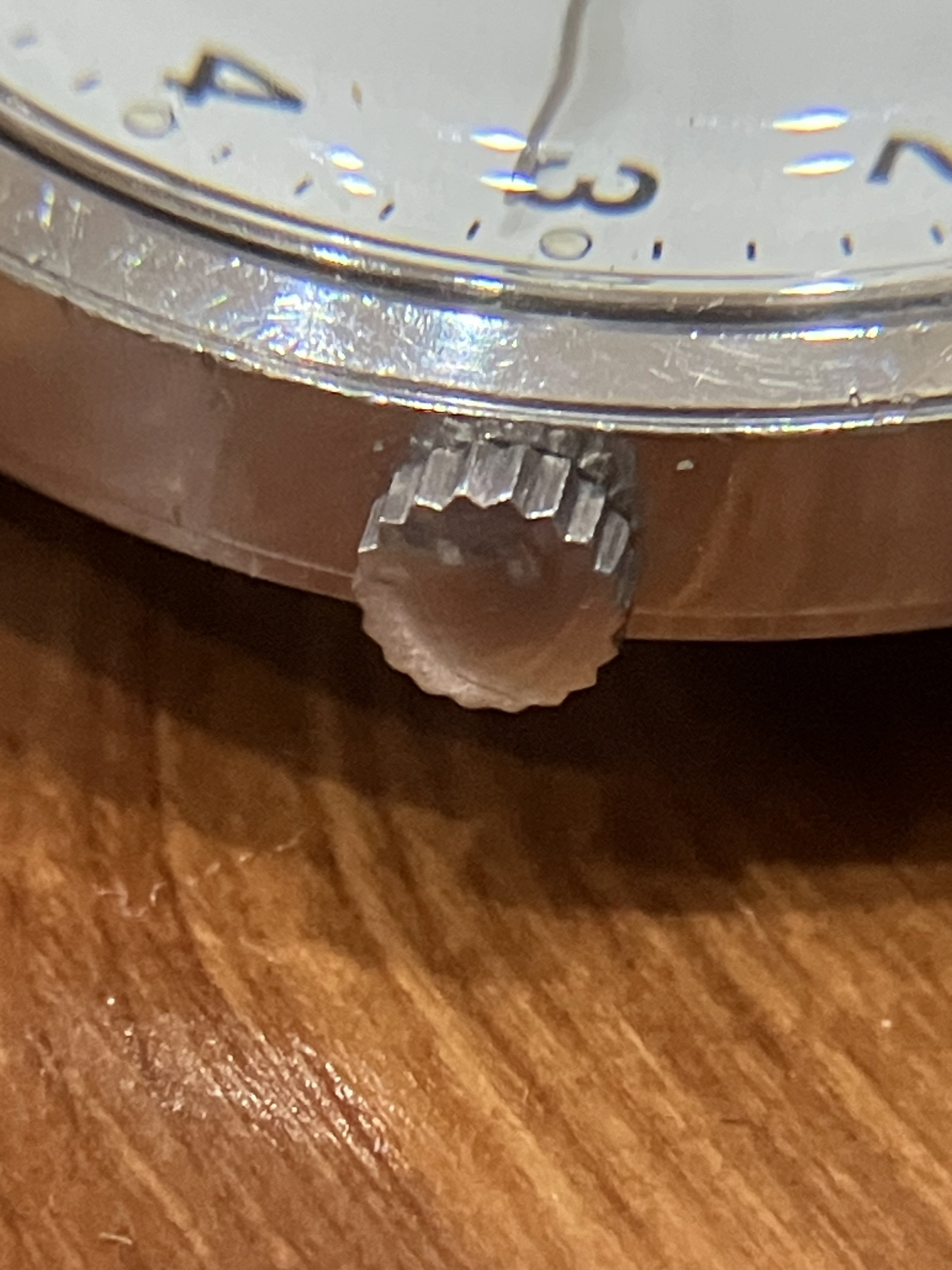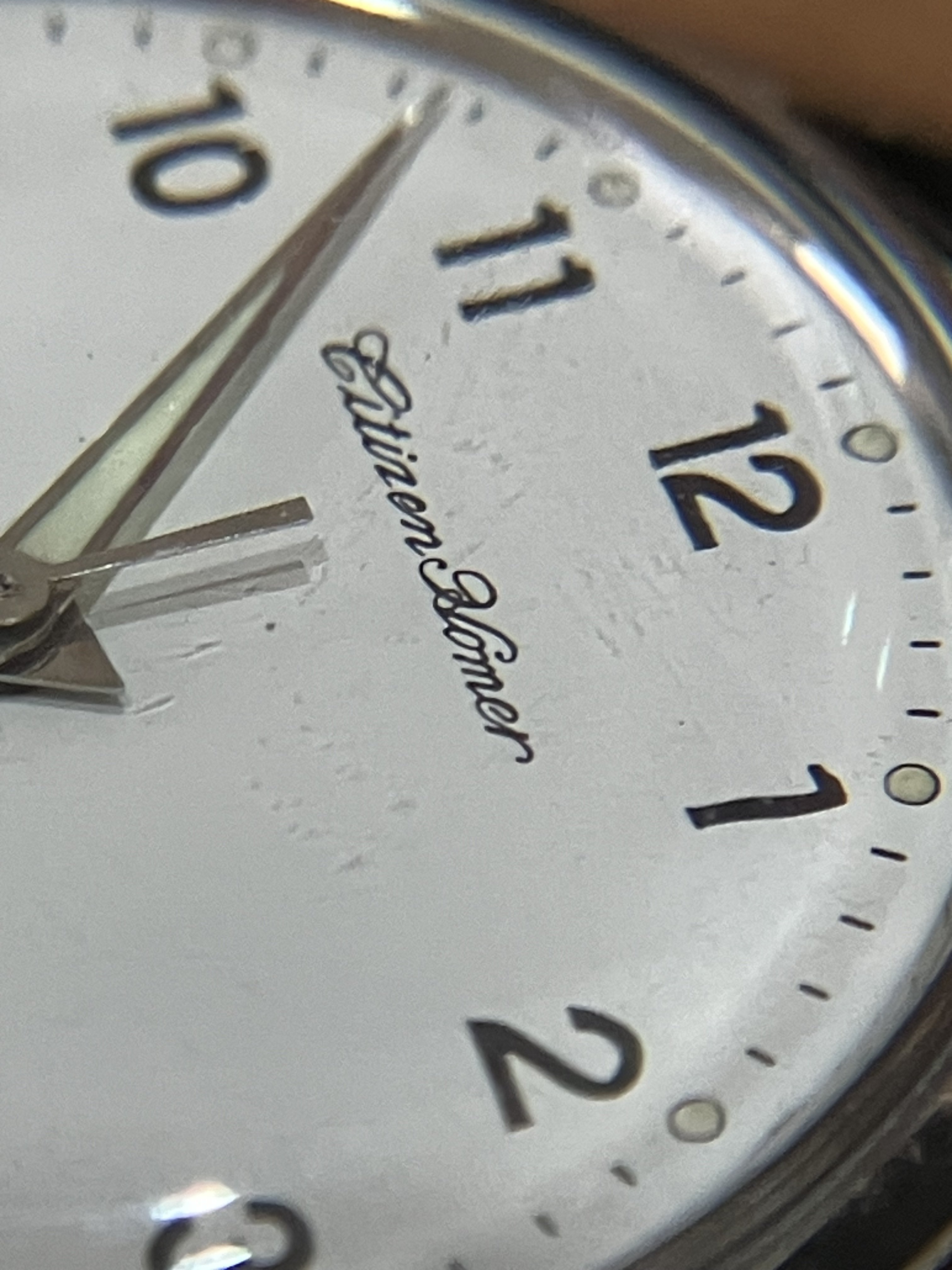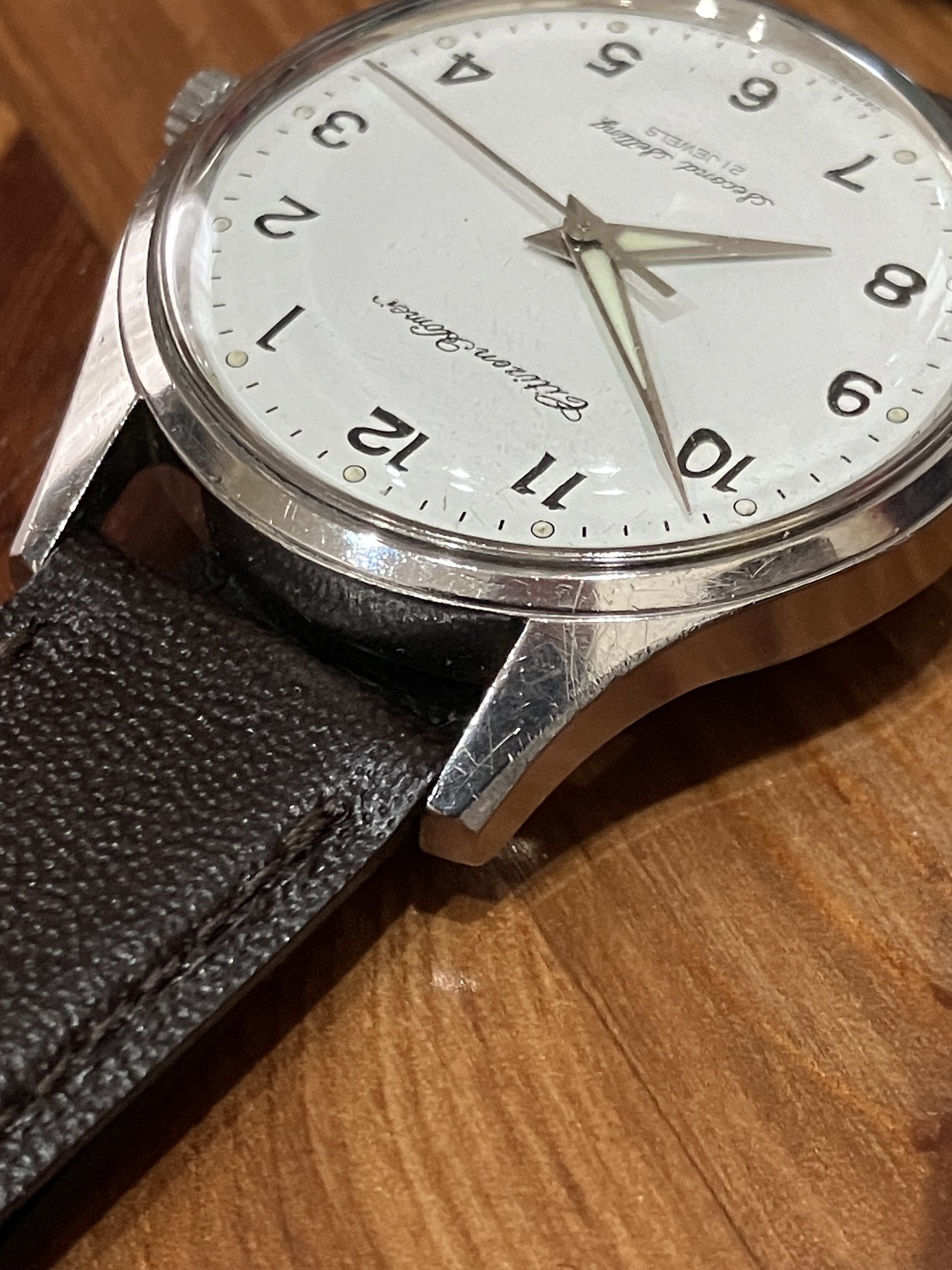 This watch has no service marks; it runs a little fast but better than others I’ve had. The 36mm case on this example is the sharpest I’ve seen, with signs of use and a few dings. The crown has a few dings. The numbers and script on the dial are crisp, with one small break in the printing of the n in “Second.” The dial itself is free of discoloration or unevenness; I haven’t polished the crystal, which makes the dial hard to photograph close up. The lume on the hands and indices, which often turns minty green, has remained a very pale yellow.