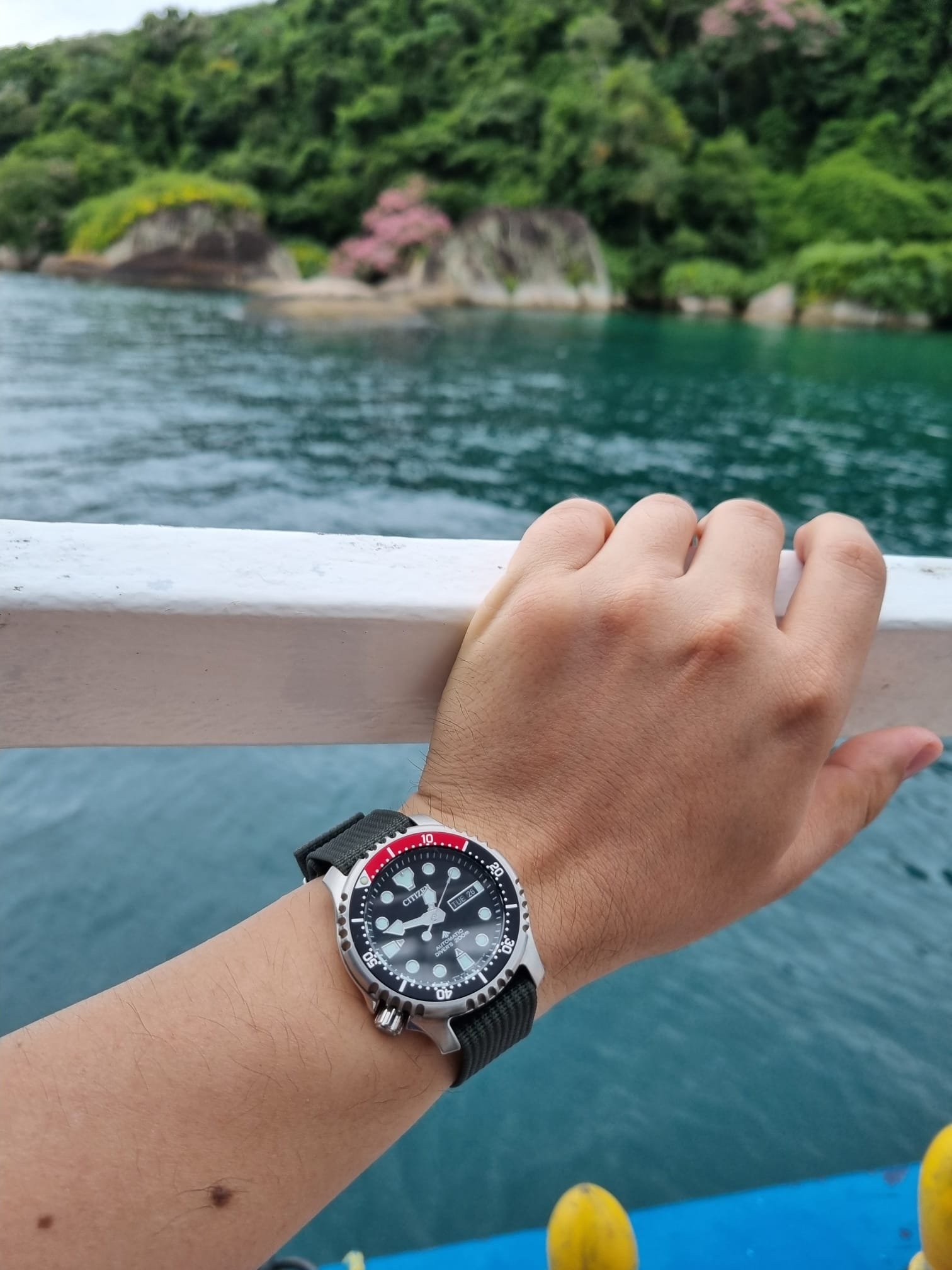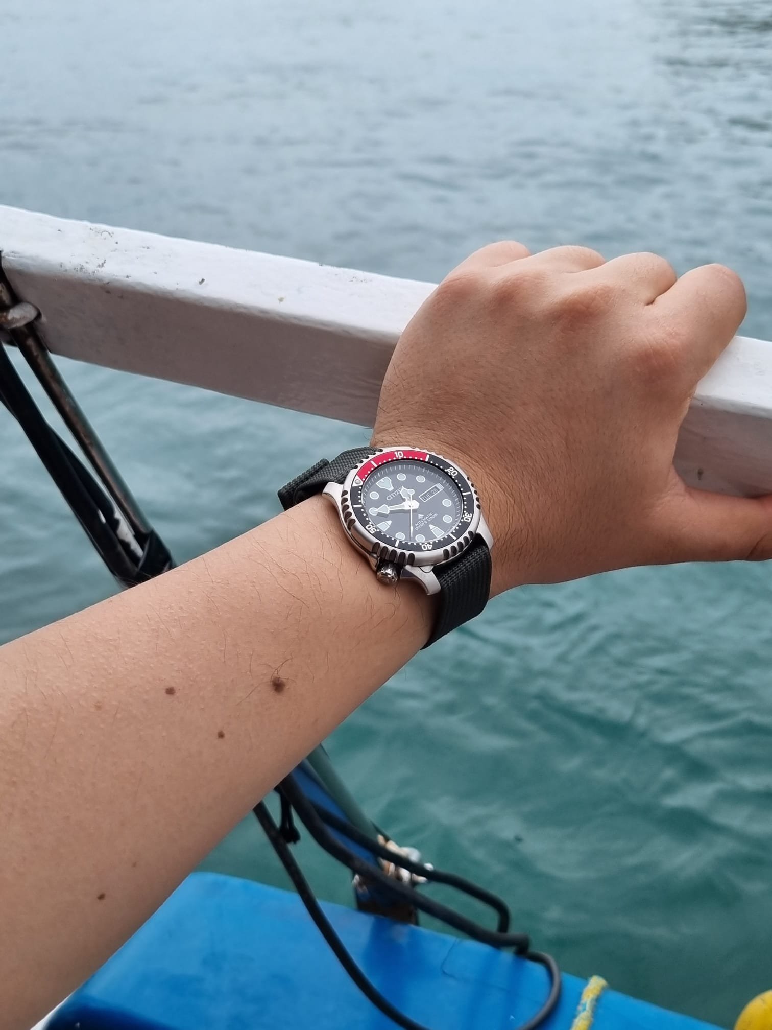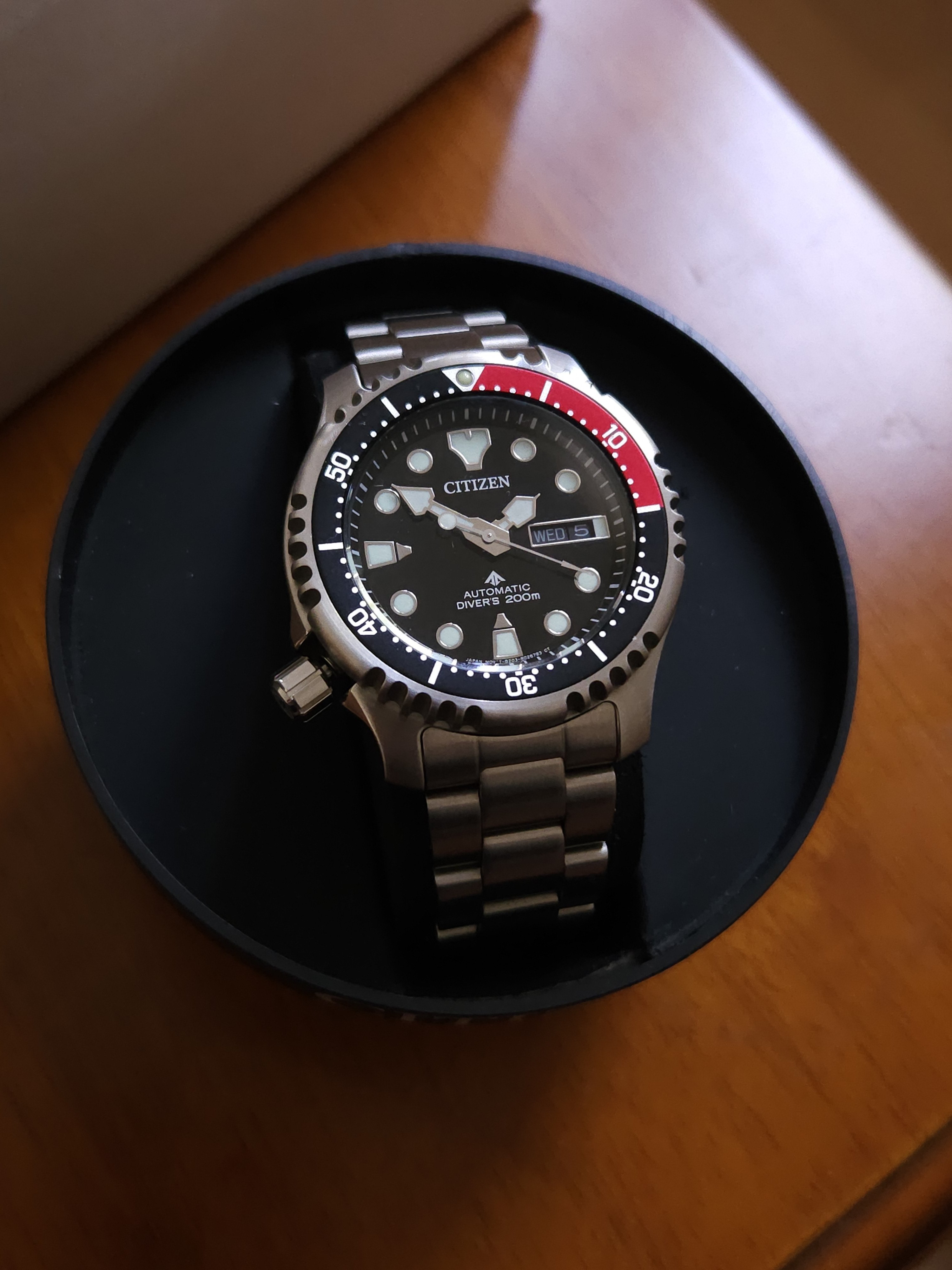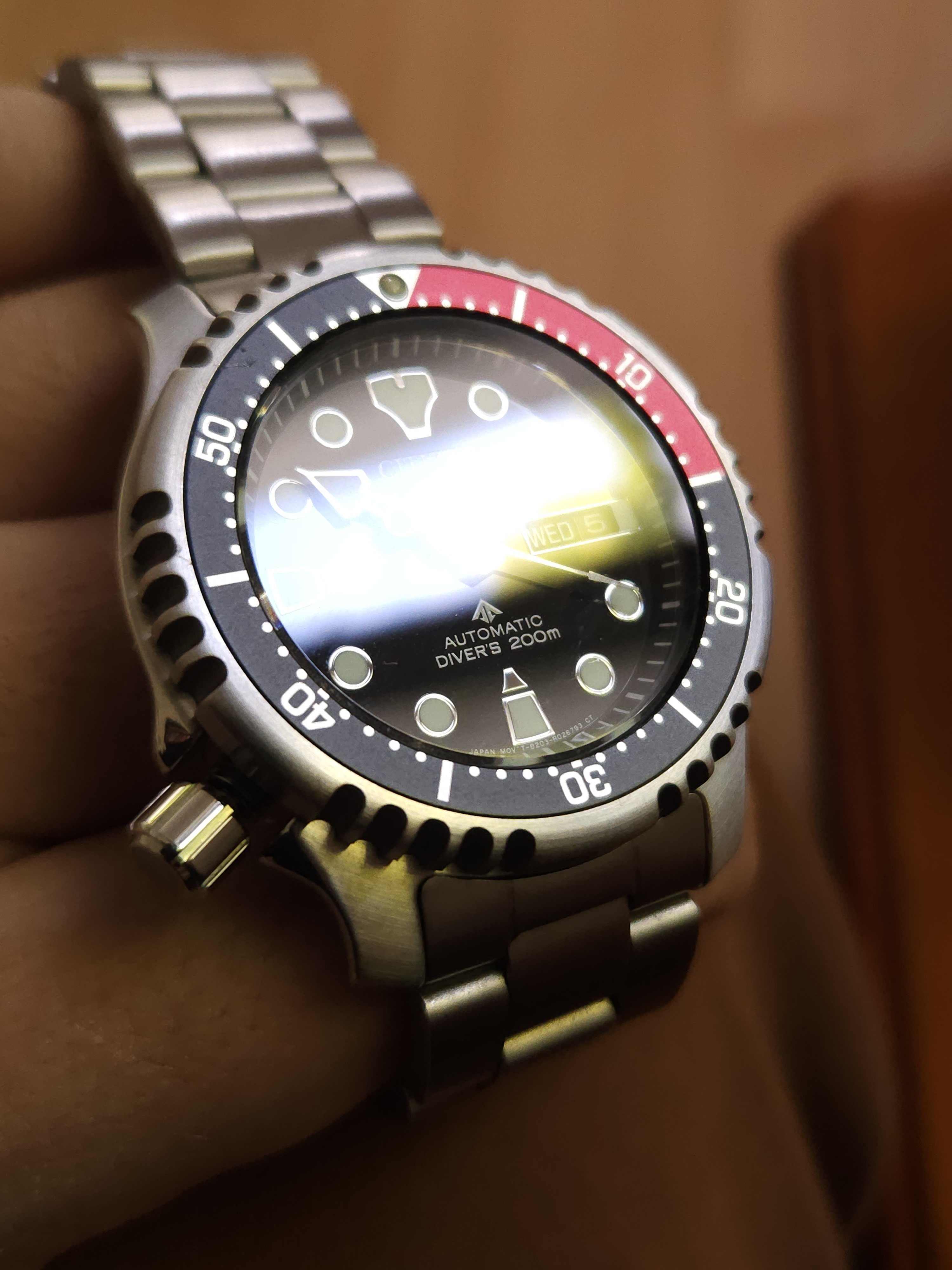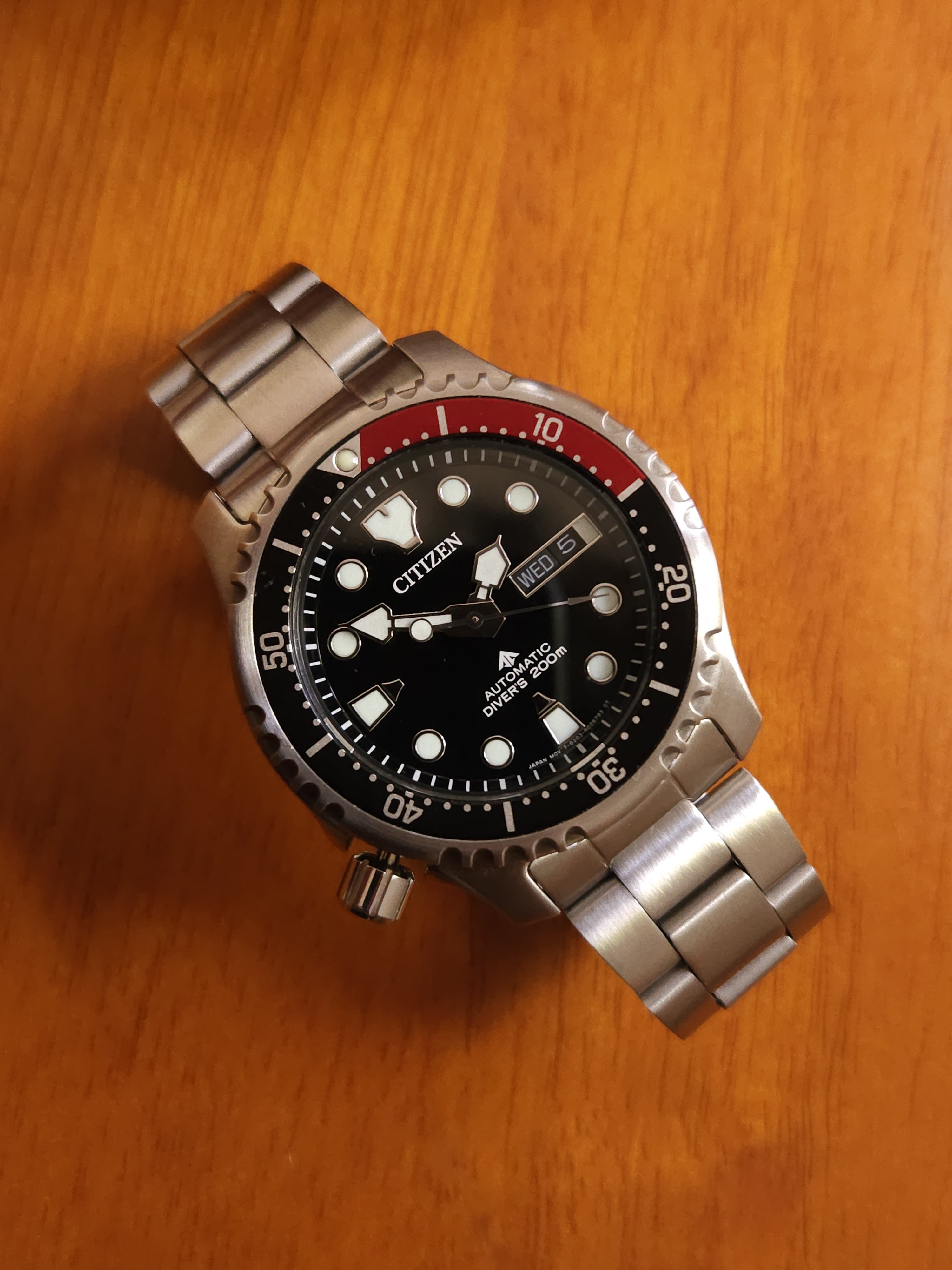 Some people consider this to be a serious contender and rival to Seiko SKX divers. I agree. While Seiko has been pursuing a downgrade of it's former SKX line and has been offering a "semi' Diver's, Citizen totally overdelivers with a piece that costs less and offers more with a signed crown, decent bracelet, attention to detail within the dial and more. Note for instance the framed date window with a black date disk, as well as glossy jet black colour of the dial itself. Also the lume is far superior than what I had with my old Seiko SKX013. This is a 60-click bezel also.