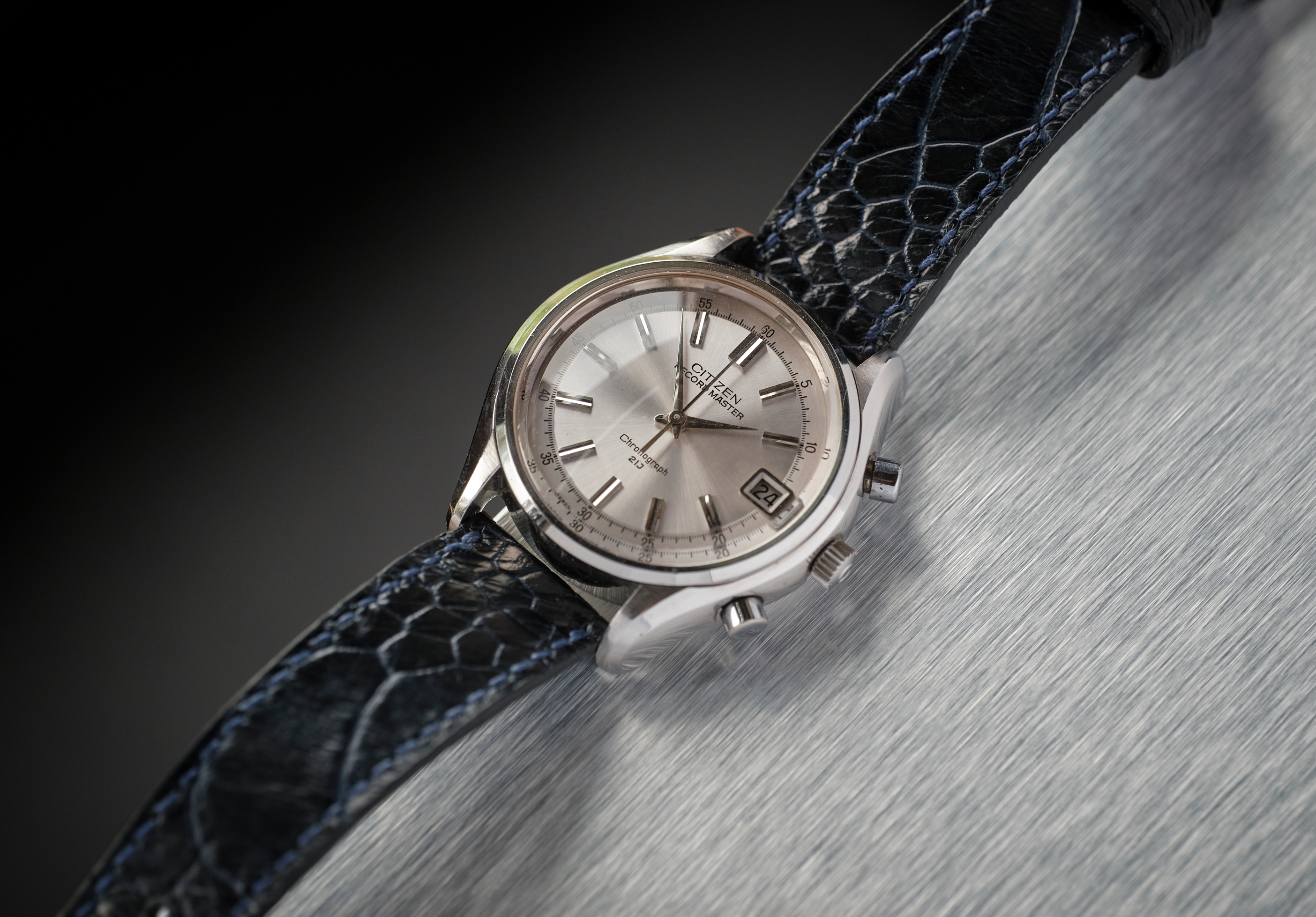 The movement is the second iteration of Citizen's only hand winding chronograph movement, Citizen calibre 5701. It has 21 jewels and beats at a slow 18,000bph. Elapsed time can be measured for one minute. The user can start/stop and reset the chronograph as well as flyback (reset while running). The crown is pulled one stage to adjust the time. The date is not quick-set but is changed by advancing the hour hand past 12.