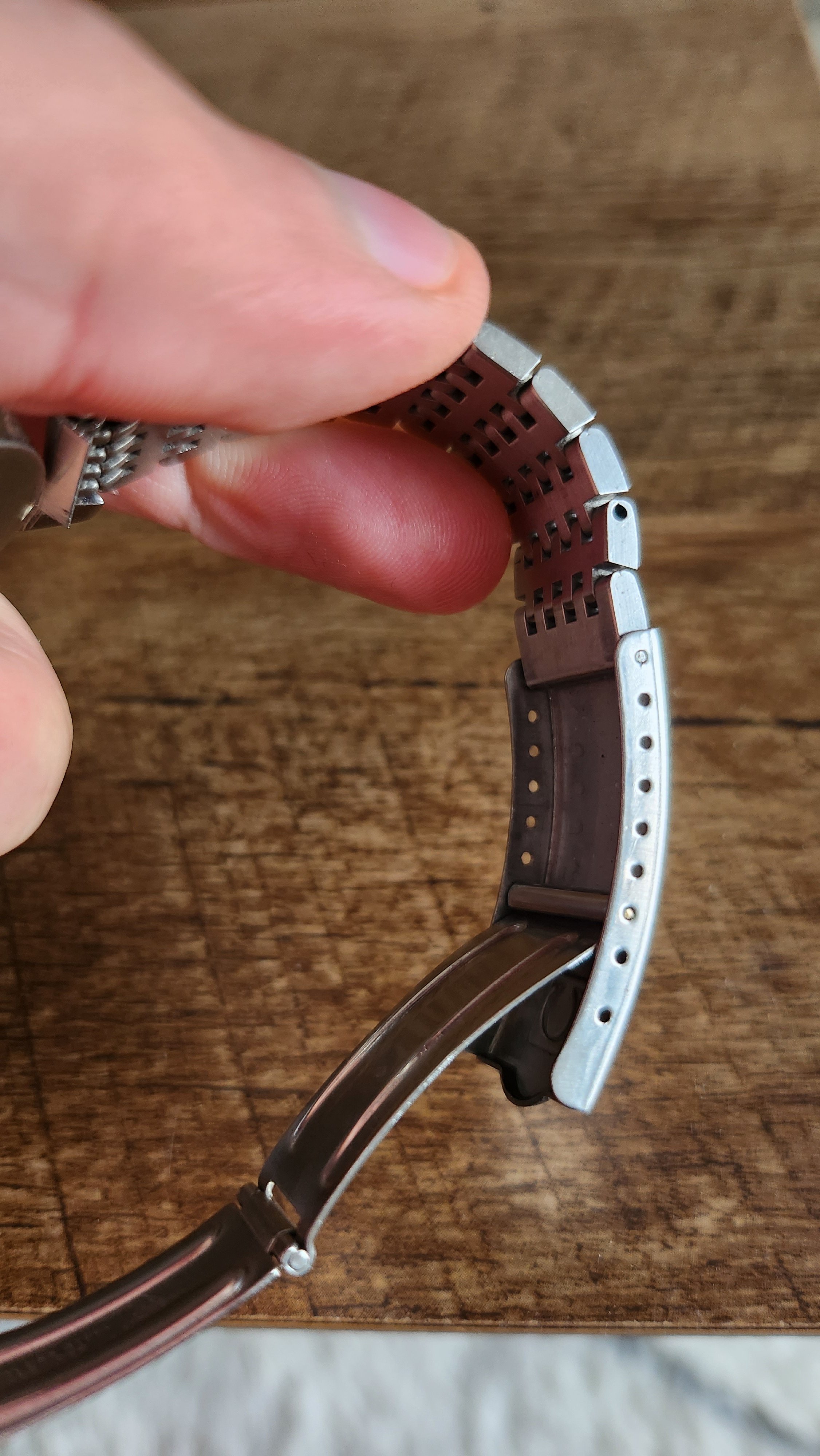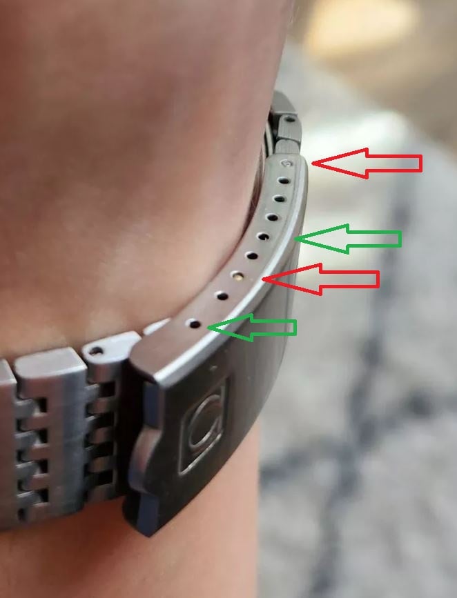 That is where I started to have problems as I'm not too experienced in adjusting bracelets that way. To adjust the clasp, only one end of the connection between the links and clasp had a movable springbar, the end on the logo side that I moved closer to the middle of the clasp. The other end I was not able to figure out how to disconnect and move at all, any help with this would be appreciated!