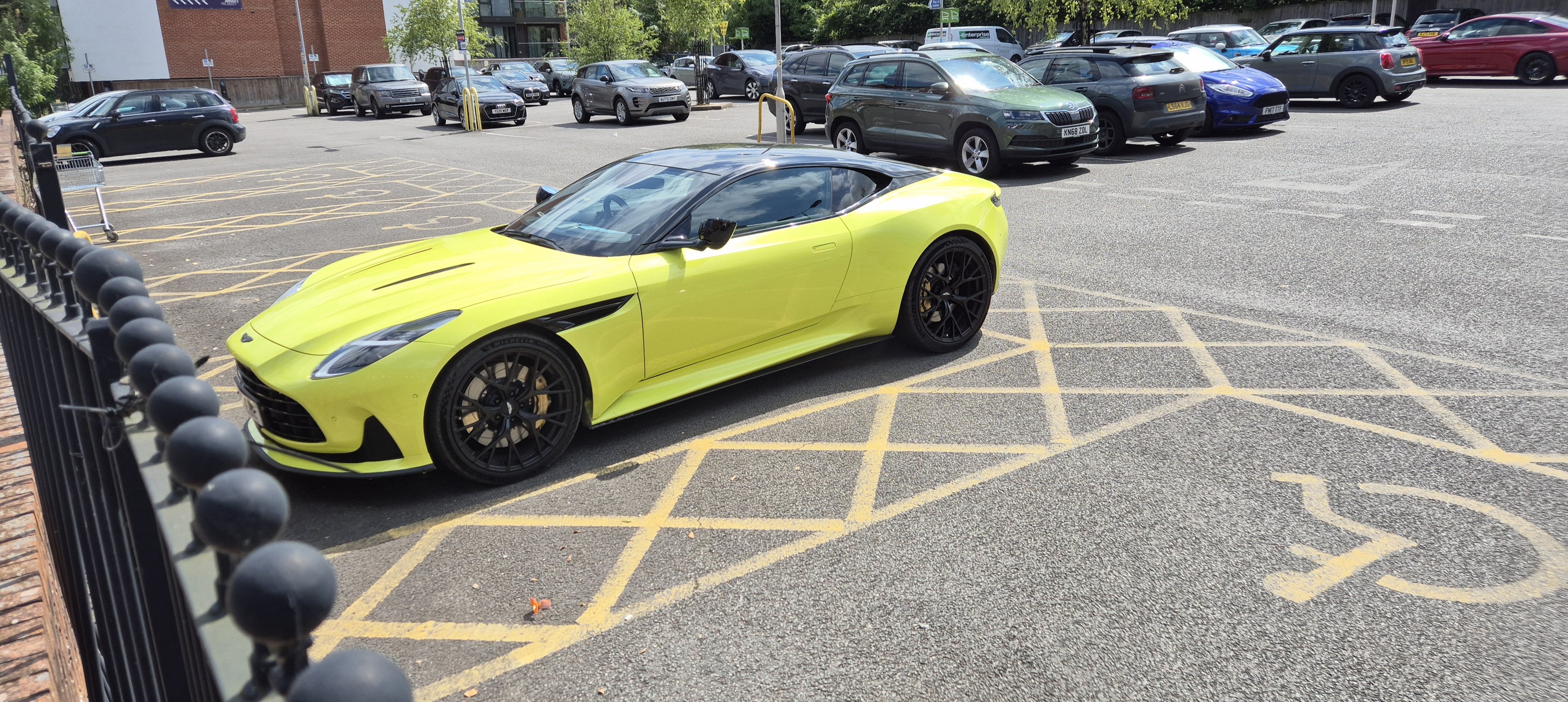 It doesn't look like there is a shortage of normal parking spaces, I can see some vacant, my guess is the driver chose that spot so as not to have others opening their doors against his paintwork......that doesn't make it right however