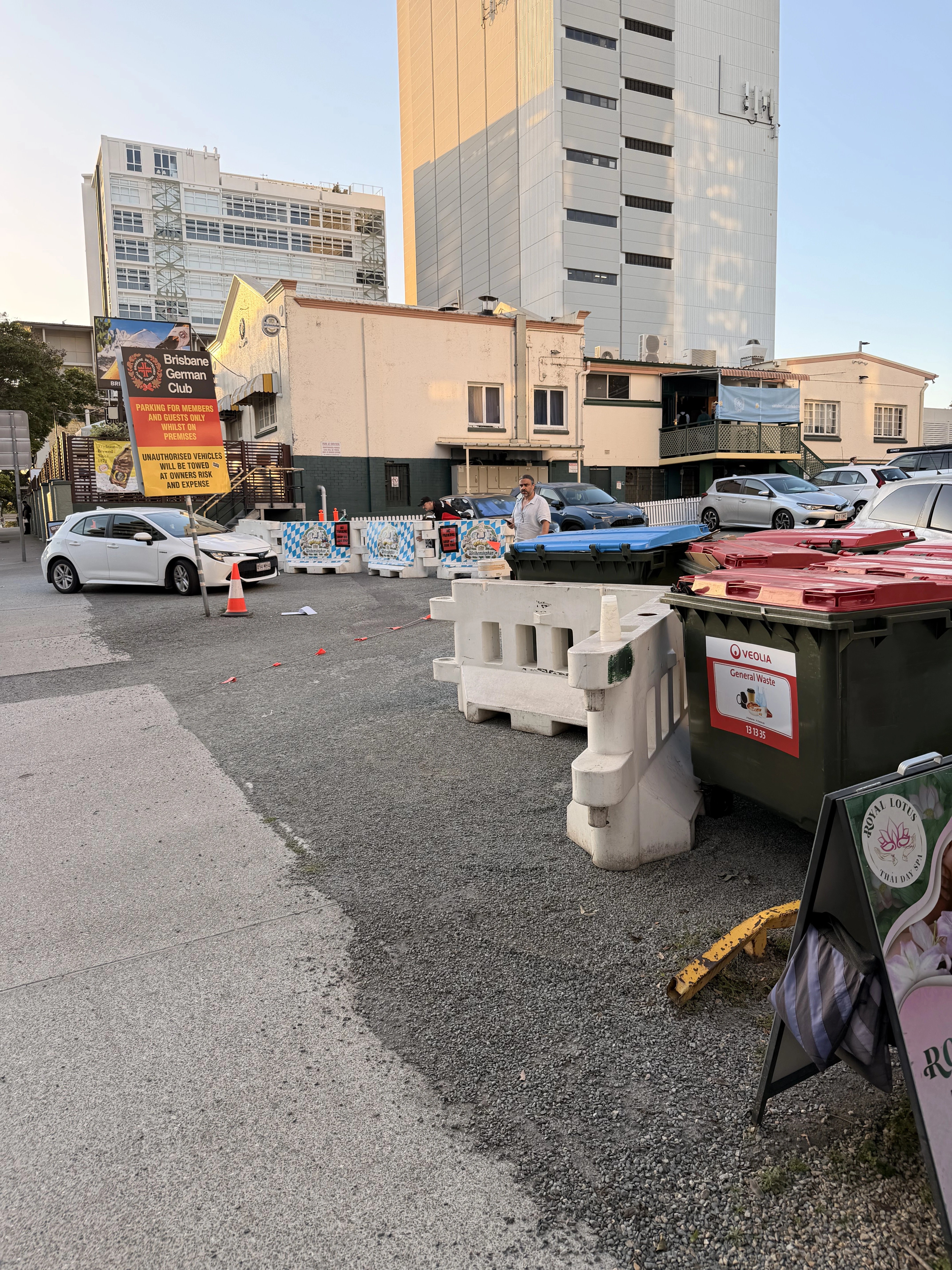 In the pic you can see the white barriers, the chain on the ground with red flags, the skip bins it dragged and the white Corolla it hit, with my mate in the middle wondering why he bothered waking up. This is after they got dragged back