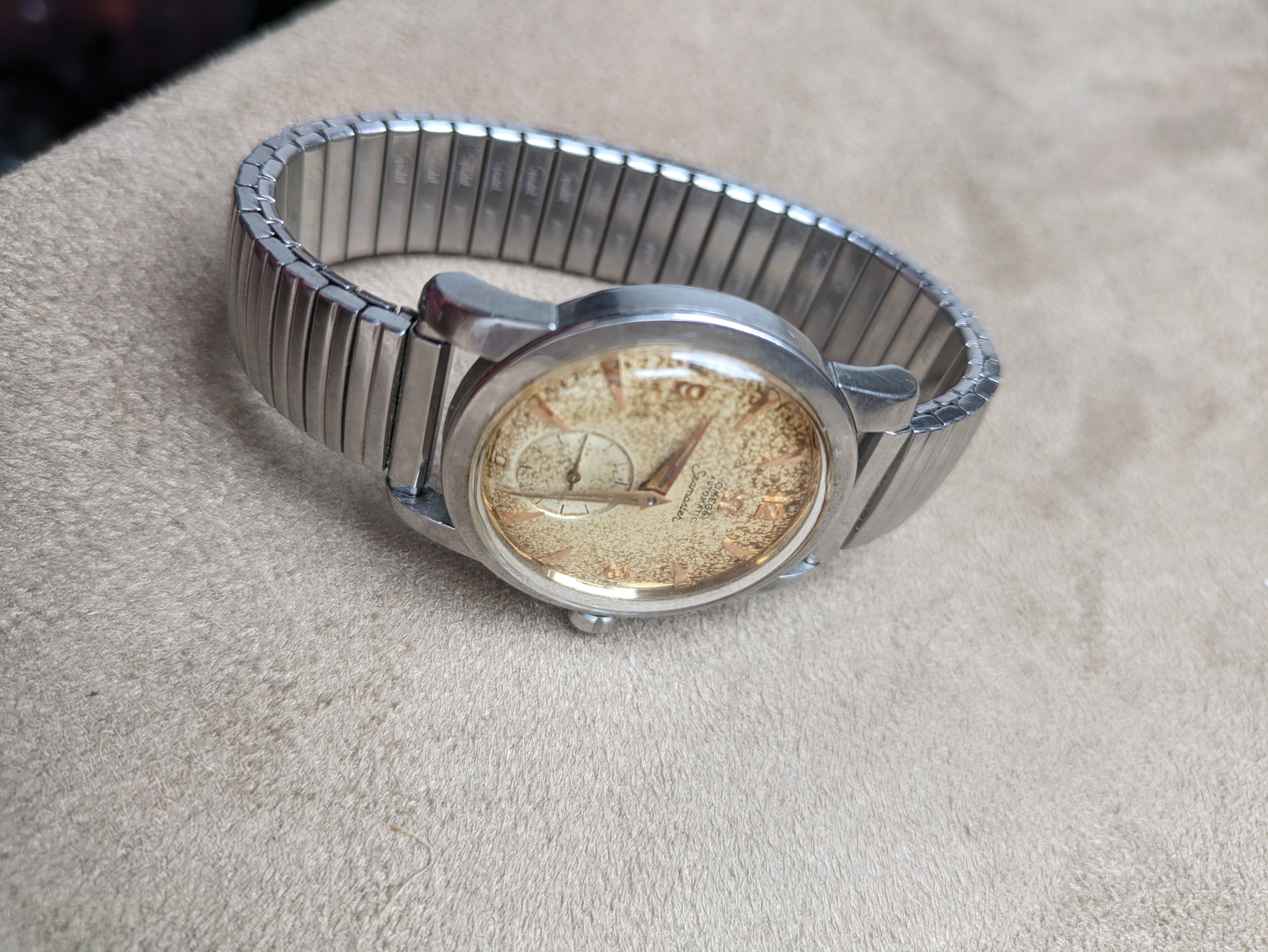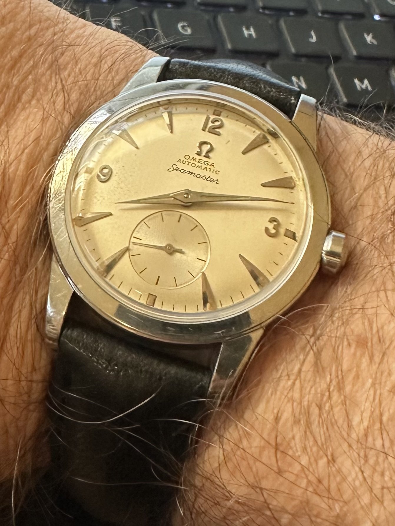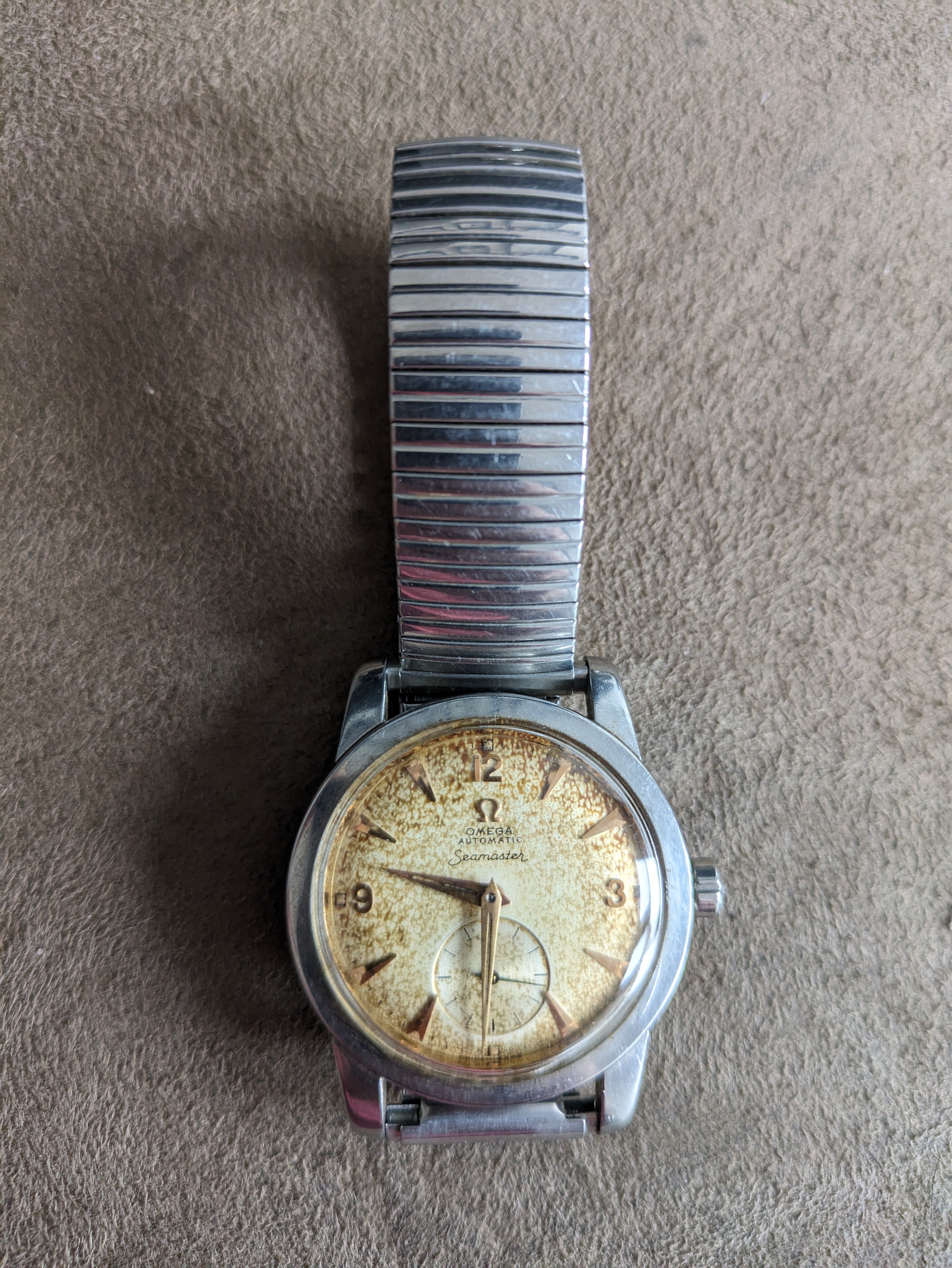 ·Hello all, I'm a complete newcomer and have just one omega watch to my name. It was given to me by grandfather 10 years or so ago. Im not sure of the exact model, but I'd like to know more. It seems to be in good working order and seems to keep time well. My main concern is that it's always had quite a heavy 'patina' on the face, and I don't know whether this could eventually cause a problem or affect its value. Is it something I should get cleaned? I know some people like patinas but I wonder if this is a bit much. Personally I quite like it (it's softer than it appears in the photos) but I know it's not for everyone! I have no intention of selling it but I am also interested in whether it has much value. Thanks all.