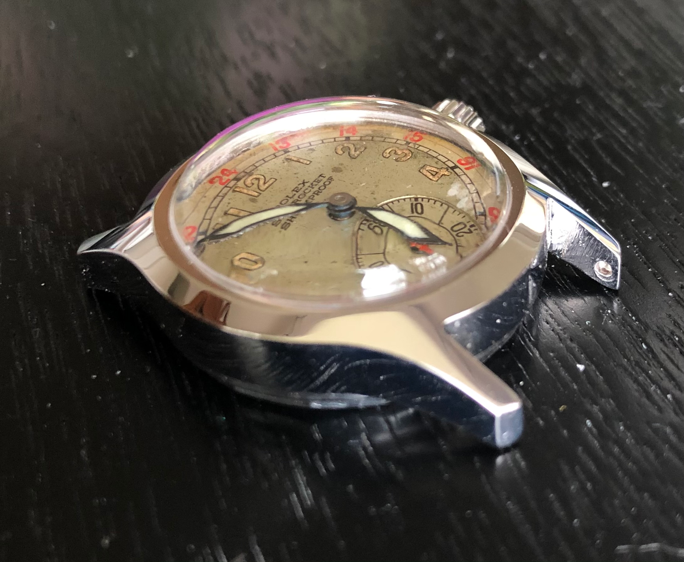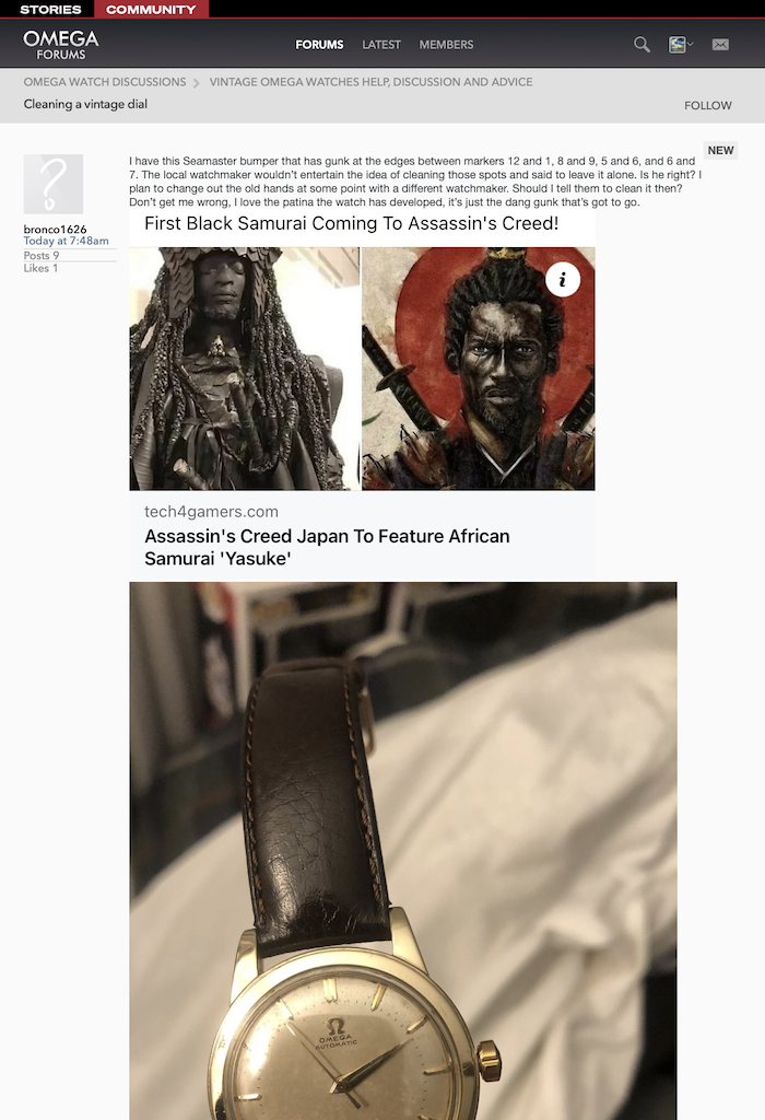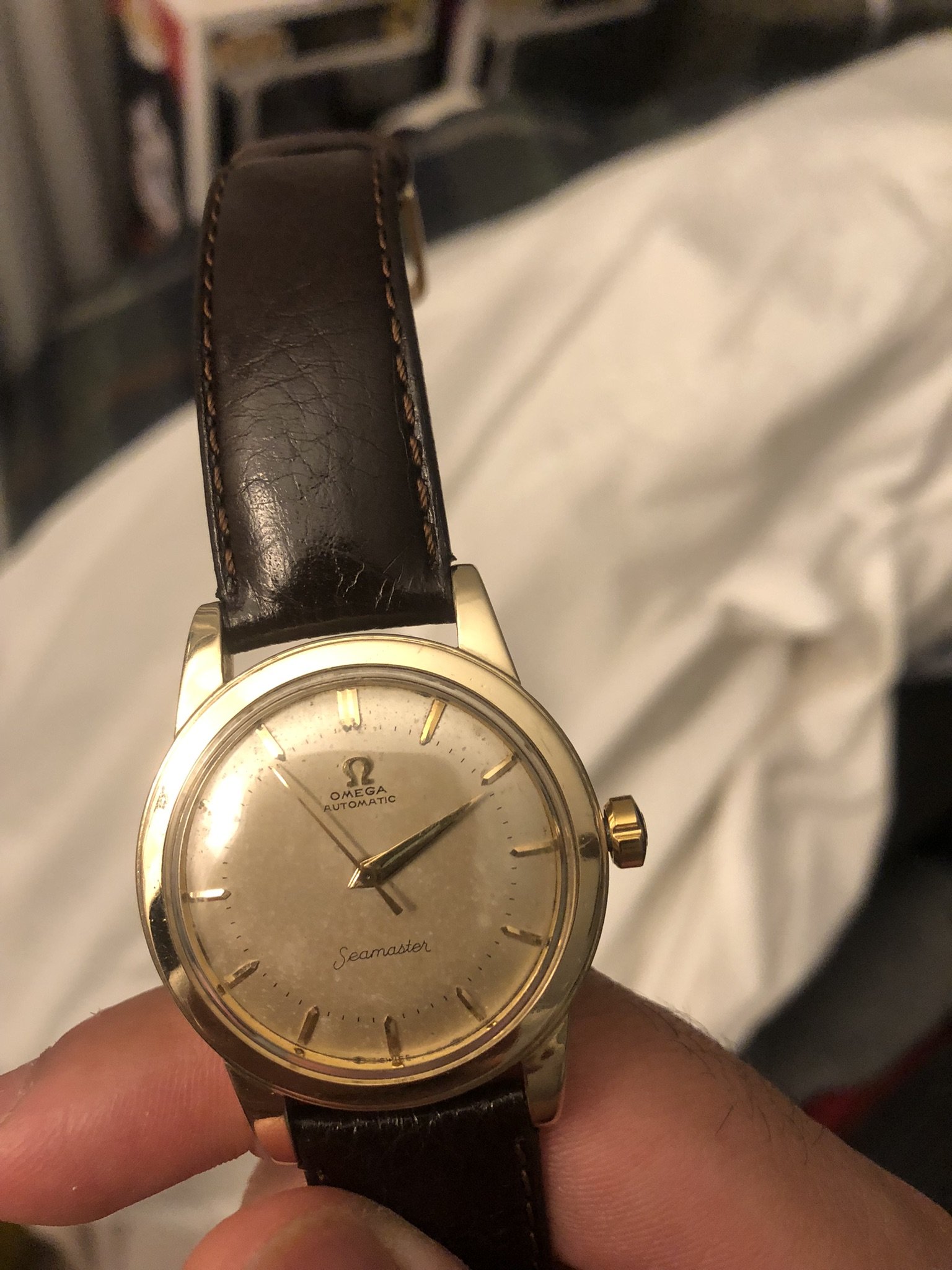 ·I have this Seamaster bumper that has gunk at the edges between markers 12 and 1, 8 and 9, 5 and 6, and 6 and 7. The local watchmaker wouldn’t entertain the idea of cleaning those spots and said to leave it alone. Is he right? I plan to change out the old hands at some point with a different watchmaker. Should I tell them to clean it then? Don’t get me wrong, I love the patina the watch has developed, it’s just the dang gunk that’s got to go.