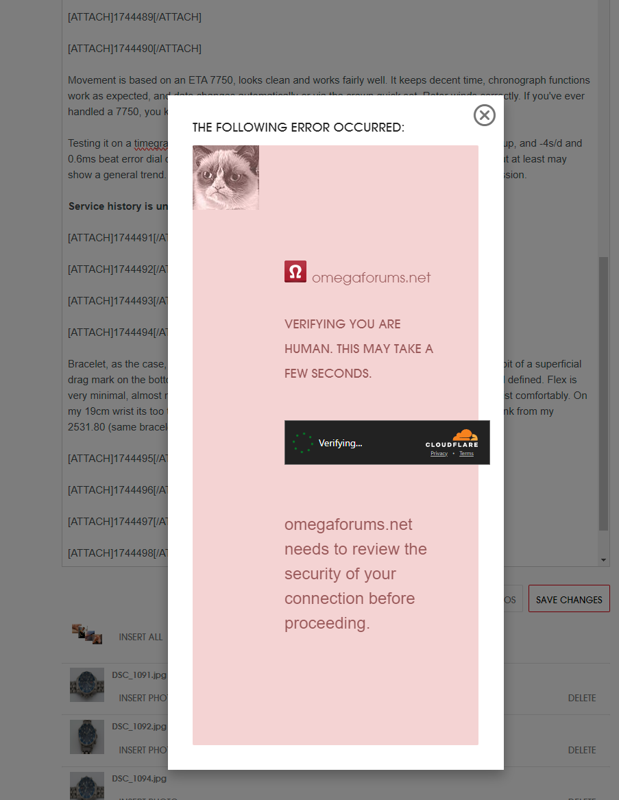 ·This has happened a few times when trying to edit posts in the "Private Watch Sales" section. I'm sure it has nothing to do with the sub forum, but mostly with the fact that these are really longs posts and for some reason CloudFlare is triggering an "are you human" verification. The verification usually succeeds without any user prompt, but it follows with another error and I have to start over with the edit.