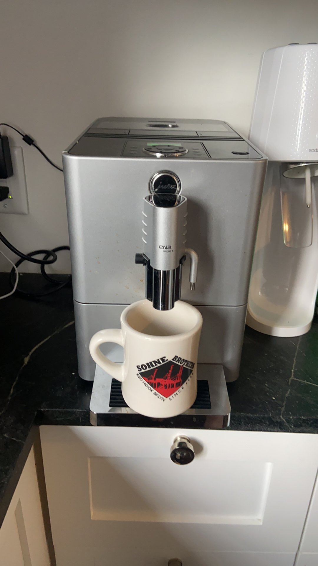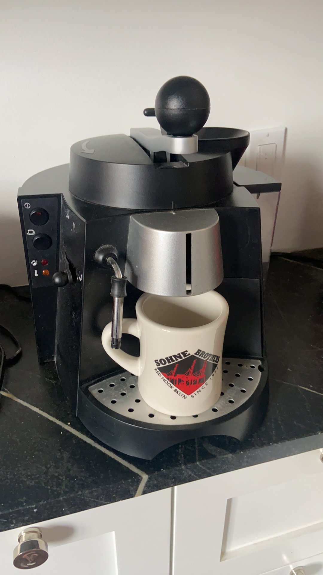 Jura Capresso 121 Ultima Espresso Machine , sad part is this machine is not made any longer.. ... its a semi automatic Espresso , I modified the spout to accommodate a standard size mug... and I just pull a long coffee... and I used a large size burr grinder.. ....