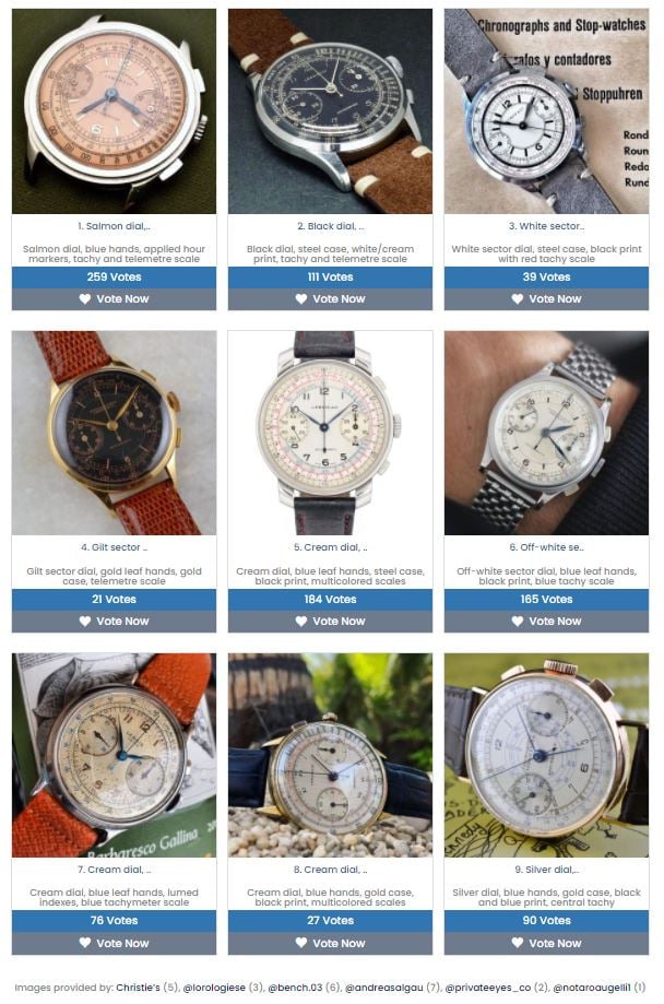 First step is choosing 3 out of 9 vintage Lebois & Co chronographs that will serve as inspirational pieces for our new watch + choosing the movement. If you are interested to help and collaborate; feel free to vote and/or comment on our project page: https://colab.watch.