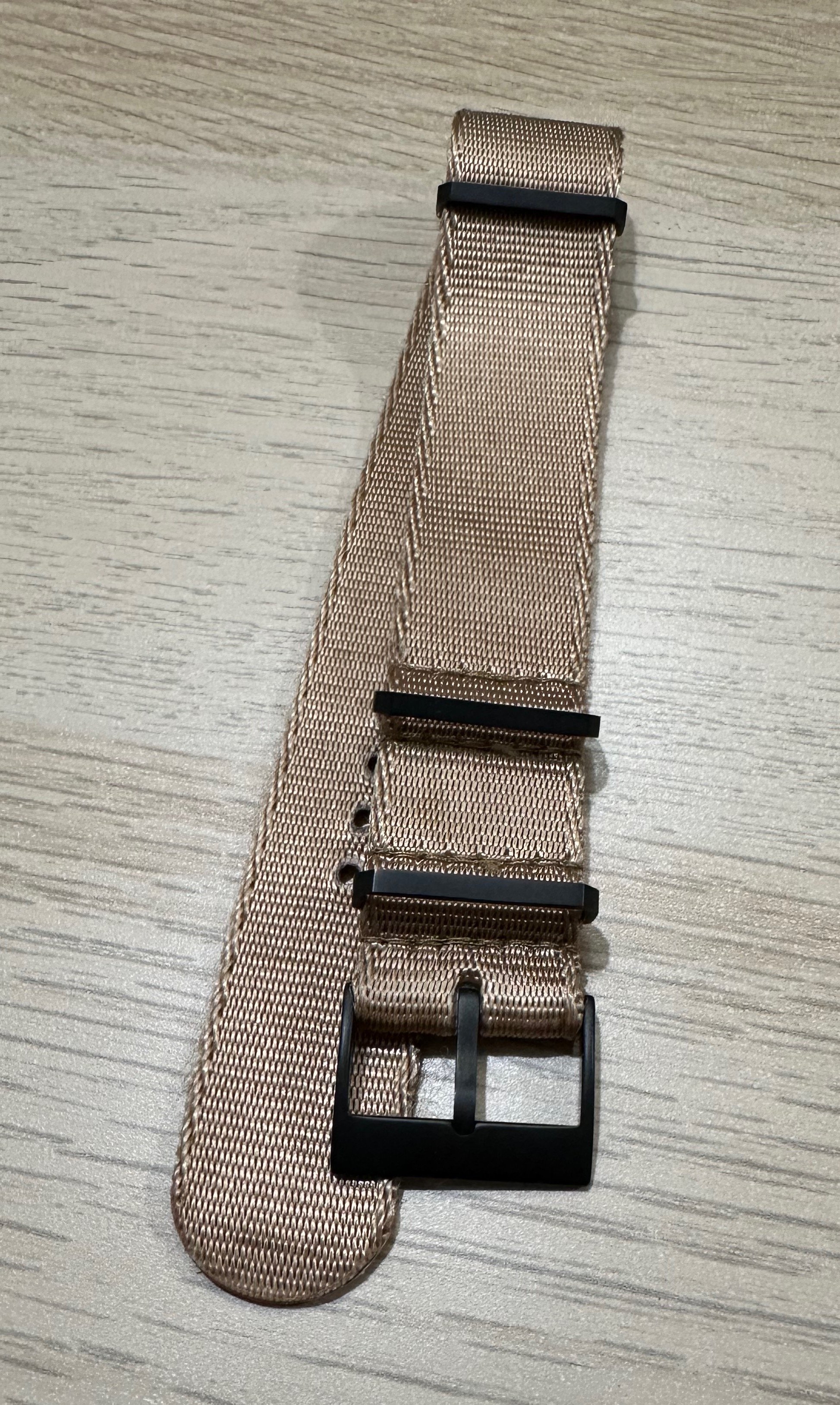 - 1 x Crown and Buckle desert tan supreme NATO with black PVD hardware