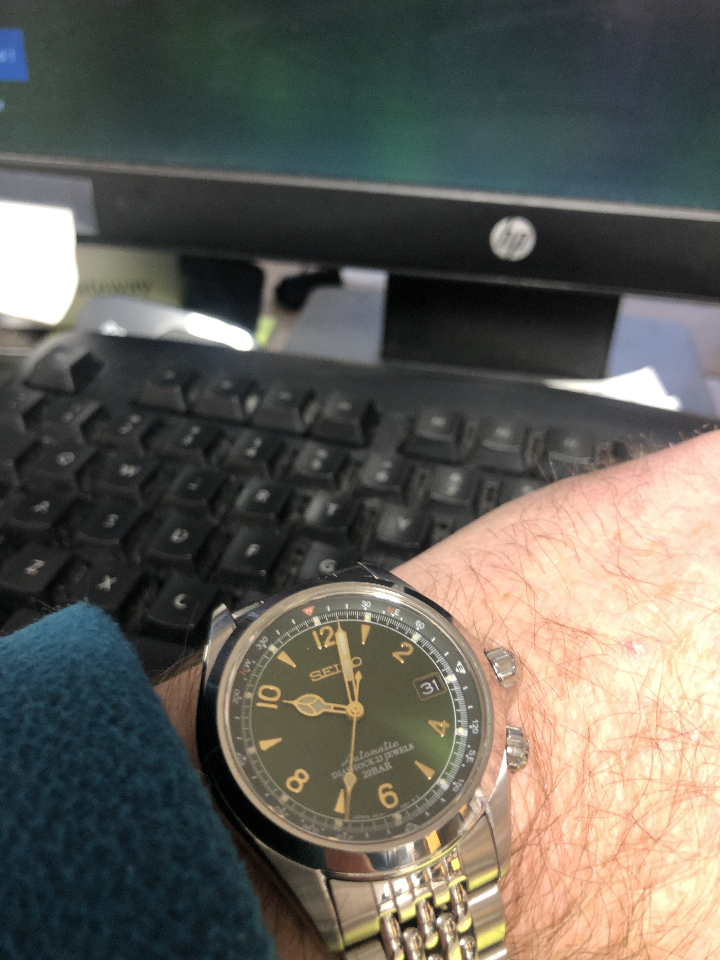 I was up at 5:50a to get ready for work I asked her where my watch box was but she was sleeping so all she did was lift her hand and point in a general direction. I followed the trail but to no avail. Not only does she hide it but she moves it daily, I guess to confuse the would be thief’s so I’m at a complete loss. So it’s been a seiko alpanist all week for me which isn’t a bad thing but I would have liked to wear an omega today. I guess I should add a picture of my alpanist for good measure. Happy New year by the way