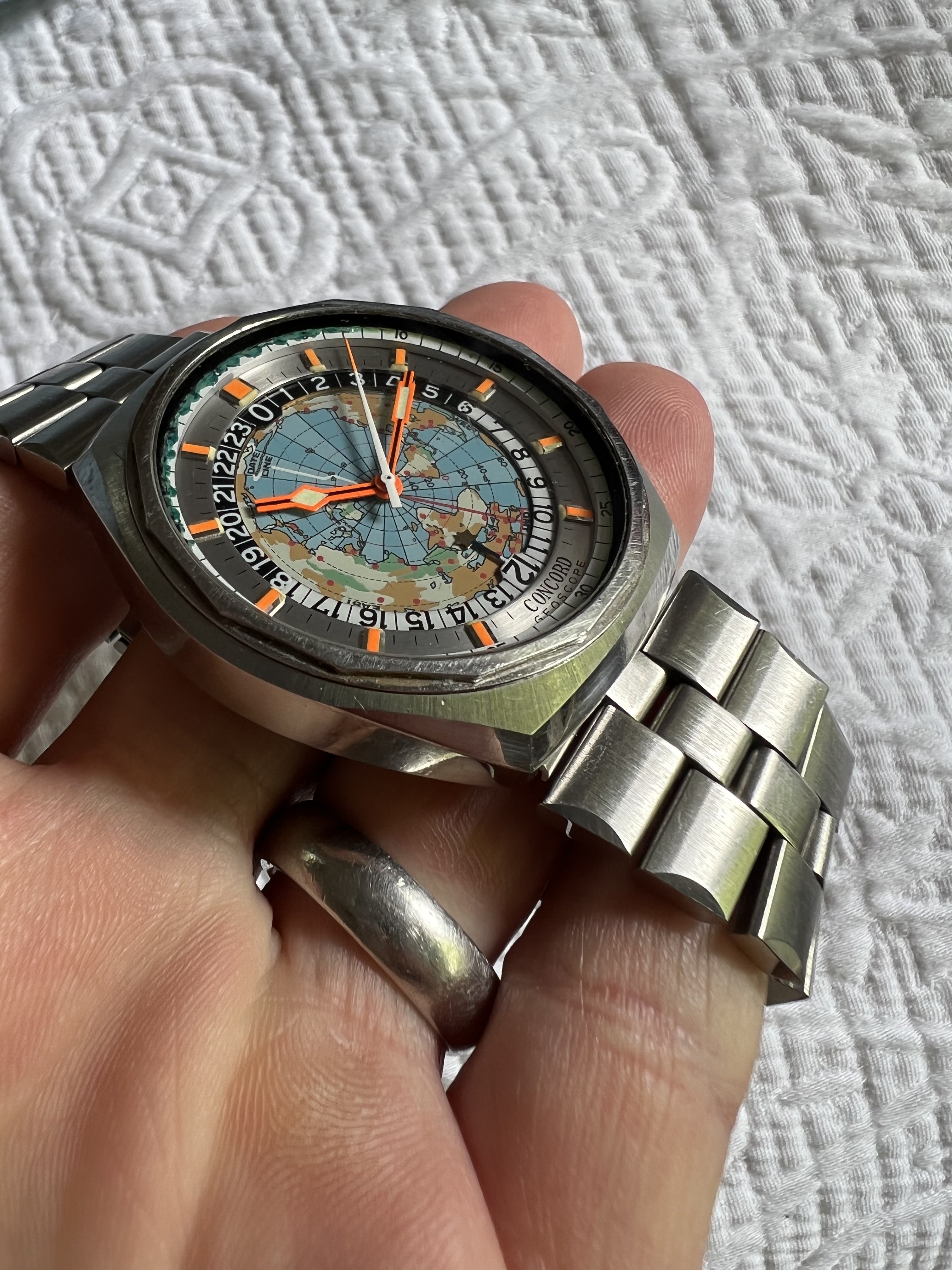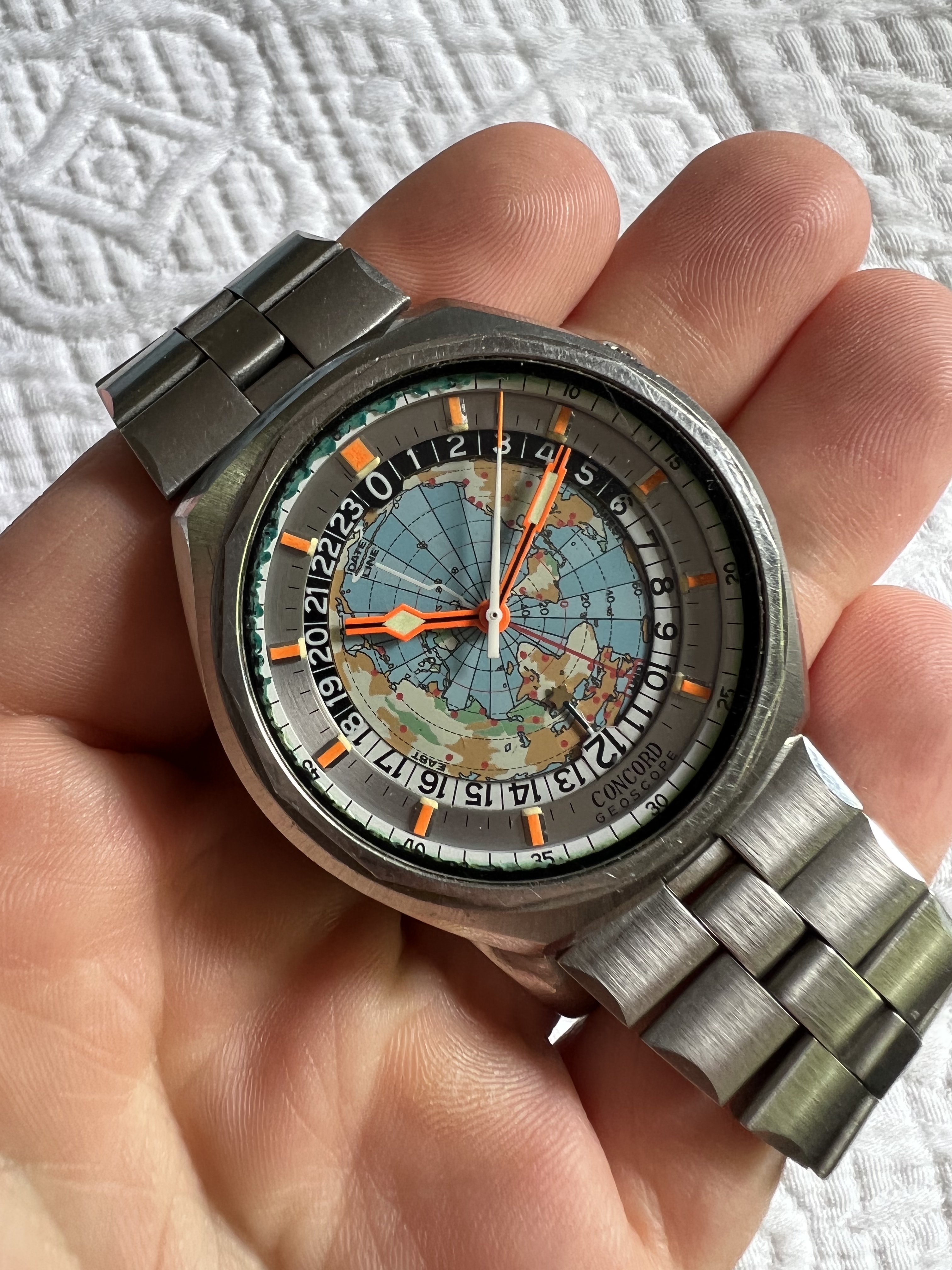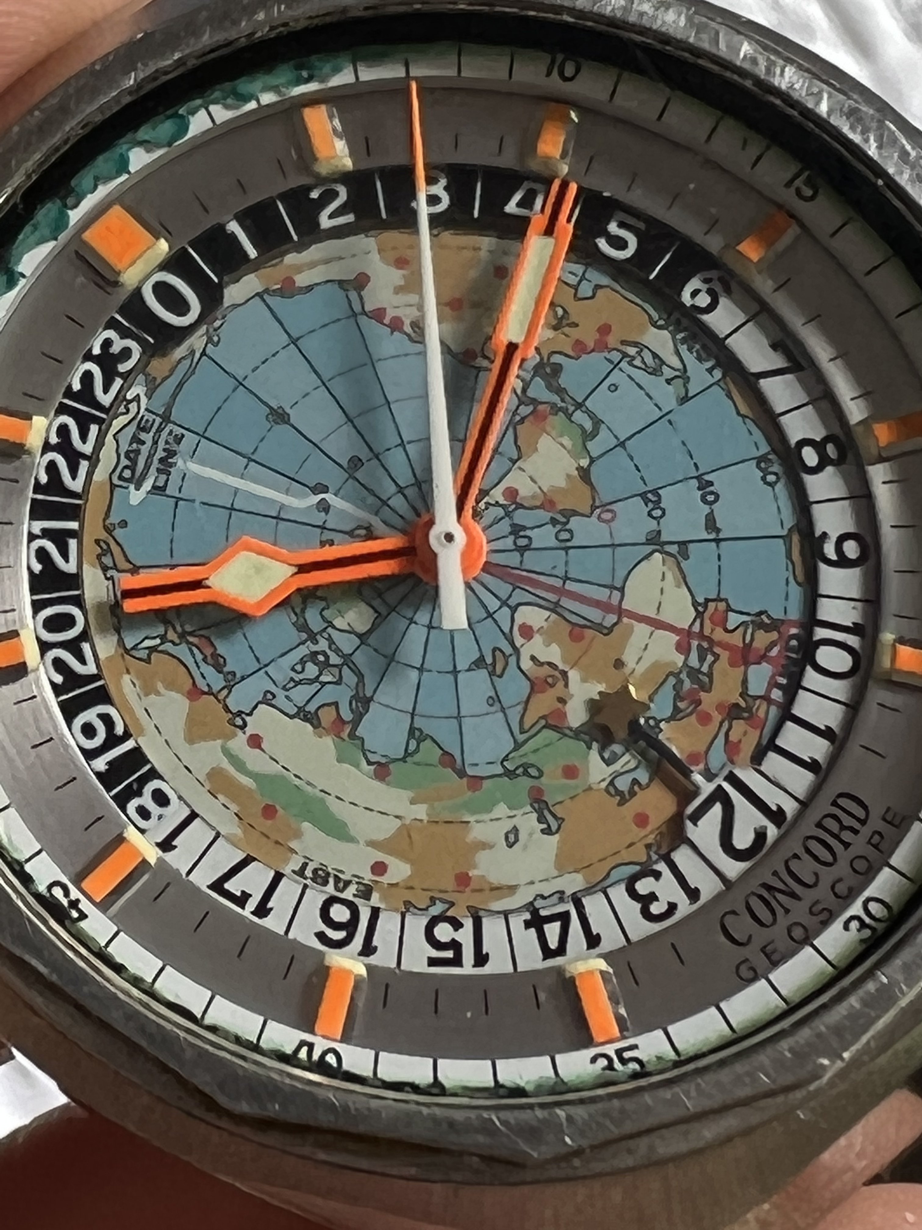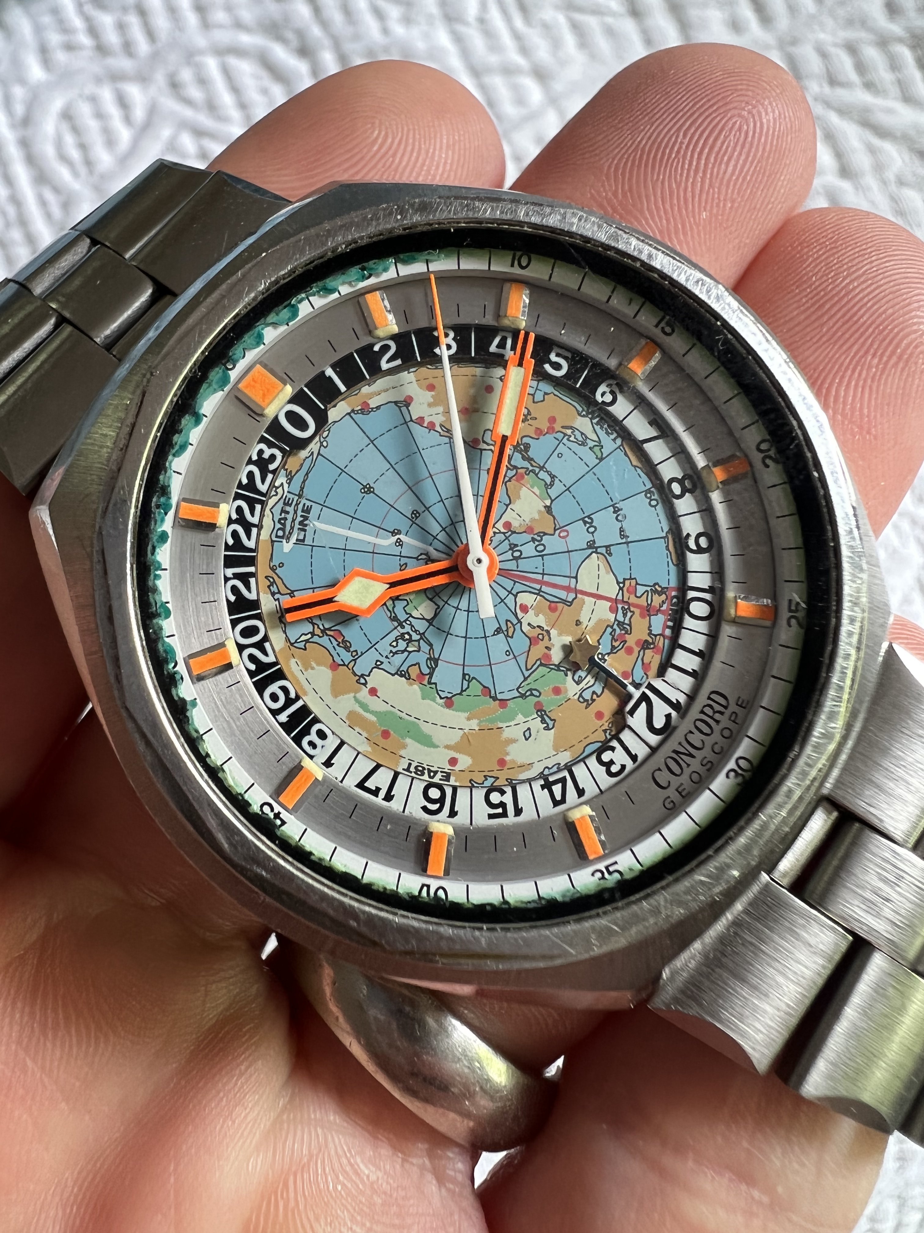 Dial/Bezels: World map dial is flawless, 24hr bezel is flawless, silver numeral ring is flawless with perfect painted indices and lume, outer minute track ring is good with gasket melt as seen.