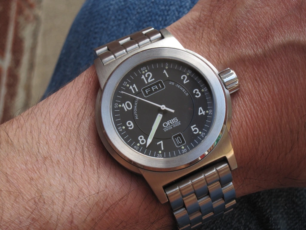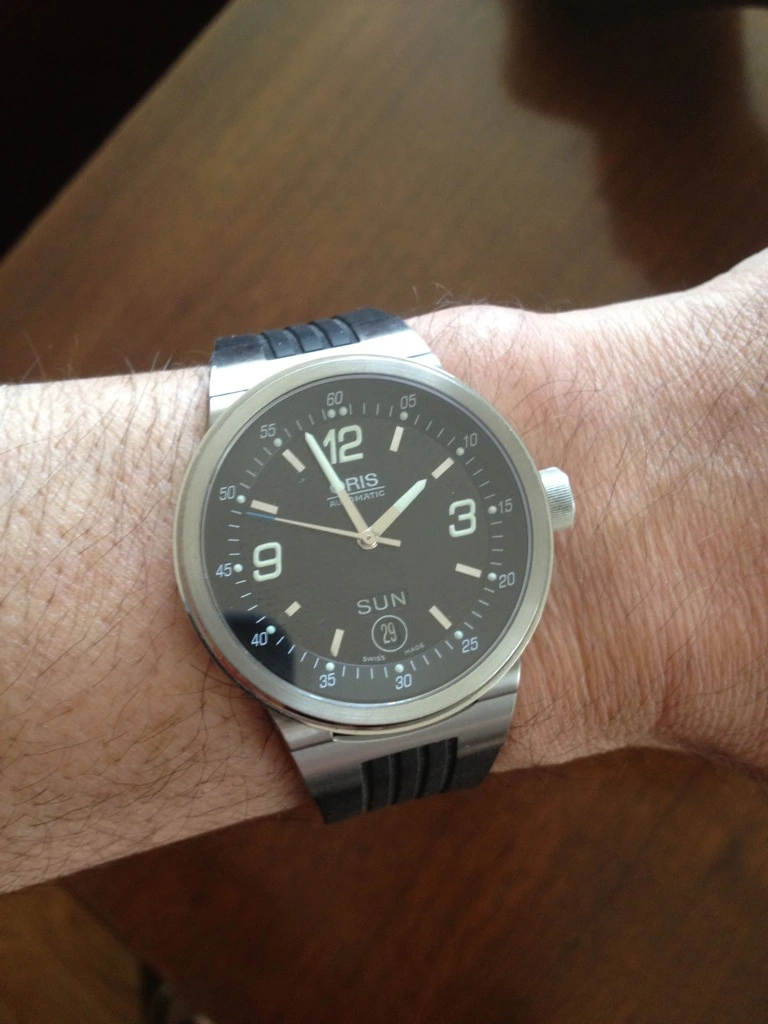 ·It's been years since I have acquired a new watch. After seeing a shot of an Oris that Sam Neil has worn for Jurassic Park III, I fell in love with it. I have read analysis of the video/images that state he is wearing an Oris 7500 BC3 (big crown). Reading the specs for that watch, it has a 40mm diameter, but looking at how much real estate the case takes up on Sam's wrist, it looks more like 34mm or so (unless he has one of the largest wrists ever).