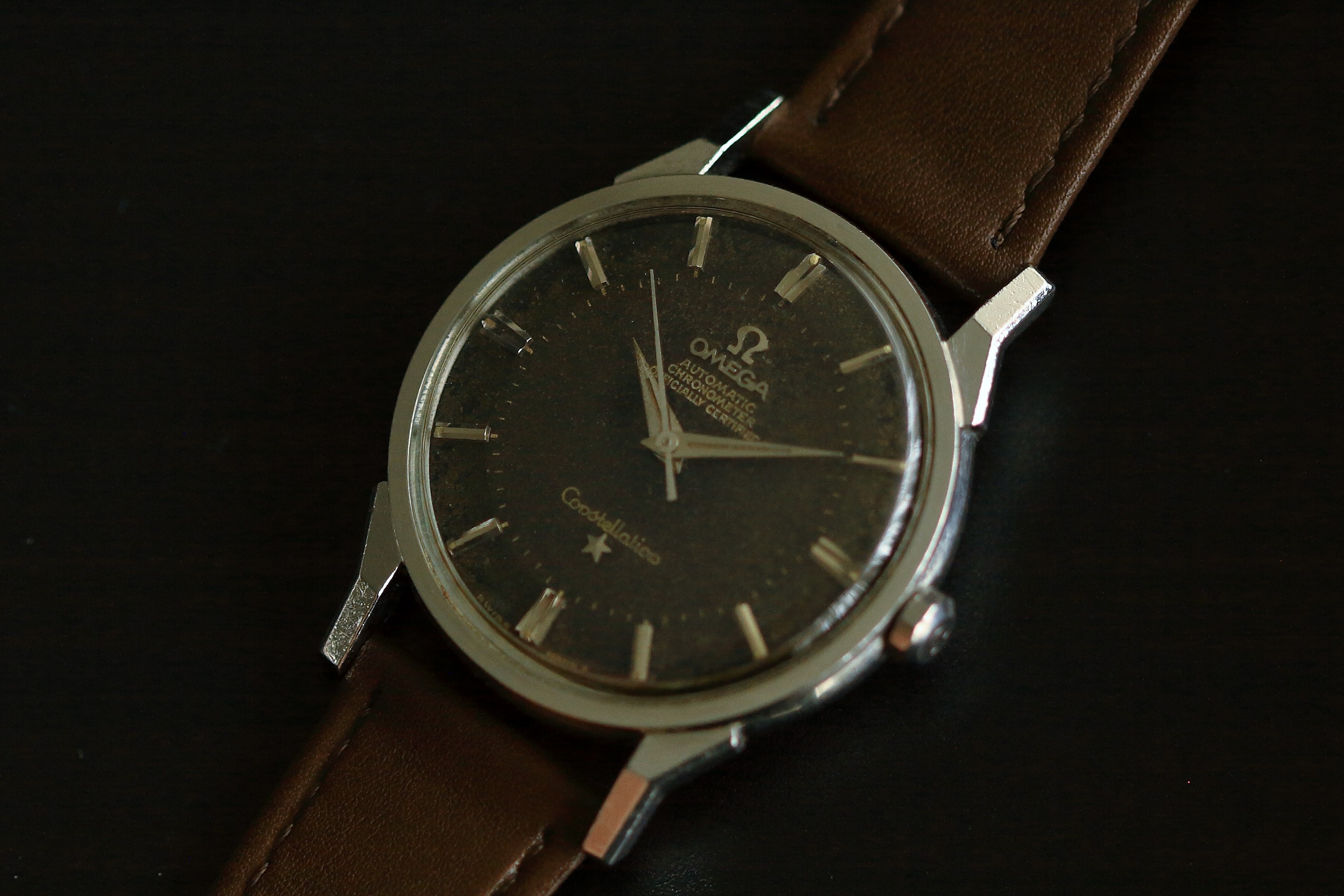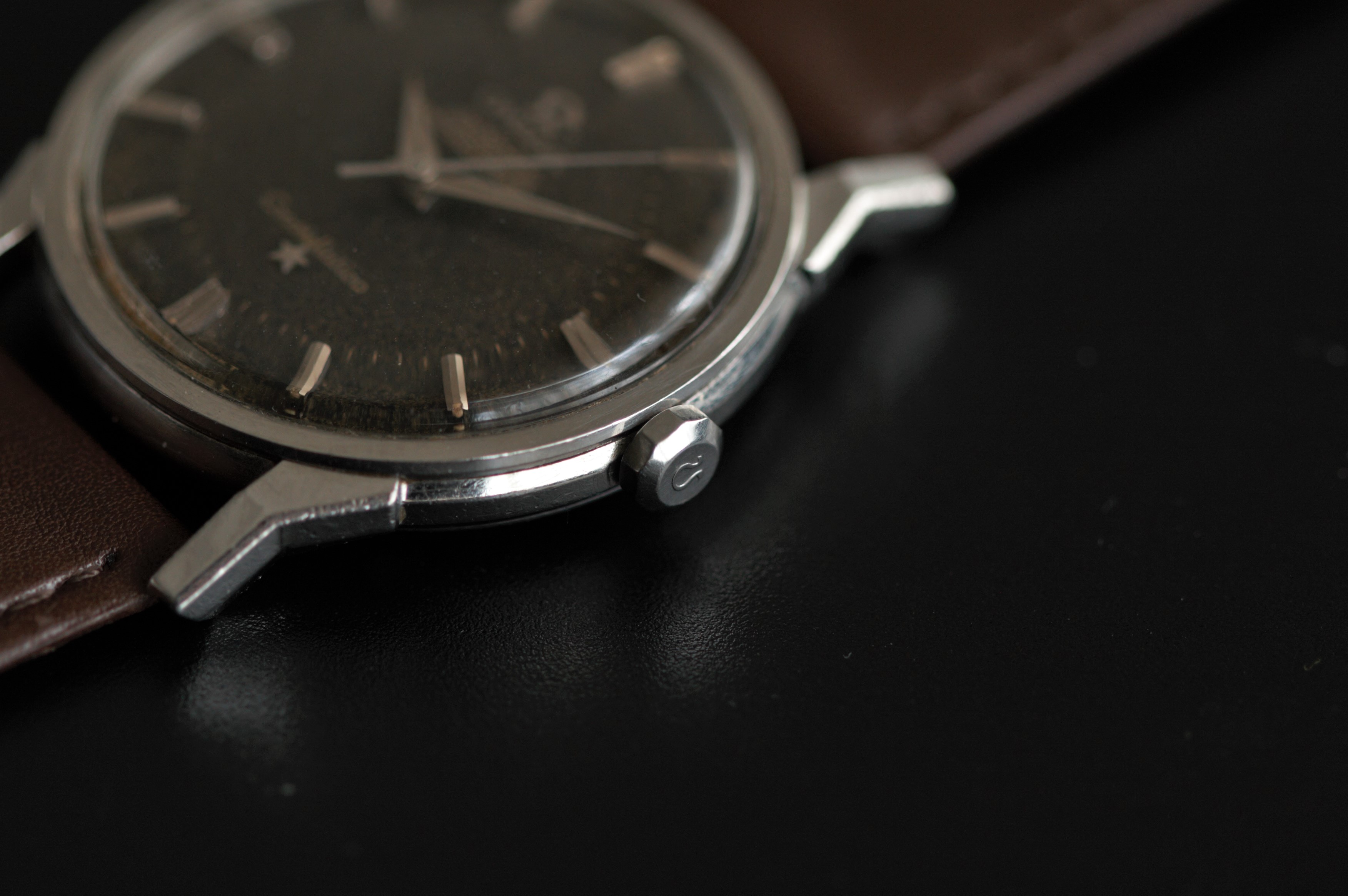 The black dial as can be seen has faded to an attractive brown/black colour. Raised steel markers and hands. I sourced this correct Constellation tritium hand set as the watch came to me with incorrect baton hands. The seconds hand was a from a dome dial and a few mm too long, so I've had it shortened to the correct length.