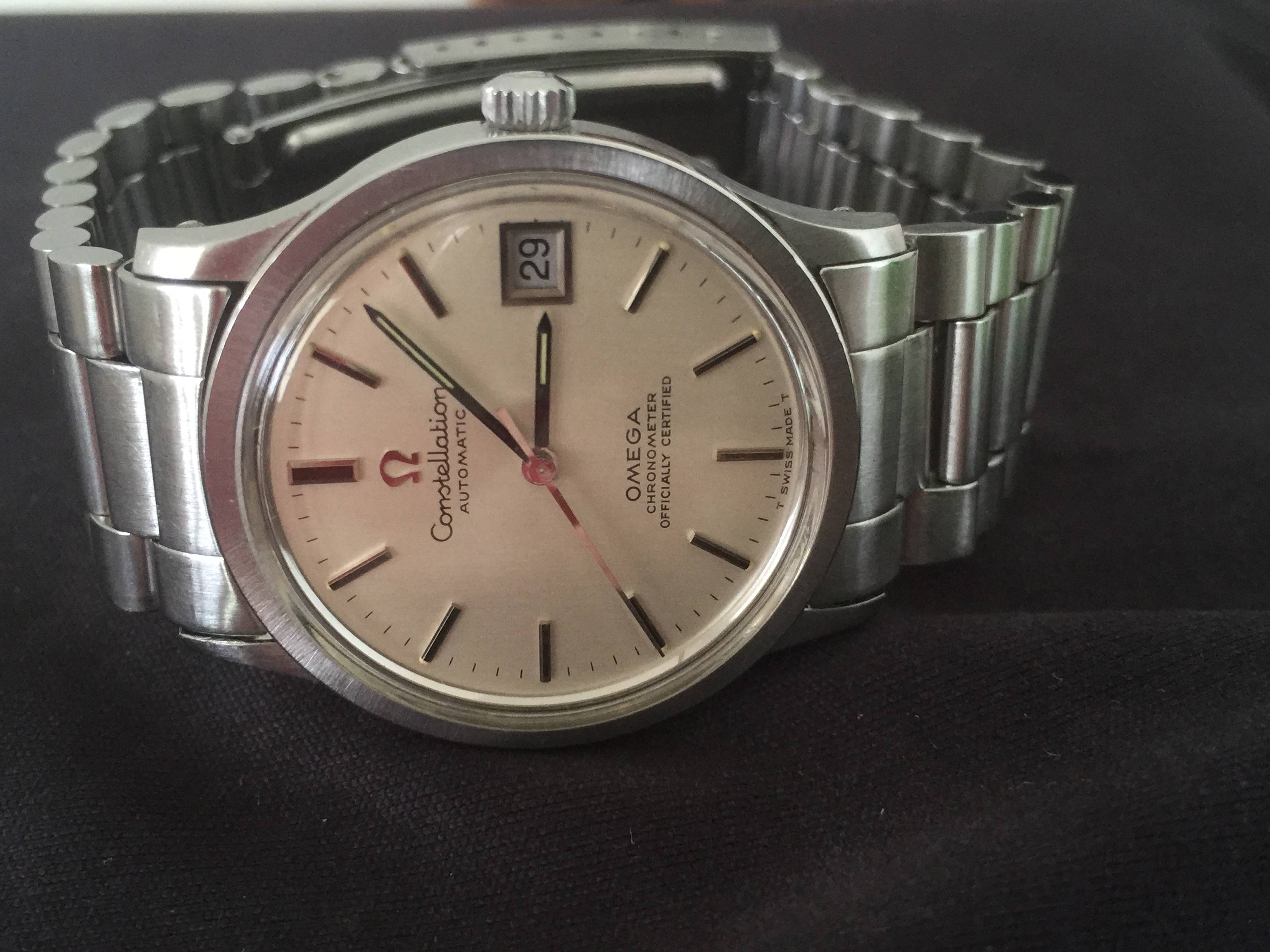This is a sliver dial Constellation, reference 168.033. The dial appears untouched, with only some slight discoloring around the date window. The crystal has a few surface scratches and is much flatter than my other vintage pieces. The serial number puts this one at 1970. Anyone know if the lack of lume at 12,3,6,9 is normal?