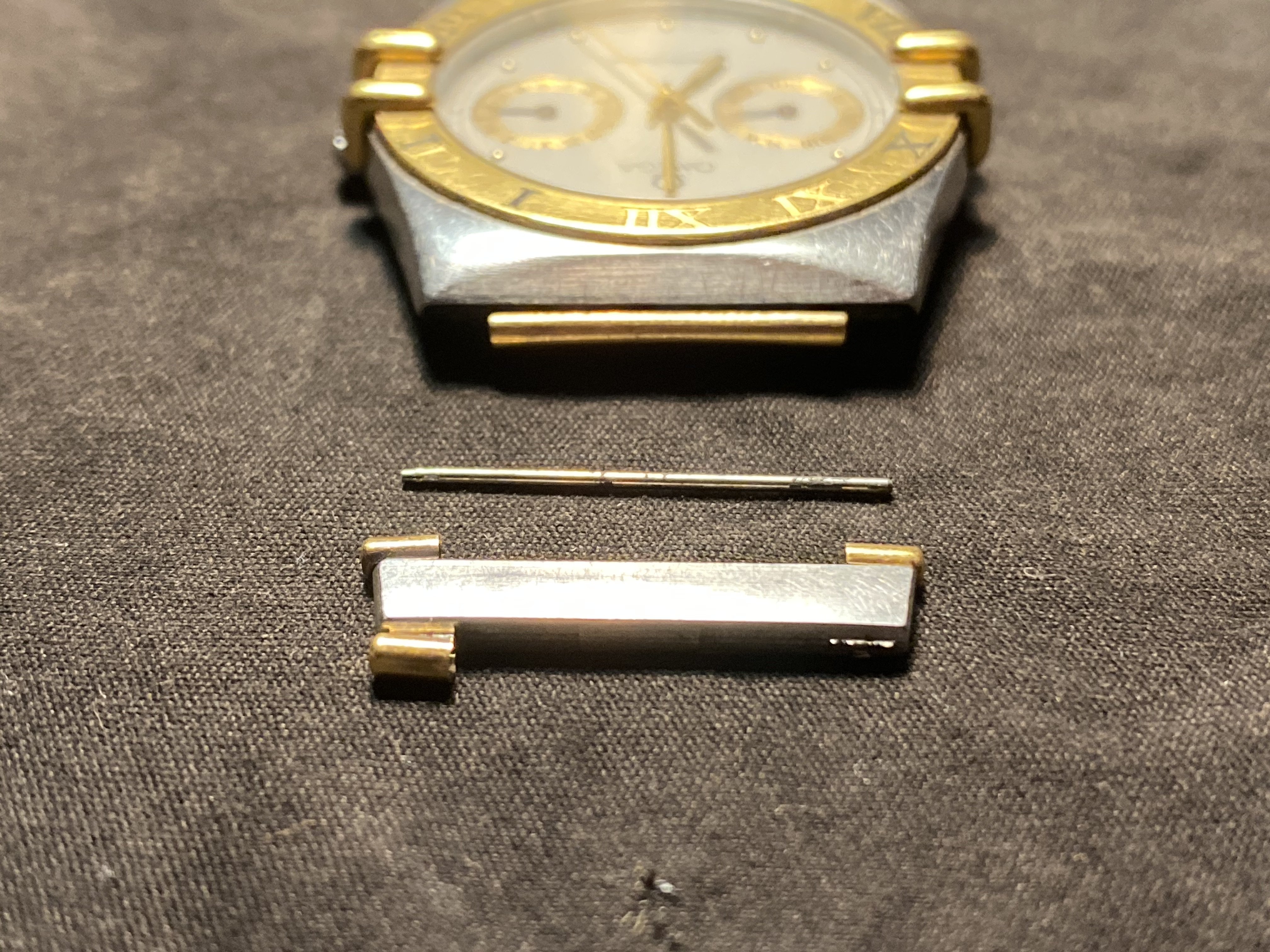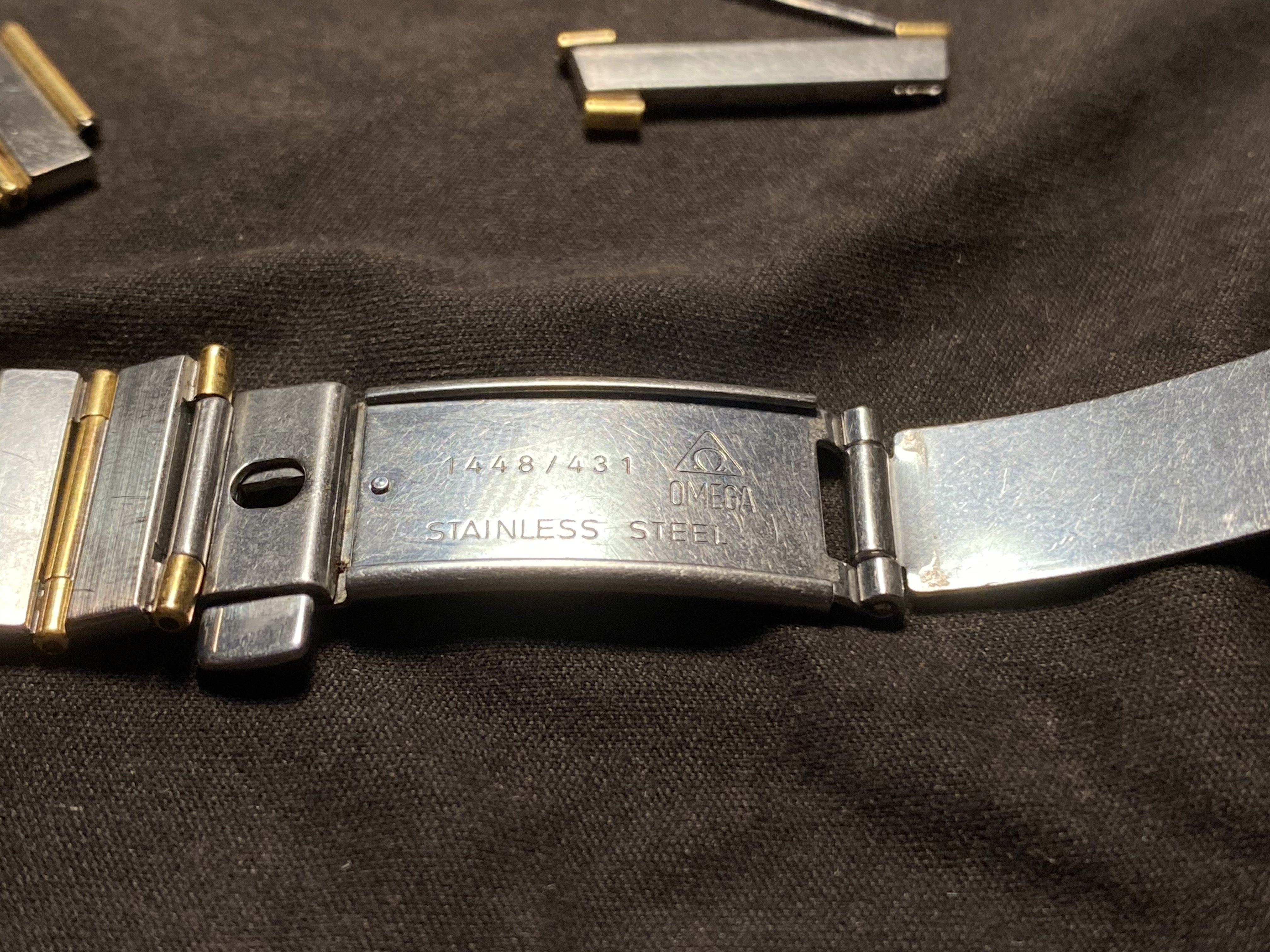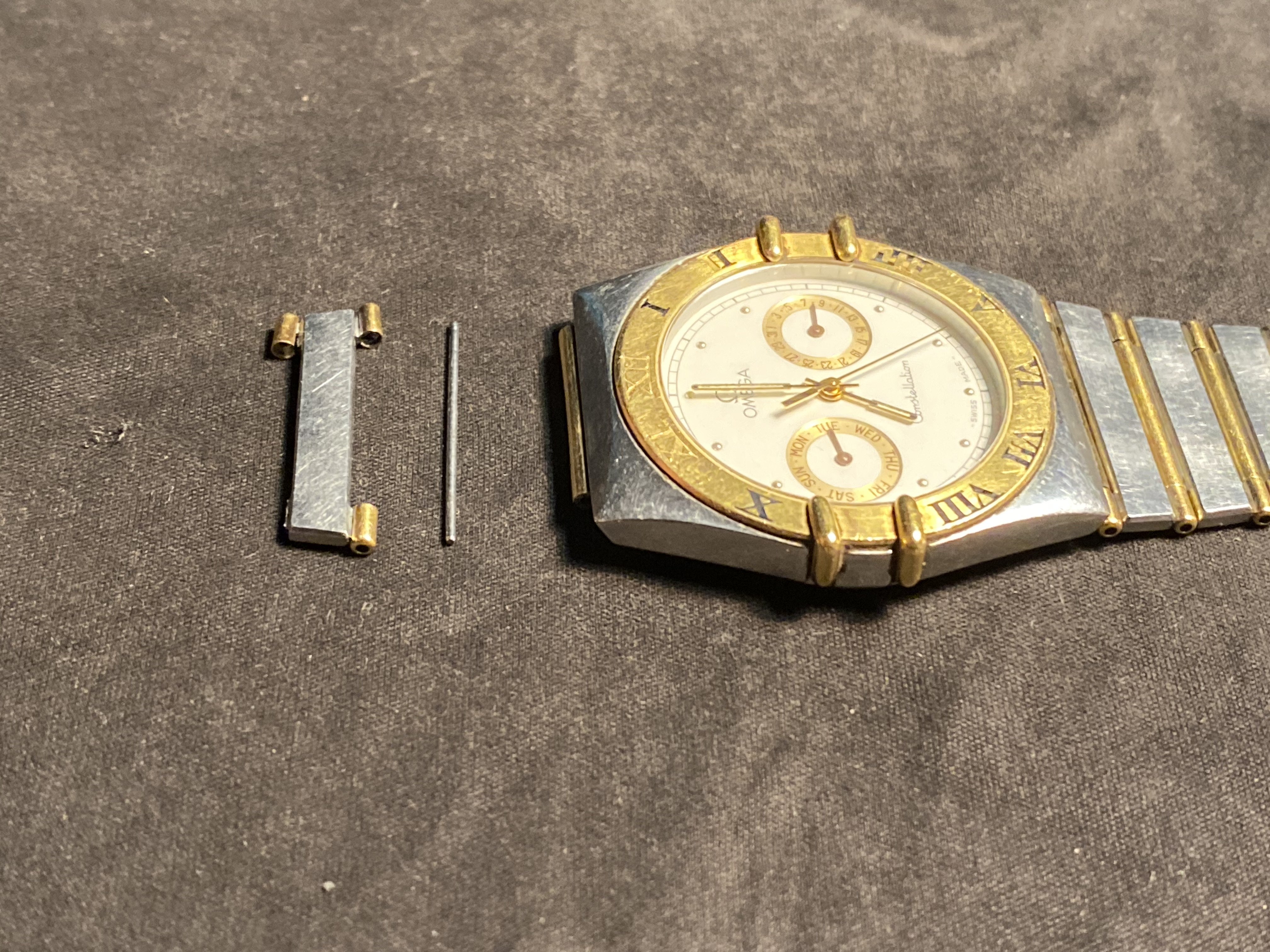The watch and bracelet are in good working shape, except for one of the case pivot links has a broken & lost end tube (visible in the pictures). I'd like to find a replacement for just that one link that attaches to the watch case, but all I've found online is for a complete (half bar) OEM bracelet, reproduction bracelets, and extension links. I've so far come up empty-handed after taking it to several authorized dealers and the local Omega Boutique. I'm hoping someone here can help.